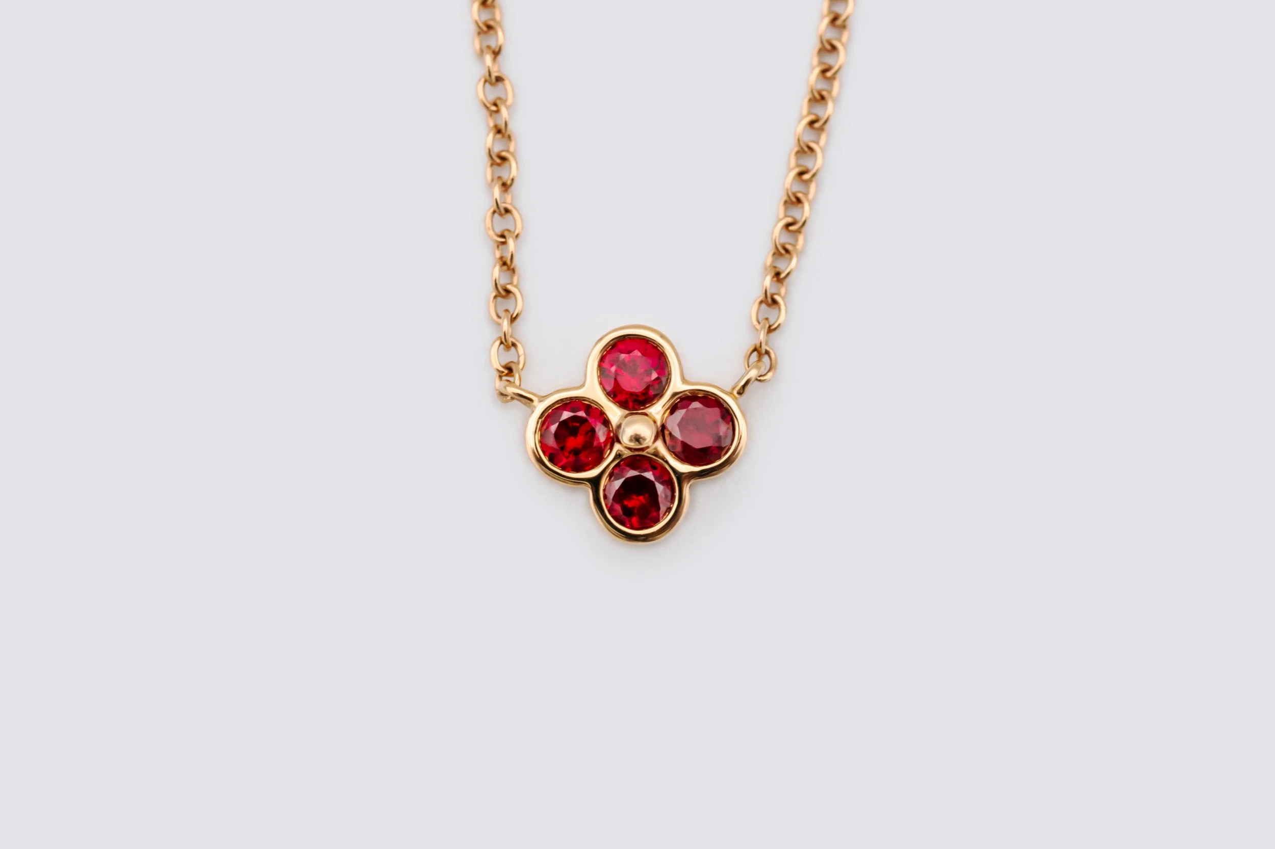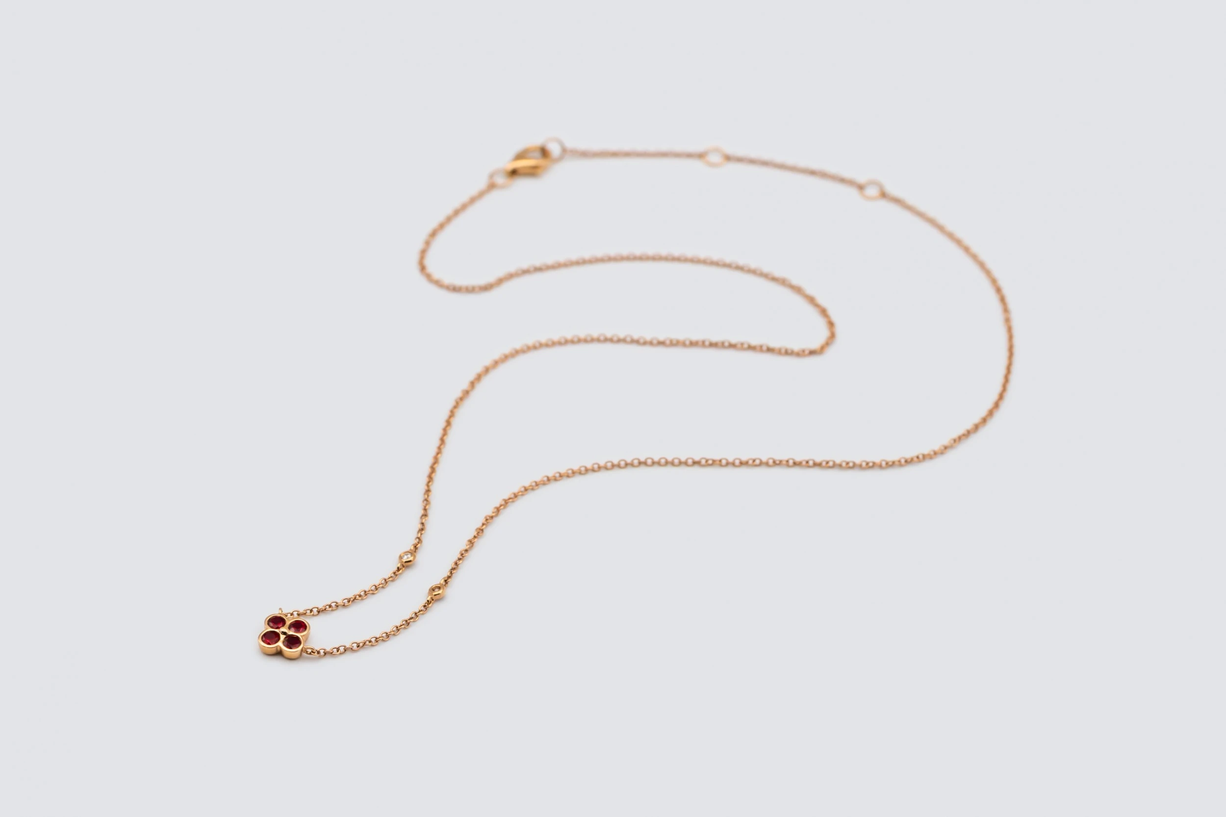 The rich red hue of the rubies is perfectly complemented by the gentle glow of rose gold, while the diamonds add refined brilliance for a balanced and sophisticated finish. With its symbolic clover shape, fine detailing, and modern craftsmanship, this necklace reflects the timeless luxury and contemporary design ethos of AMPM Luxury Goods.