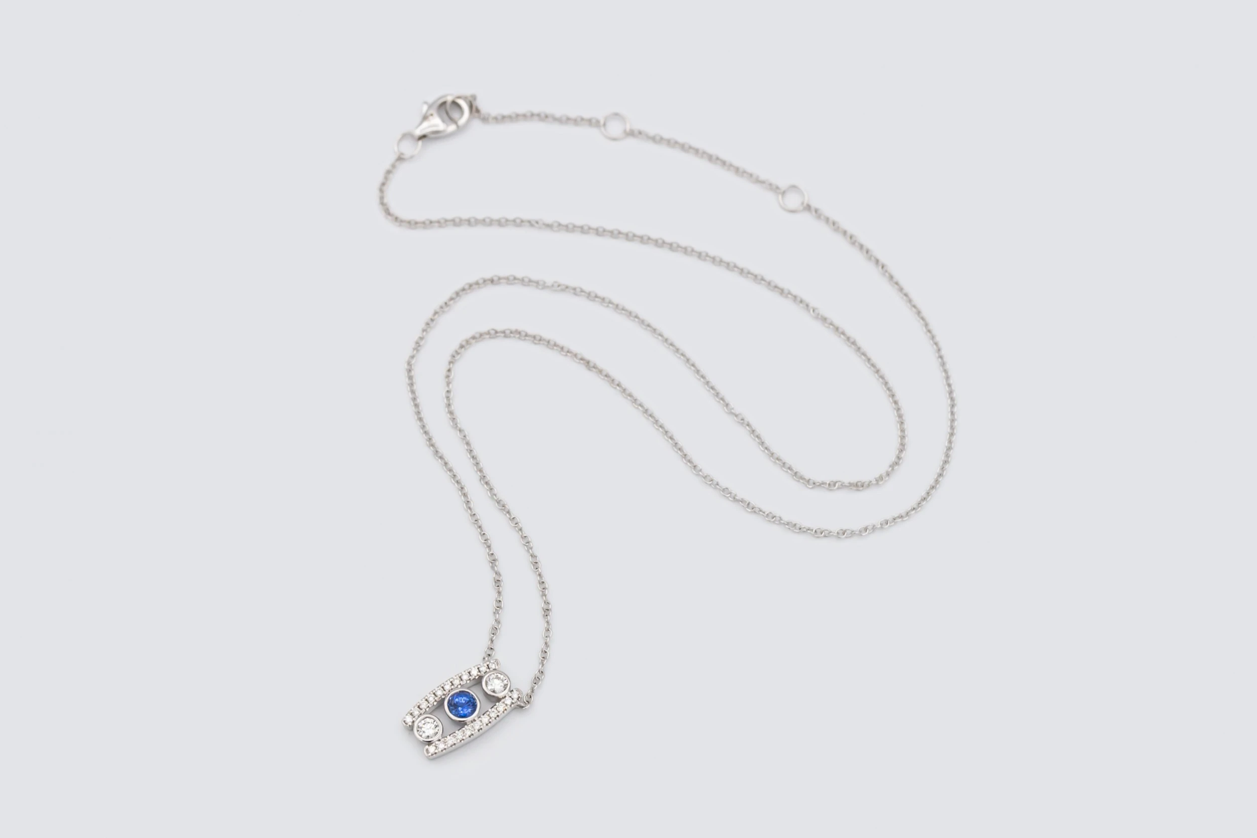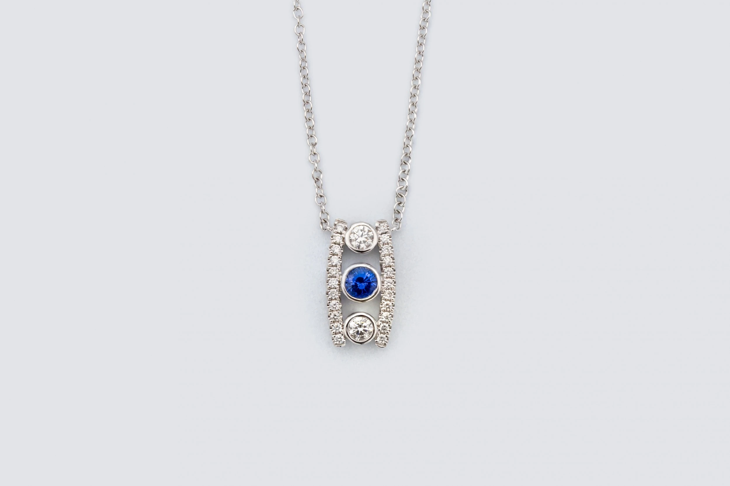 A refined and elegant design, this sapphire and diamond pendant necklace features natural brilliant round sapphires and diamonds, totalling 0.29ct, beautifully set in polished 18ct white gold. The vivid blue sapphires contrast gracefully with the bright sparkle of the diamonds, creating a luxurious and timeless gemstone combination.