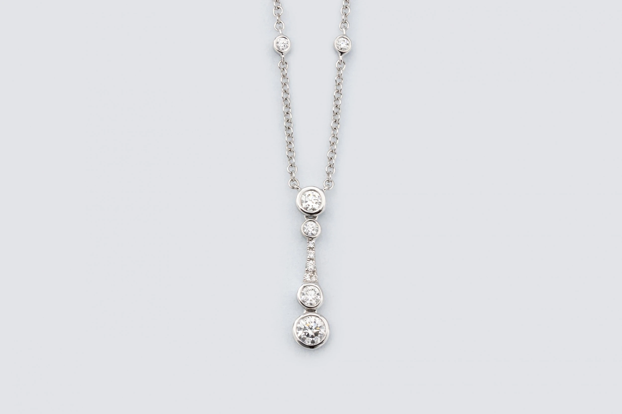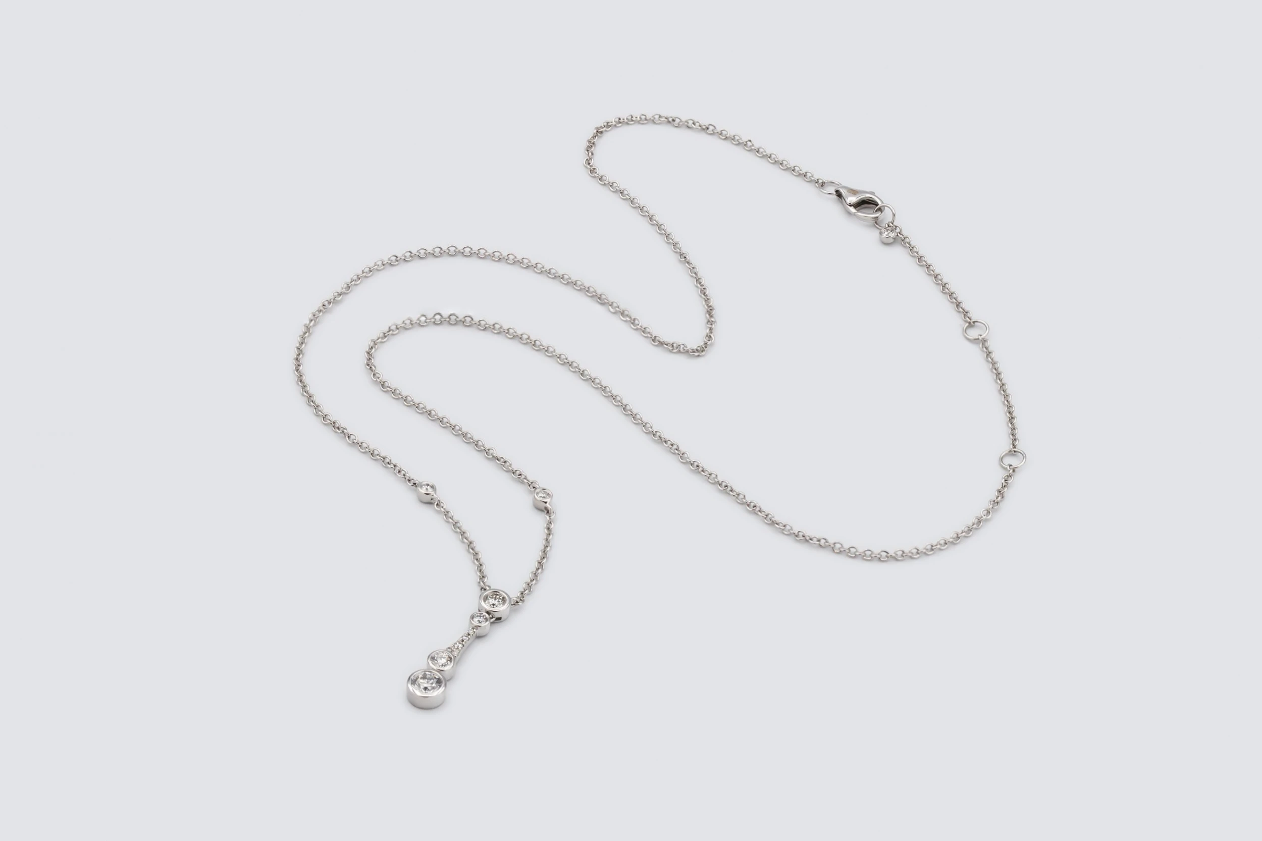 A refined and elegant design, this diamond drop necklace showcases 0.56ct of natural brilliant round diamonds, gracefully set in polished 18ct white gold. The drop-style pendant offers a sleek, elongated silhouette that catches the light beautifully, creating a luxurious sparkle with every movement.