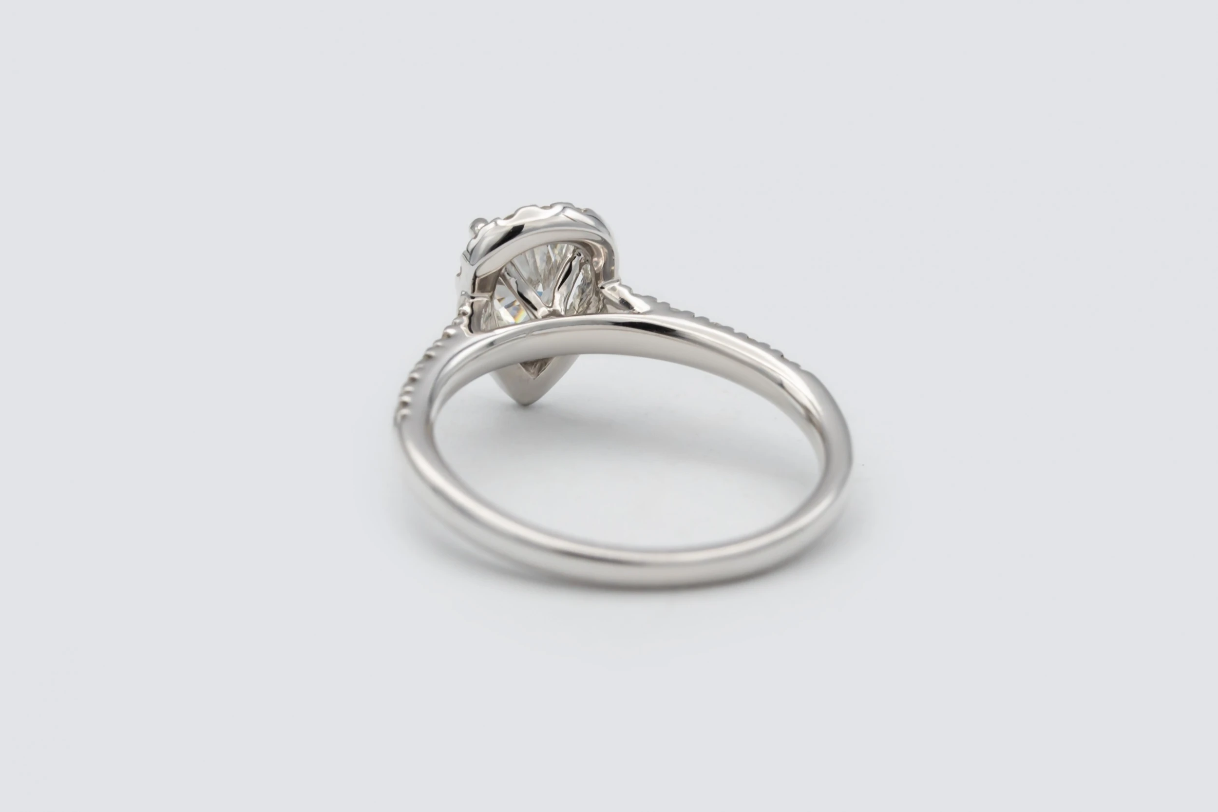 The pear cut centre stone offers a graceful teardrop silhouette, known for its flattering brilliance and timeless charm. The surrounding halo and tapered shoulders add depth, light, and refined detail, making this ring a perfect blend of modern luxury and classic romance — an exquisite example of the craftsmanship behind AMPM Luxury Goods.