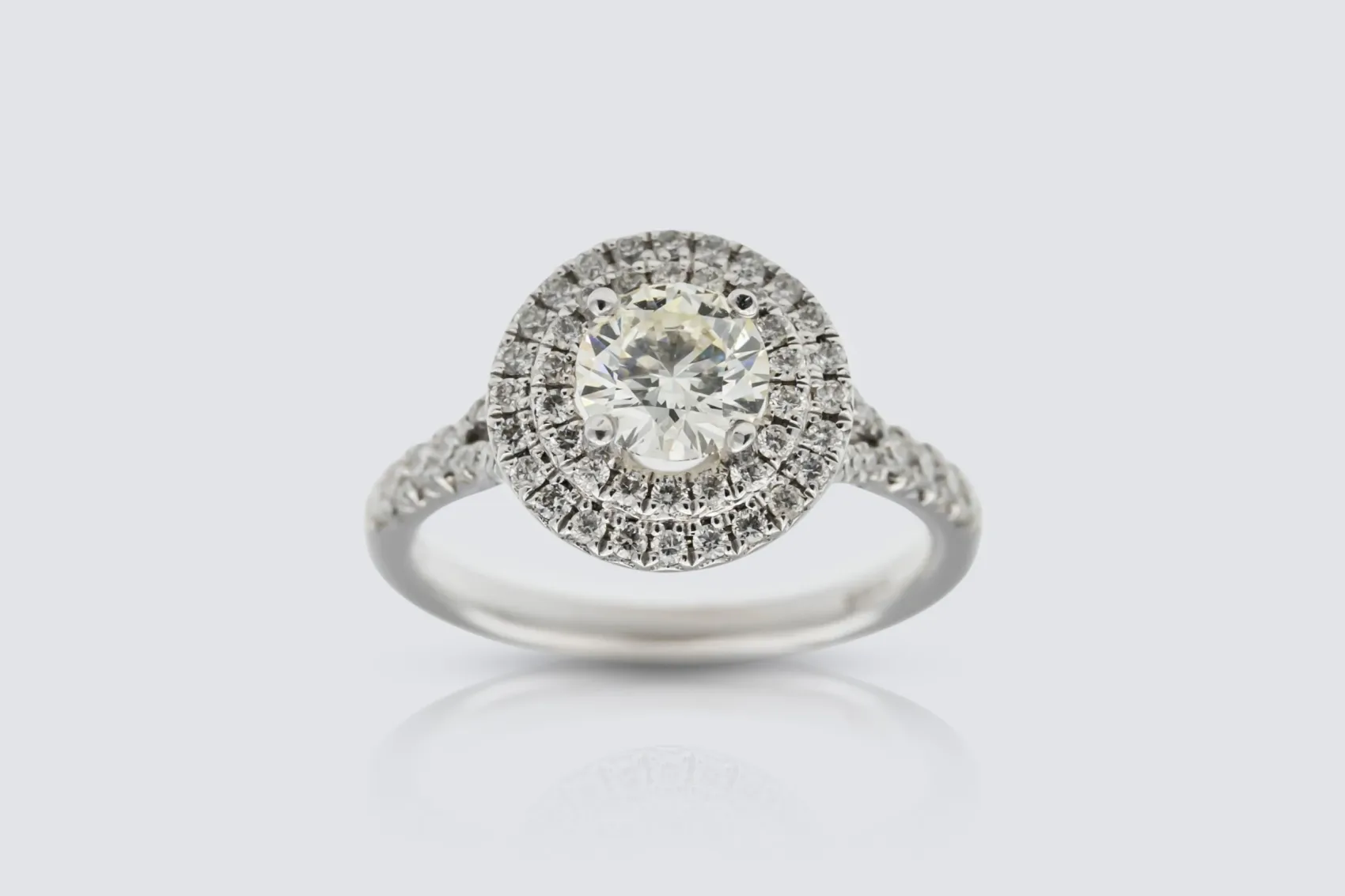 Balancing elegance and modernity, the halo design enhances the central diamond’s brilliance while adding dimension and depth. Perfect for engagements or special occasions, this piece exemplifies fine craftsmanship and refined sophistication, the signature of AMPM Luxury Goods.