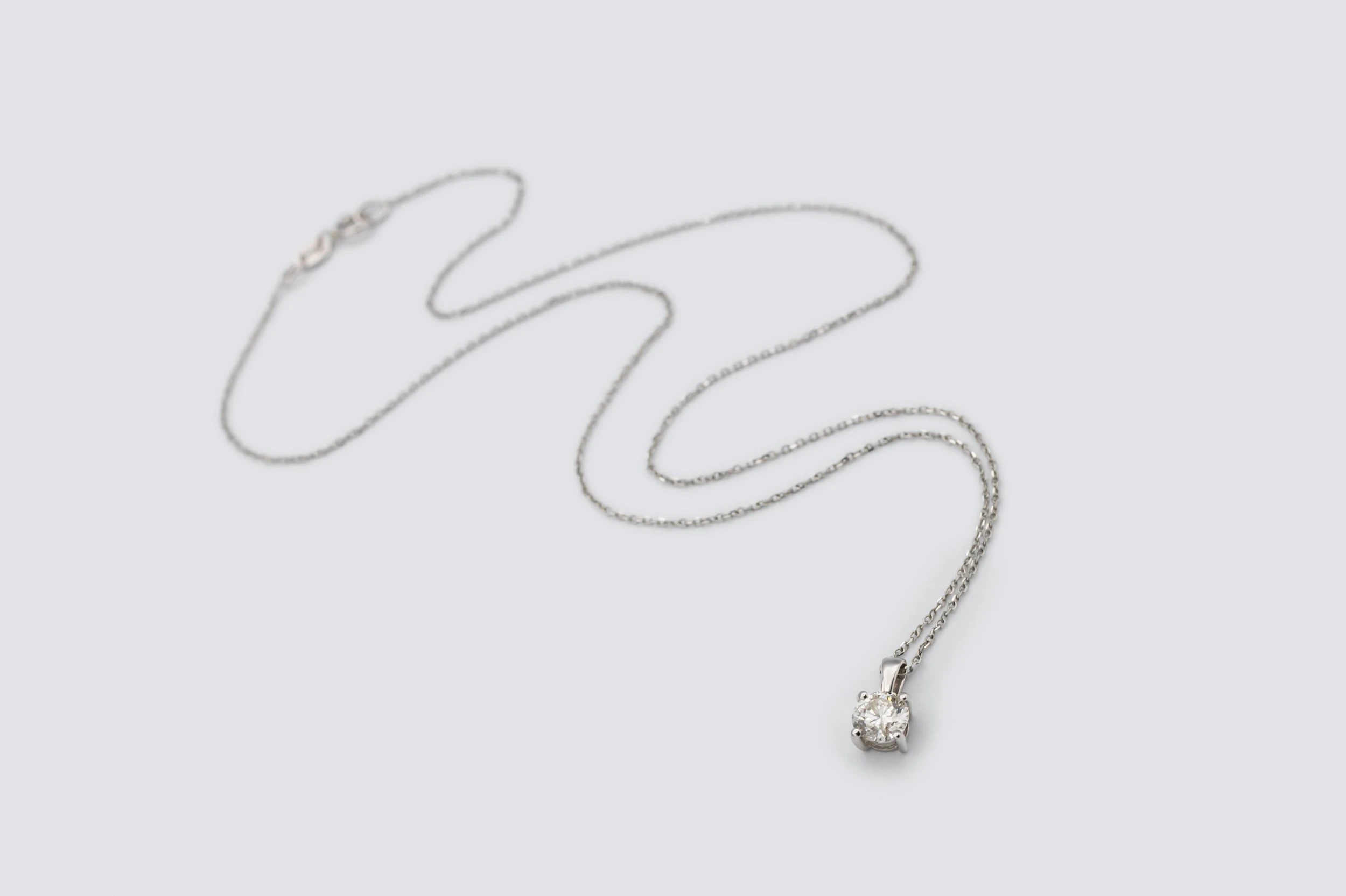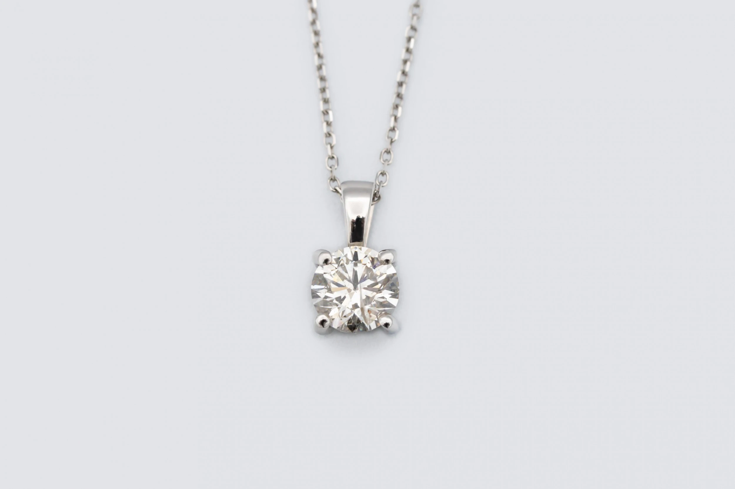 A refined and timeless piece, this diamond pendant necklace showcases a radiant 0.89ct natural brilliant round diamond, beautifully set in polished 18ct white gold and suspended from a delicate small cable link chain. The classic setting allows the diamond to take centre stage, offering crisp sparkle and elegant simplicity that suits both everyday wear and elevated occasions.