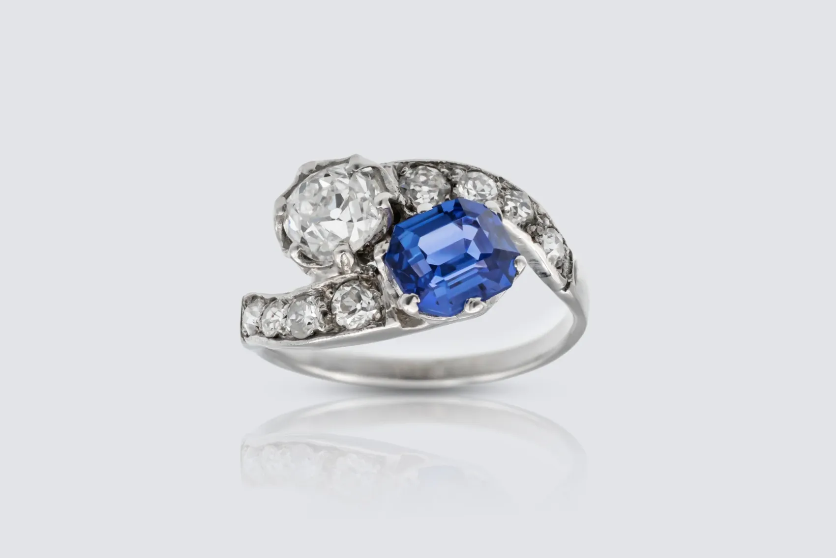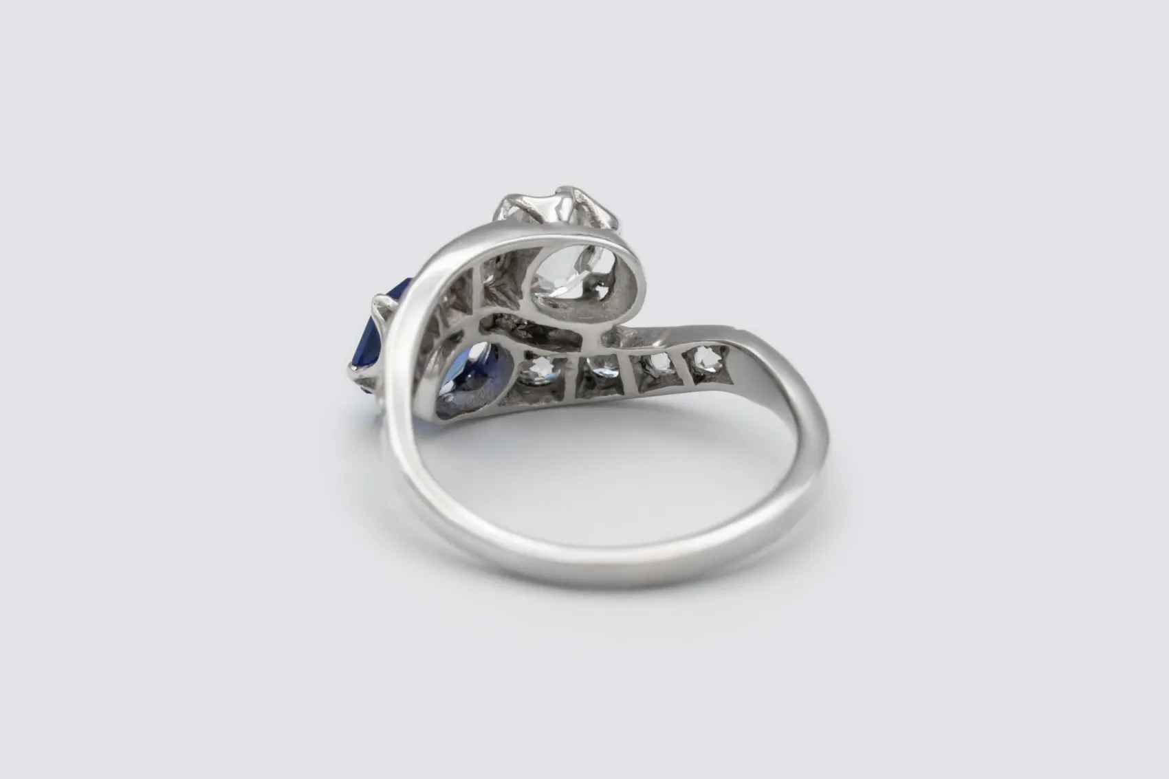 The elegant twist design symbolises unity and connection, with the two central stones representing partnership, harmony, and meaningful moments. The sapphire’s rich blue hue pairs beautifully with the bright brilliance of the diamonds, while the diamond shoulders add movement and refined luxury. Crafted with precision and sophistication, this piece embodies the contemporary artistry and fine craftsmanship of AMPM Luxury Goods.