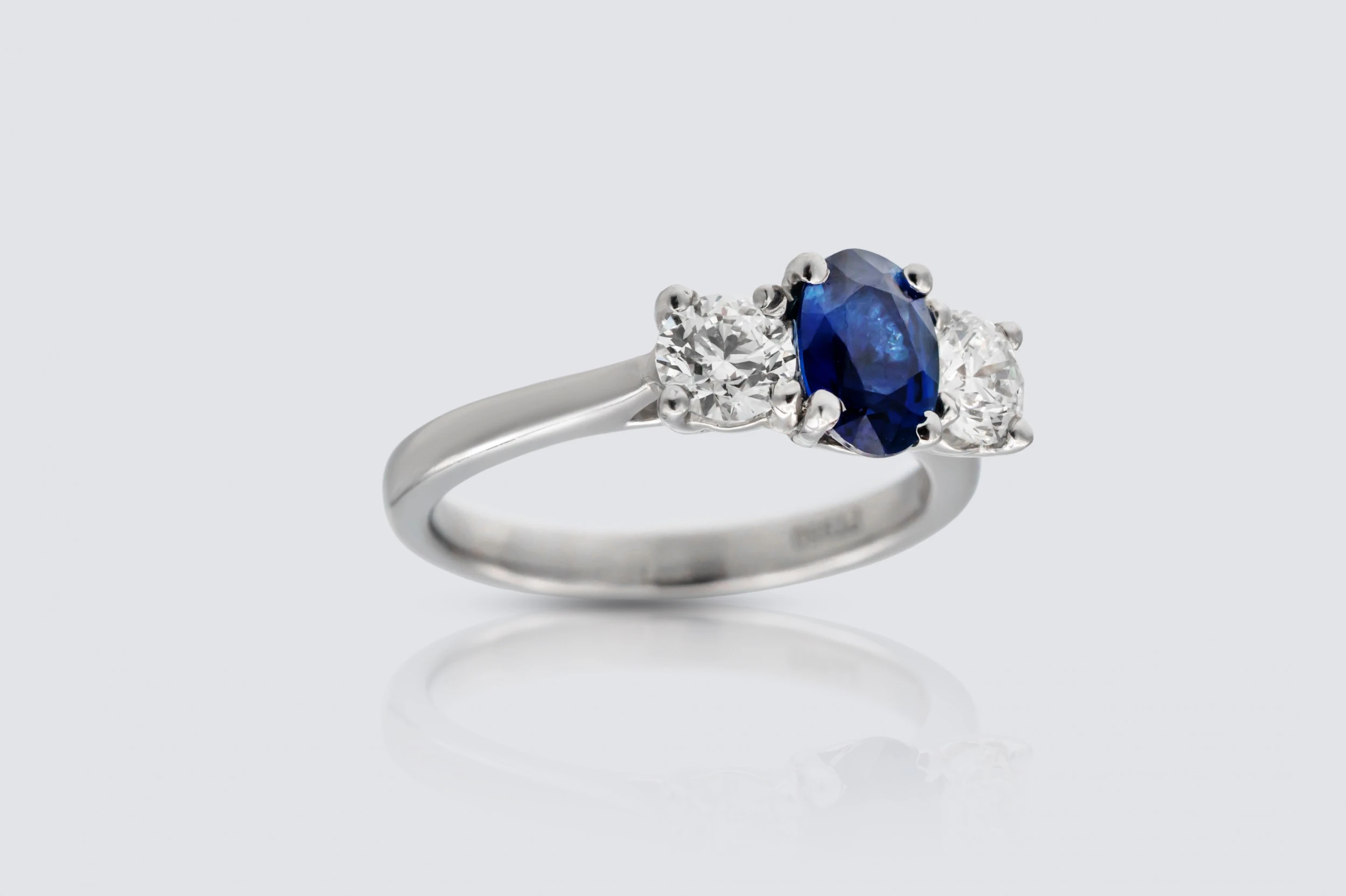 A refined and elegant design, this three stone sapphire and diamond ring features a vivid 1.05ct natural oval sapphire paired with 0.72ct of natural brilliant round diamonds, all beautifully prong set in polished 18ct white gold. The rich blue sapphire forms the focal point of the piece, while the bright diamonds on either side create perfect balance, symmetry, and added brilliance.