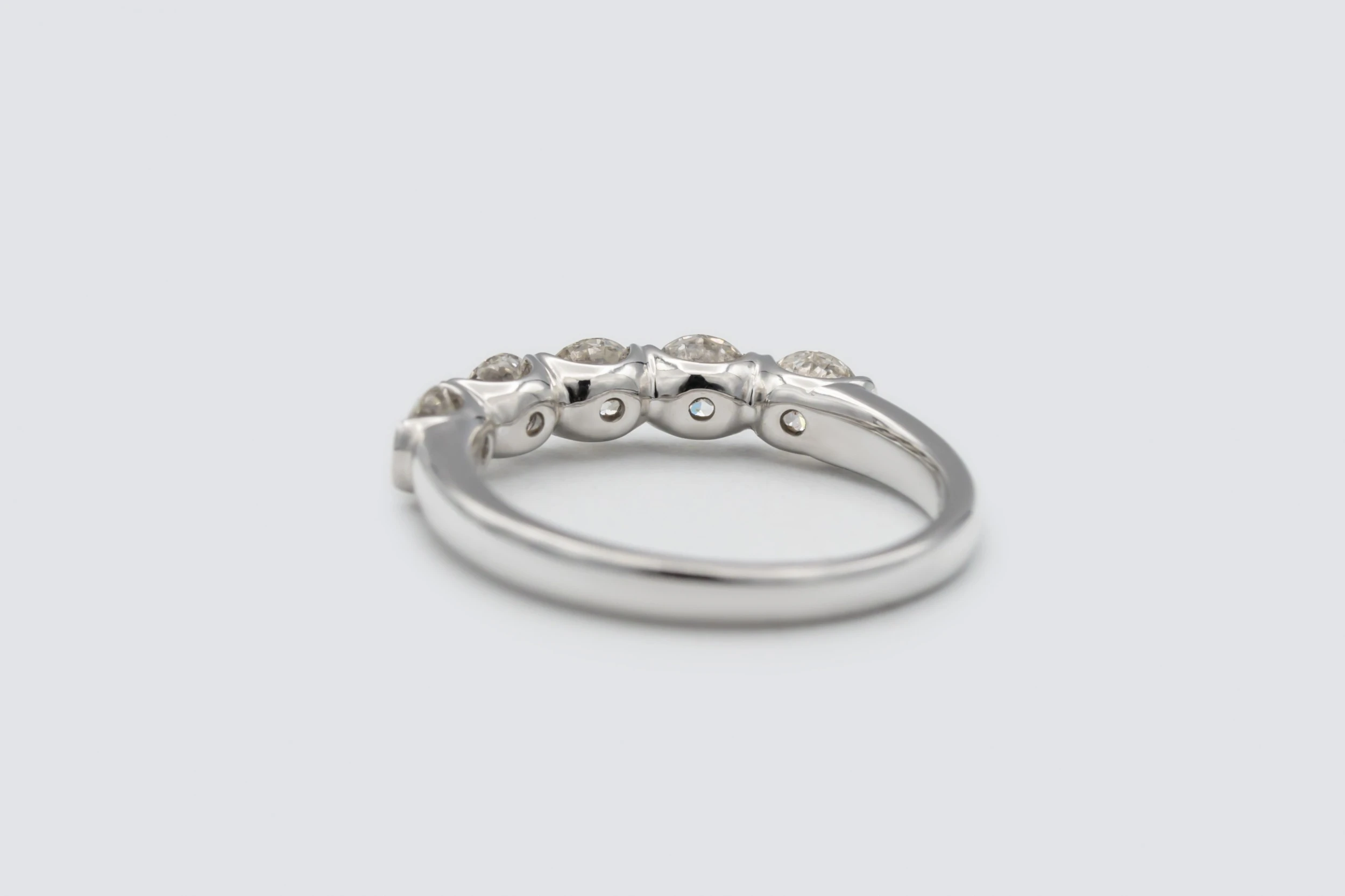 An elegant symbol of enduring love, this five stone diamond wedding band features natural brilliant cut diamonds totalling 1.22ct, graded F colour and SI2 clarity. Each diamond is beautifully pressure set in polished 18ct white gold, allowing maximum brilliance while maintaining a sleek, seamless silhouette.