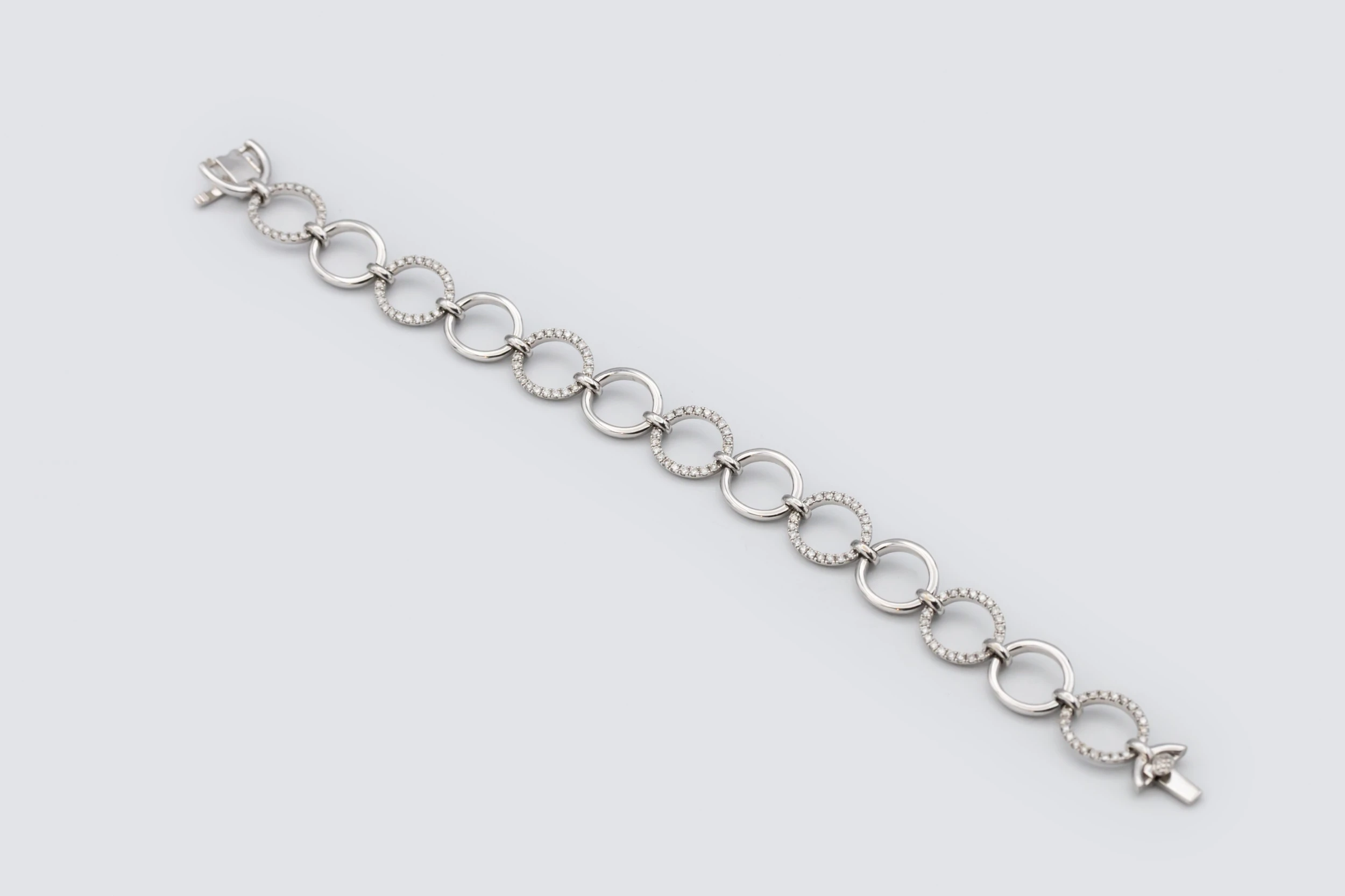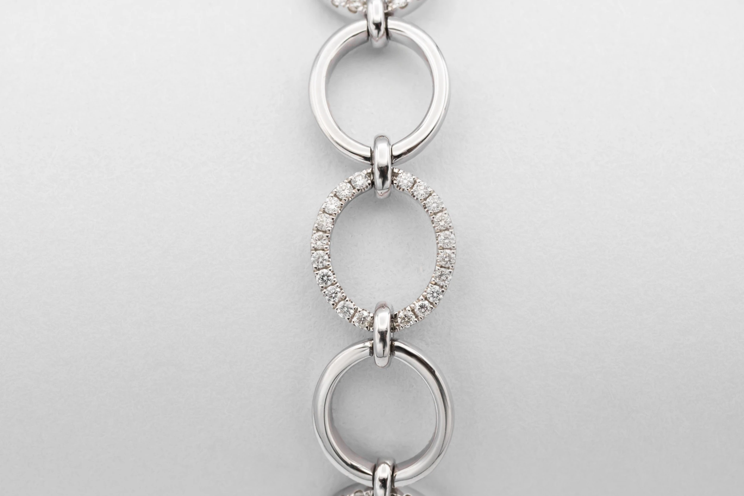 A modern and elegant design, this diamond circle bracelet features 1.34ct of natural brilliant round diamonds, all beautifully prong set in polished 18ct white gold. The repeating circle motif creates a refined, contemporary aesthetic, offering fluid movement and radiant sparkle across the wrist.