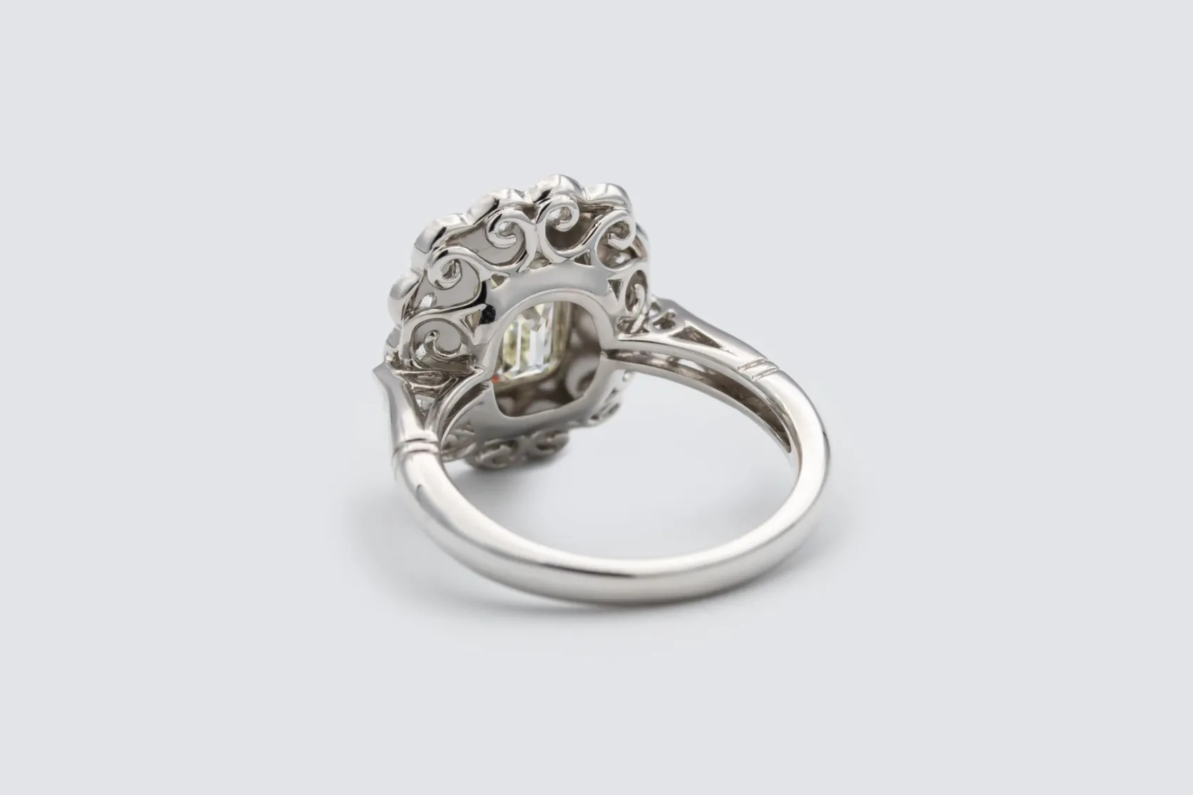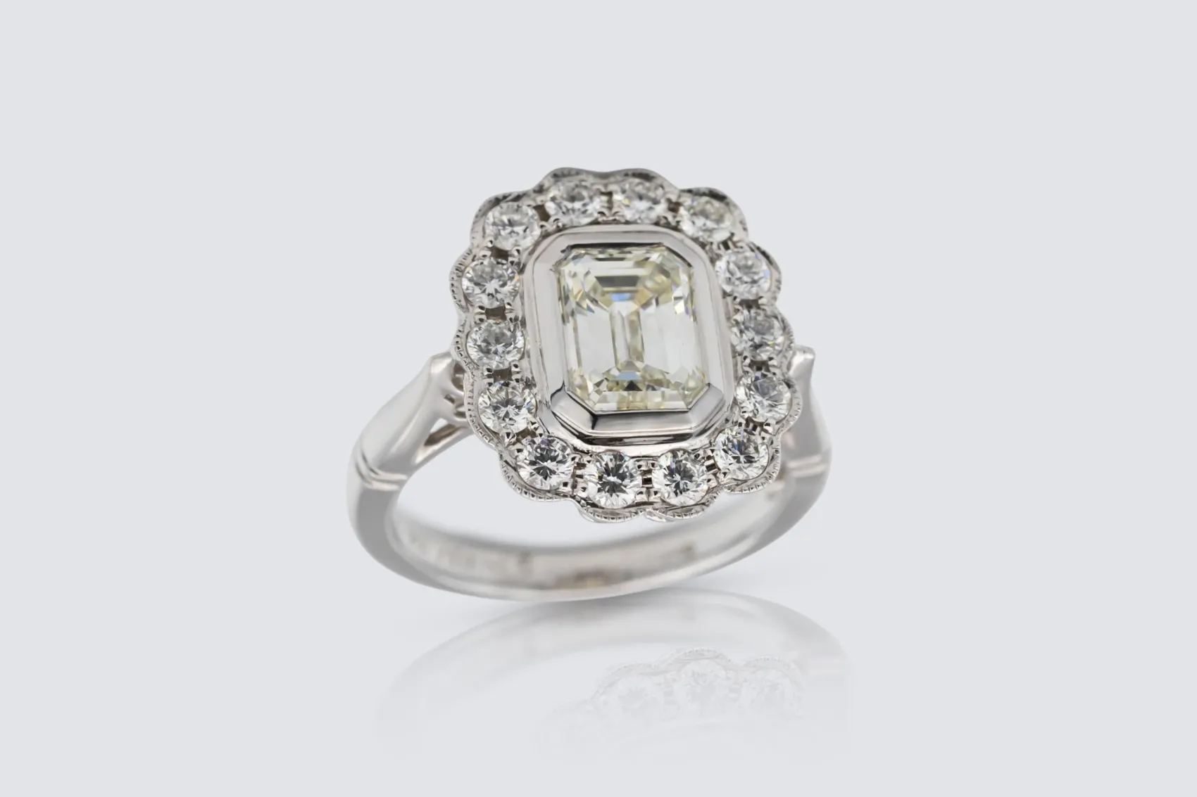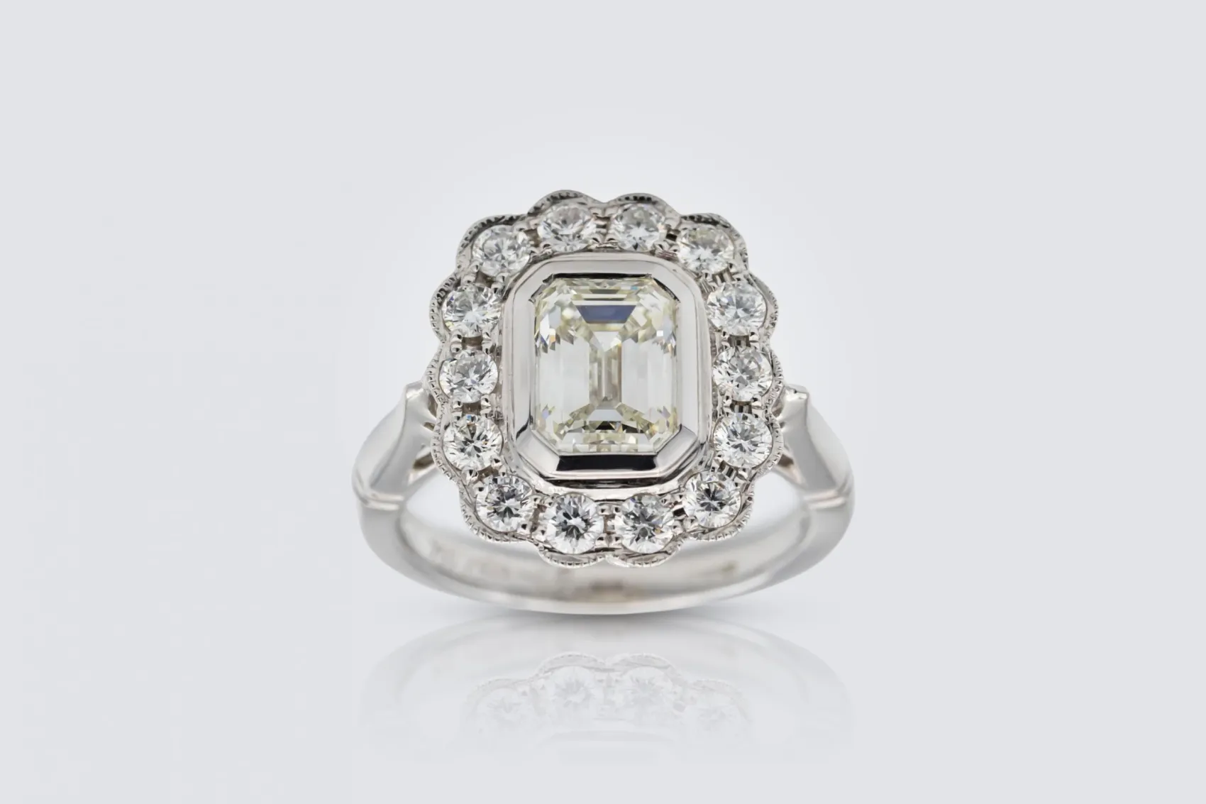 A captivating expression of colour and brilliance, this rubover set halo ring features a striking 1.50ct emerald cut natural emerald as its centrepiece, framed by a radiant halo of brilliant cut natural diamonds totalling 0.65ct. Crafted in polished 18ct white gold, the design pairs the vivid green of emerald with the refined sparkle of diamond to create a look that is both timeless and contemporary.