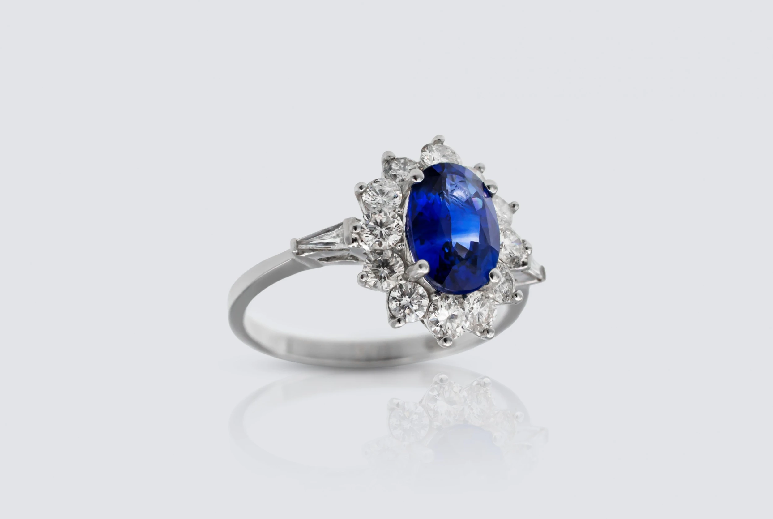 A luxurious and captivating design, this sapphire and diamond cluster ring features a vivid 1.75ct natural oval sapphire surrounded by 1.00ct of natural brilliant round diamonds, all meticulously prong set in polished 18ct white gold. The rich blue sapphire forms a striking centrepiece, while the surrounding diamonds create a radiant, high-impact halo that enhances the depth, colour, and brilliance of the ring.