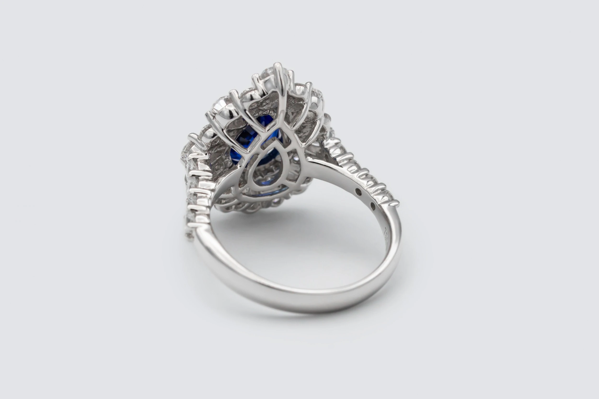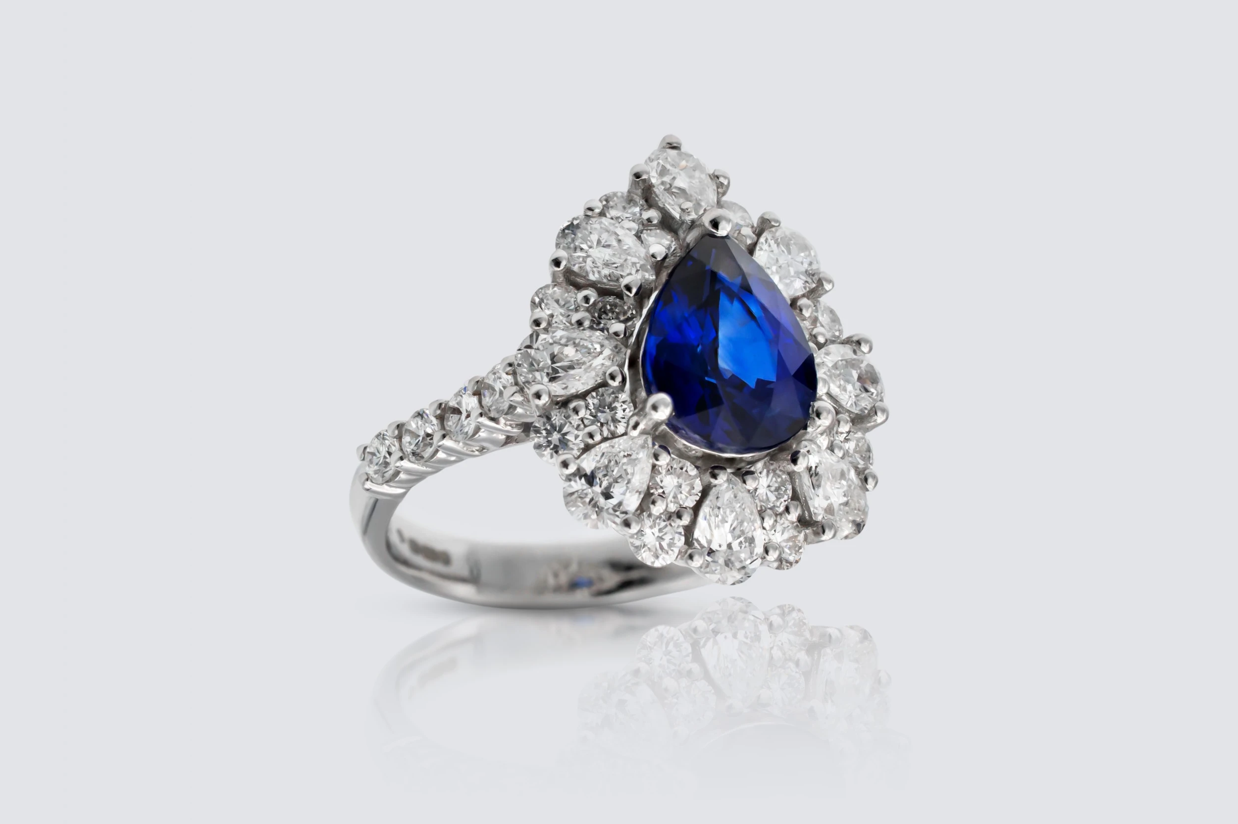 A bold and luxurious statement piece, this sapphire and diamond cluster ring features a breathtaking 2.17ct natural pear cut sapphire surrounded by an impressive 2.03ct of natural brilliant round diamonds, all meticulously prong set in polished 18ct white gold.