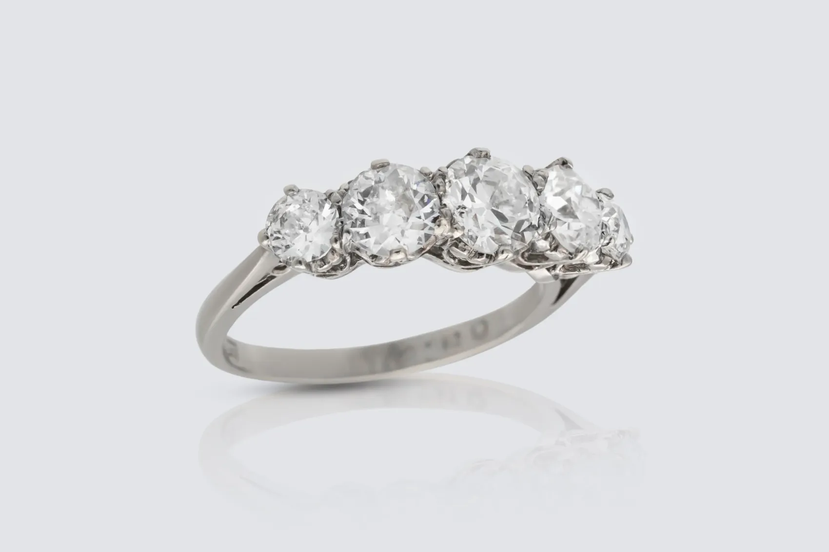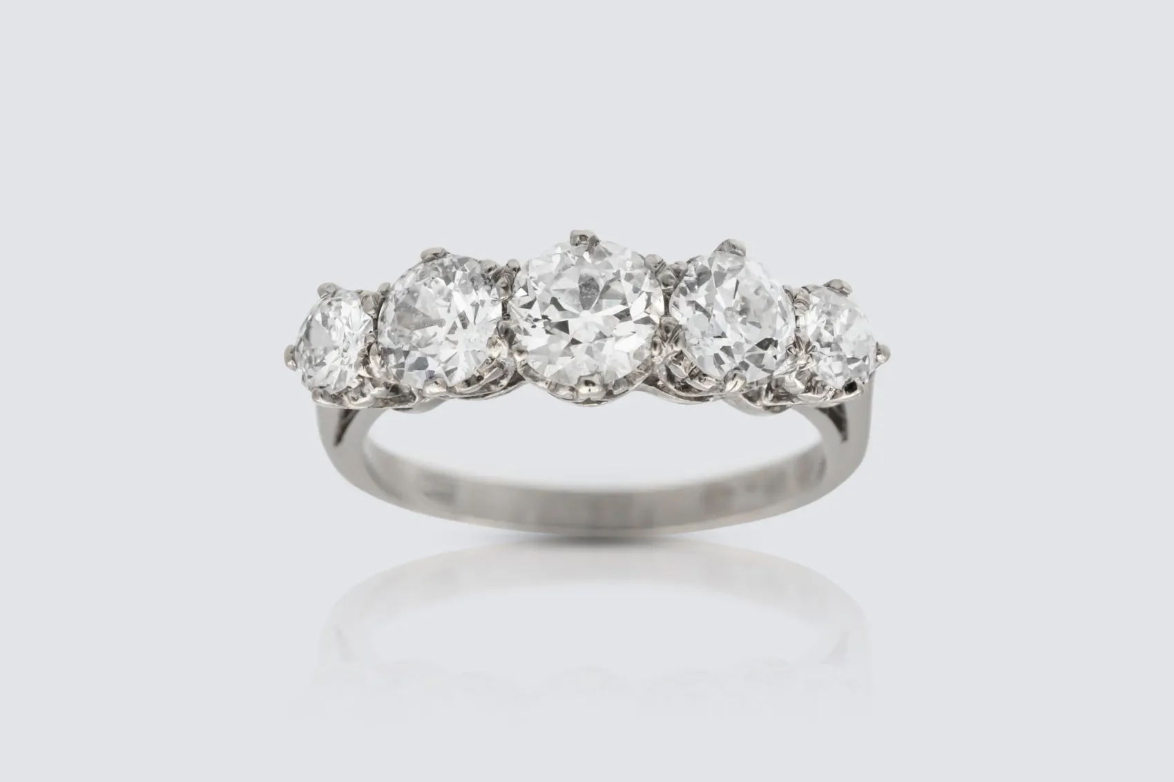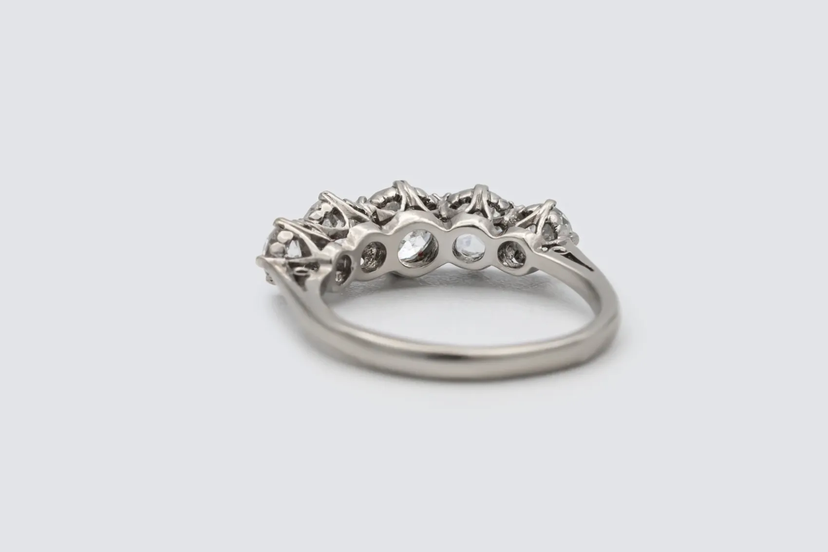 A timeless and radiant design, this graduated five stone diamond ring features 2.20ct of natural brilliant round diamonds, graded G colour with SI2 clarity, all beautifully prong set in polished 18ct white gold. Each diamond increases in size toward the centre, creating a seamless flow of brilliance and a refined, balanced silhouette across the finger.