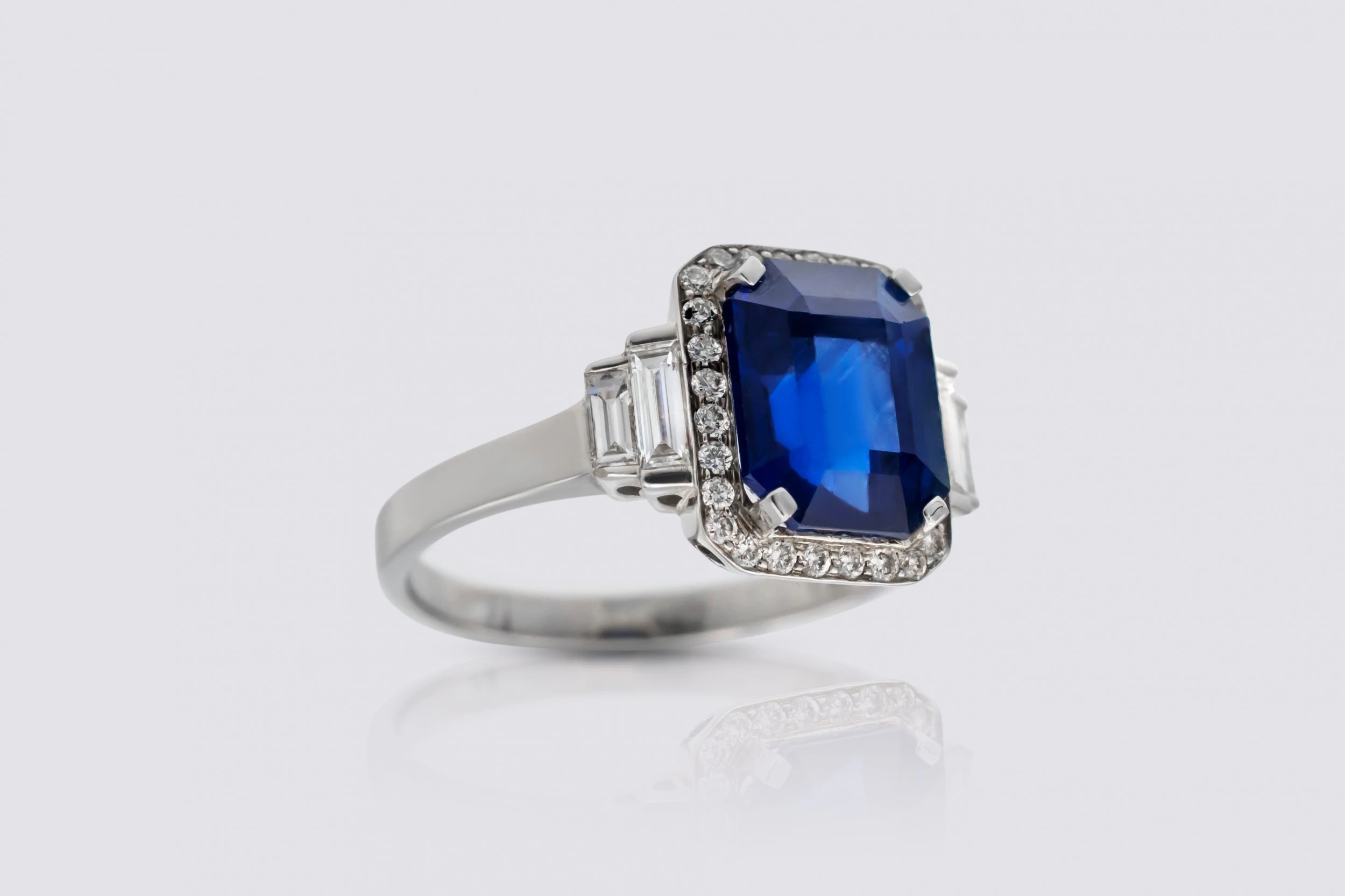A bold and luxurious design, this sapphire and diamond halo ring features a striking 2.30ct natural emerald cut sapphire, paired with a shimmering 0.60ct halo of natural brilliant cut diamonds. The sapphire’s deep blue hue and crisp geometric facets are beautifully framed by the diamonds, all expertly prong set in polished 18ct white gold.
