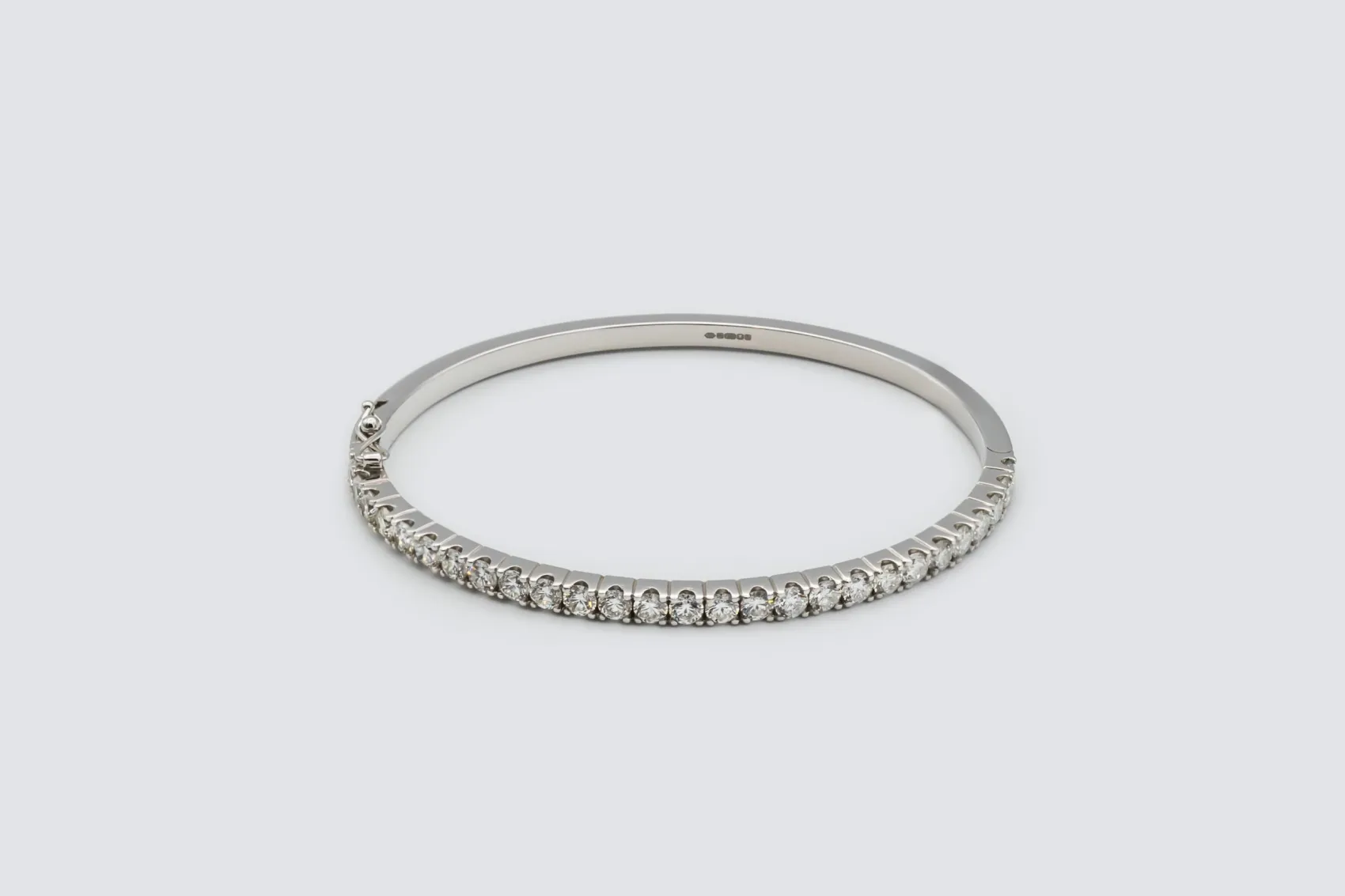 At 7 inches, the bangle provides a comfortable and classic fit ideal for both everyday wear and elevated occasions. With its bright white gold finish, exceptional diamond fire, and premium craftsmanship, this piece reflects the refined luxury and contemporary elegance at the heart of AMPM Luxury Goods.