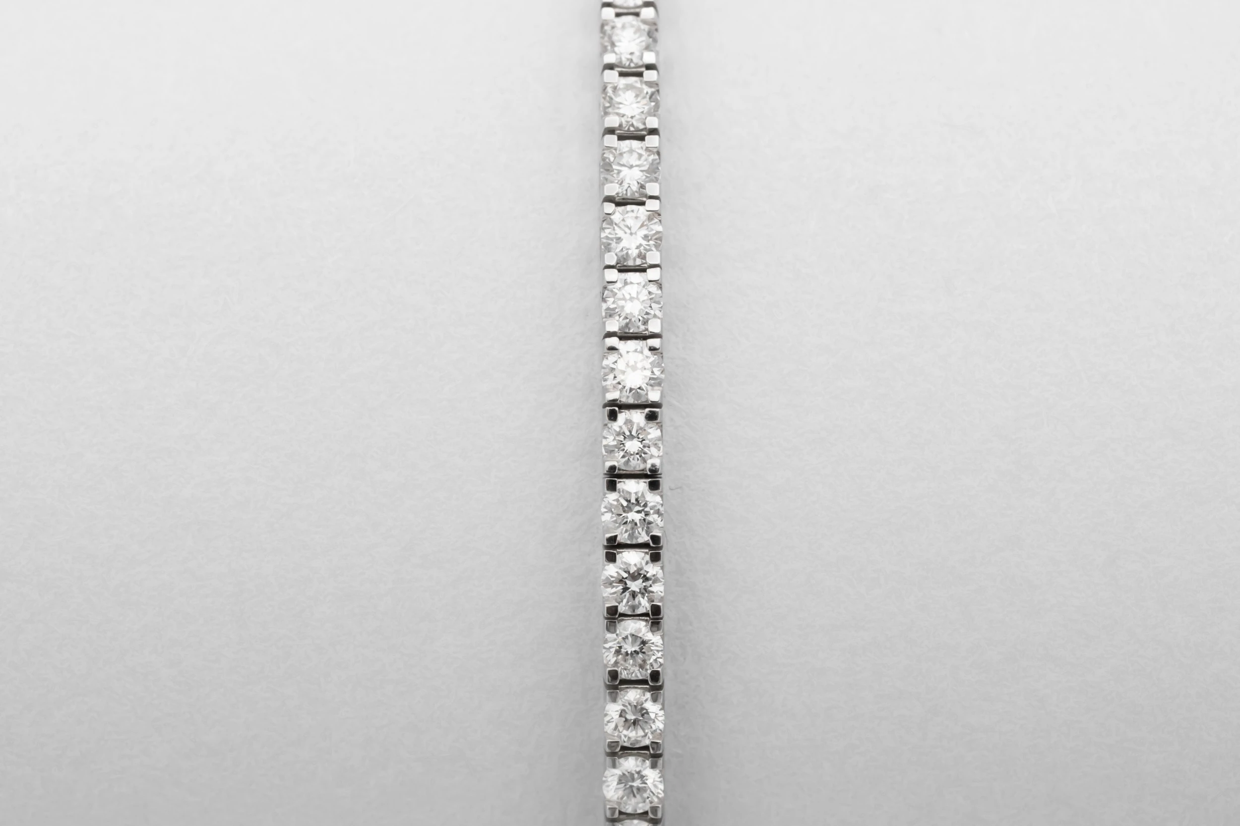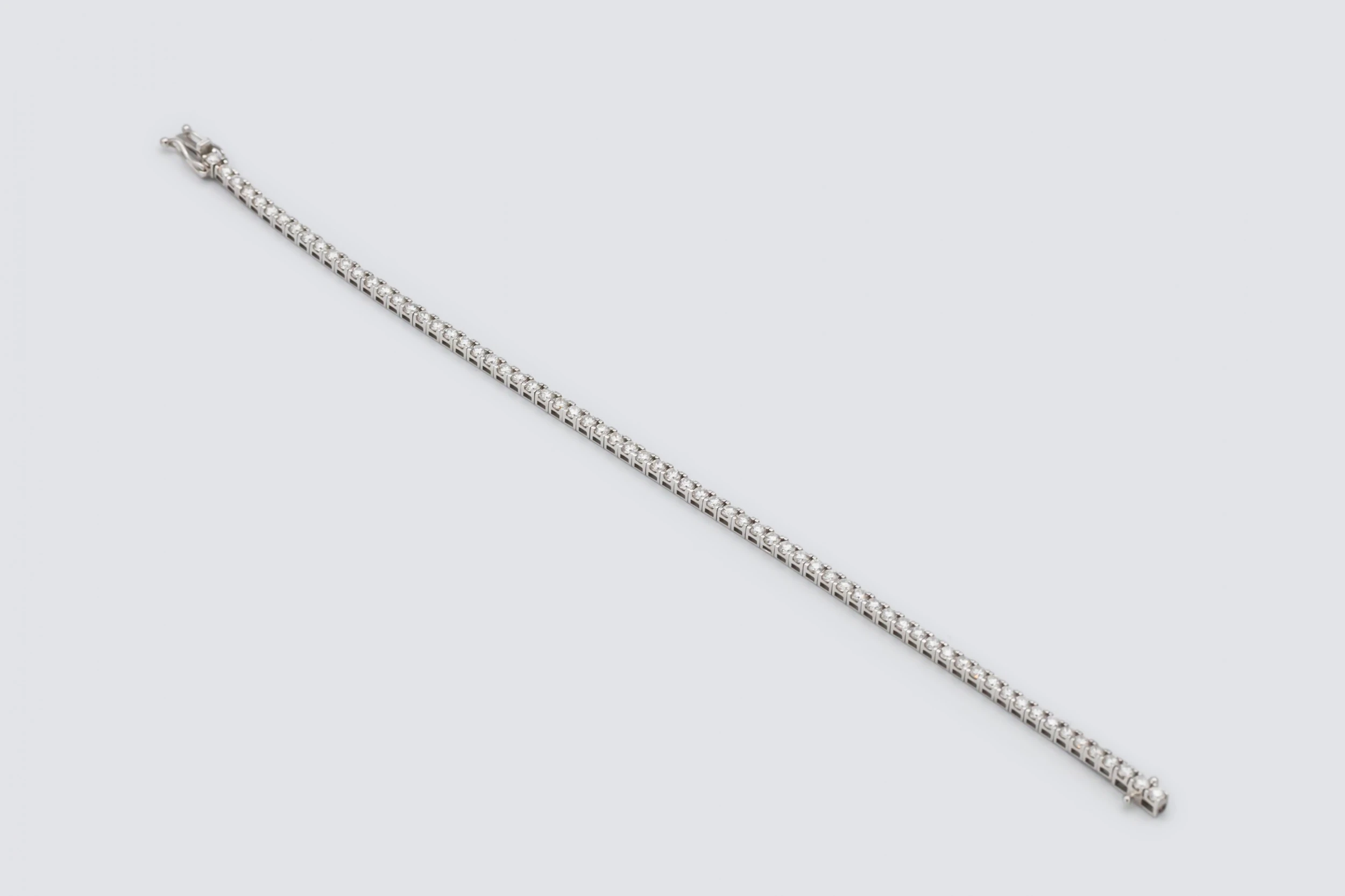 A timeless classic, this diamond tennis bracelet features 3.50ct of natural brilliant round diamonds, each expertly prong set in polished 18ct white gold. The uniform line of diamonds delivers exceptional sparkle and fluidity, creating an elegant bracelet that drapes beautifully around the wrist with continuous brilliance.
