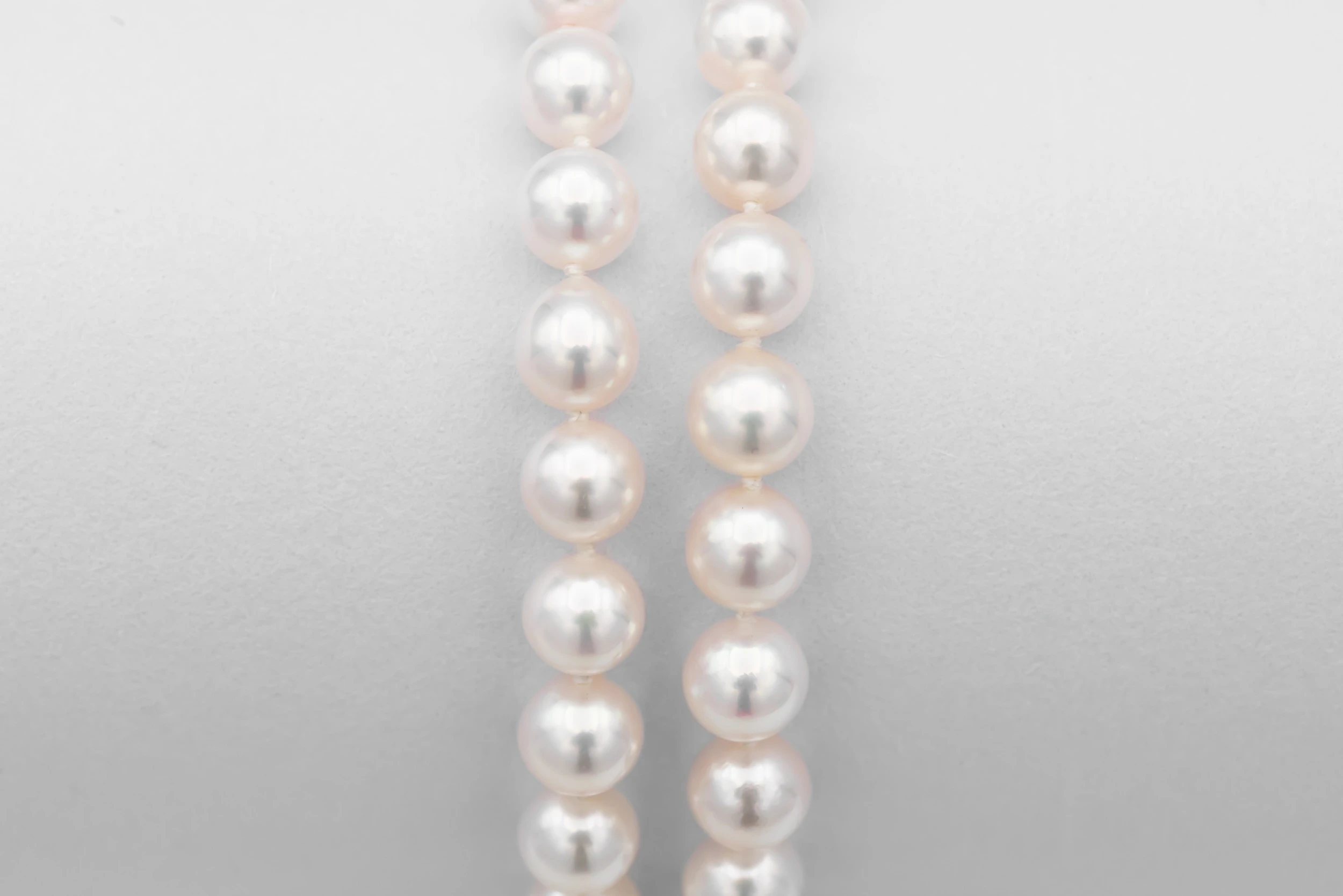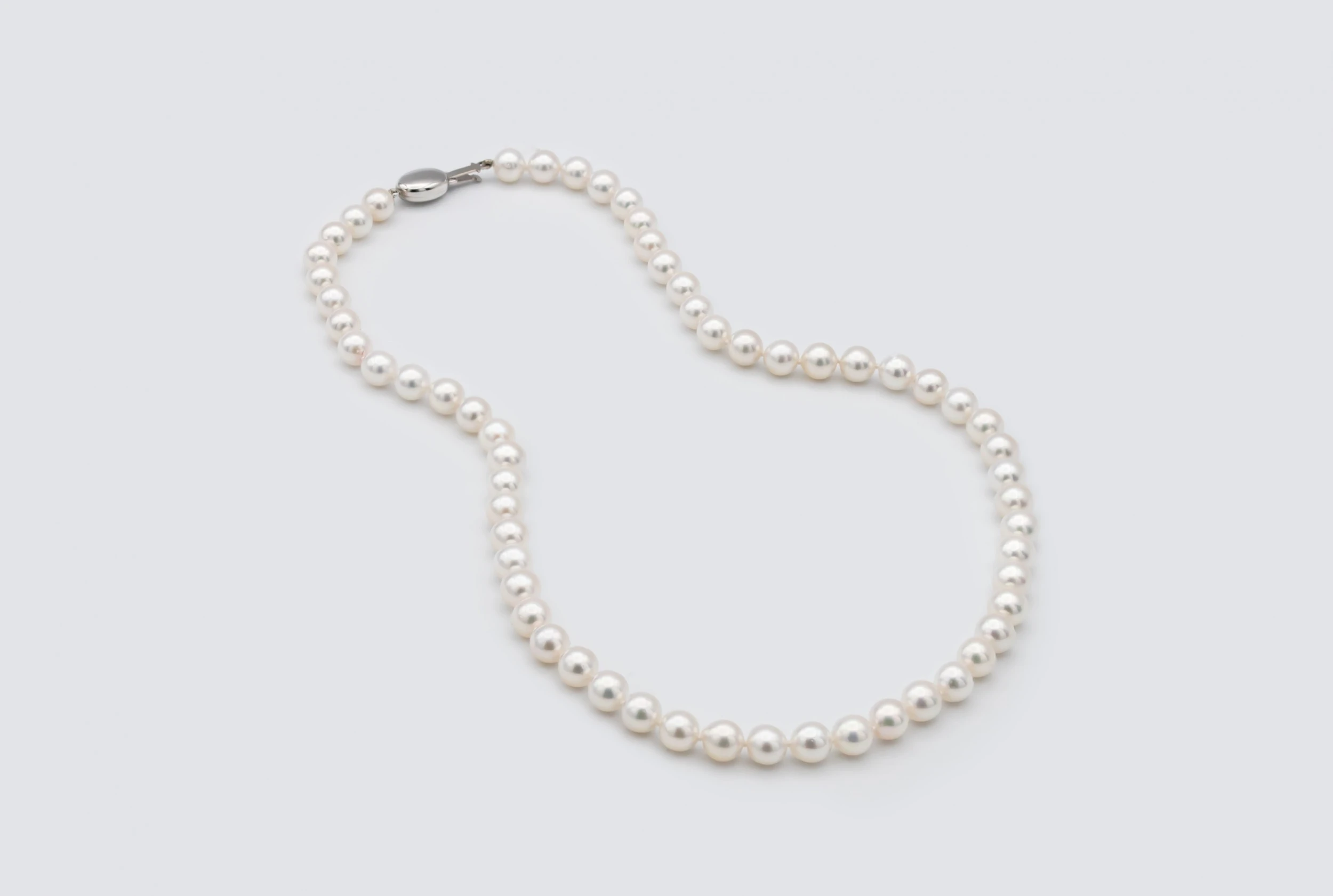 A refined and timeless classic, this Akoya pearl necklace features beautifully matched 5.5mm natural Akoya pearls with exceptional lustre and symmetry, elegantly finished with a polished 18ct white gold clasp. Measuring 16 inches, it sits gracefully along the collarbone, offering a delicate and sophisticated silhouette ideal for both everyday elegance and formal occasions.