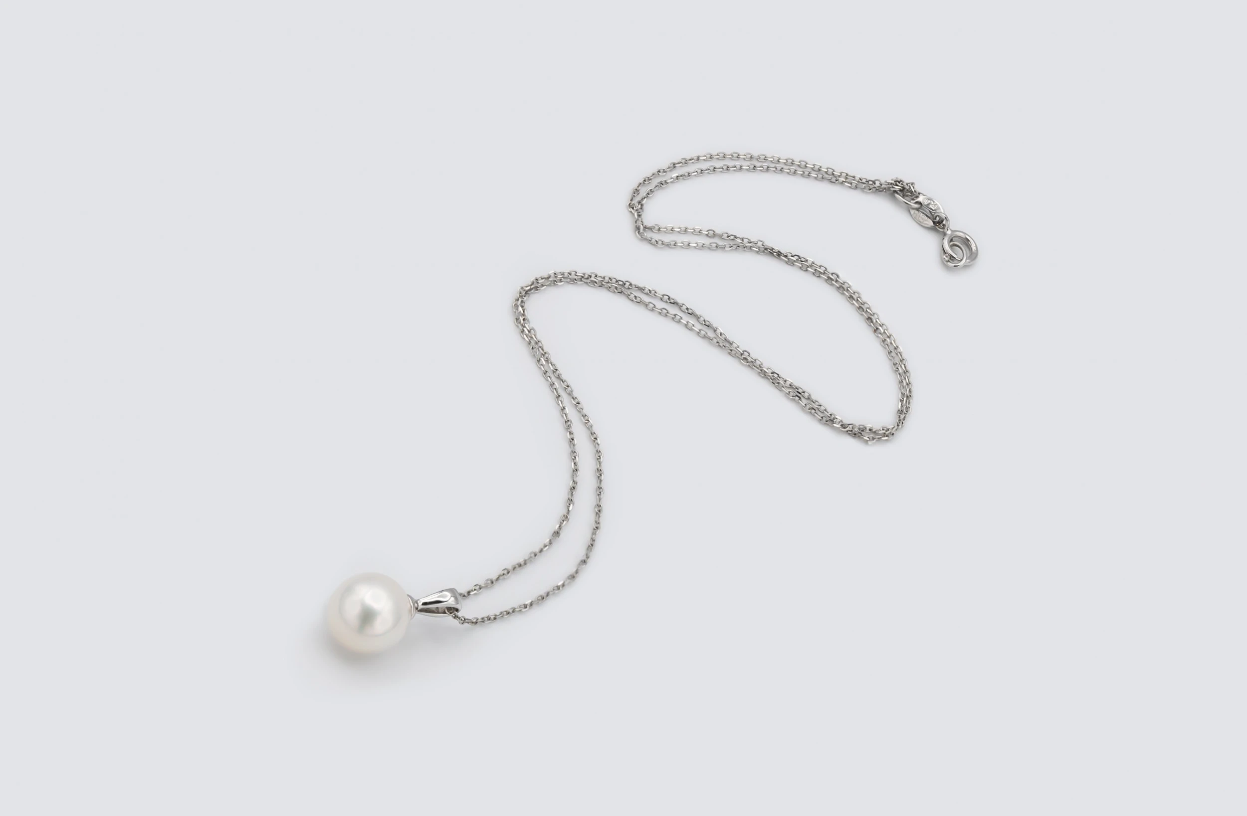A refined and timeless piece, this Akoya pearl pendant necklace features a luminous 9mm natural Akoya pearl, elegantly mounted in polished 18ct white gold and suspended from a delicate 17-inch small cable link chain. The cool brilliance of the white gold enhances the pearl’s natural lustre, offering a clean and sophisticated look that sits beautifully along the neckline.