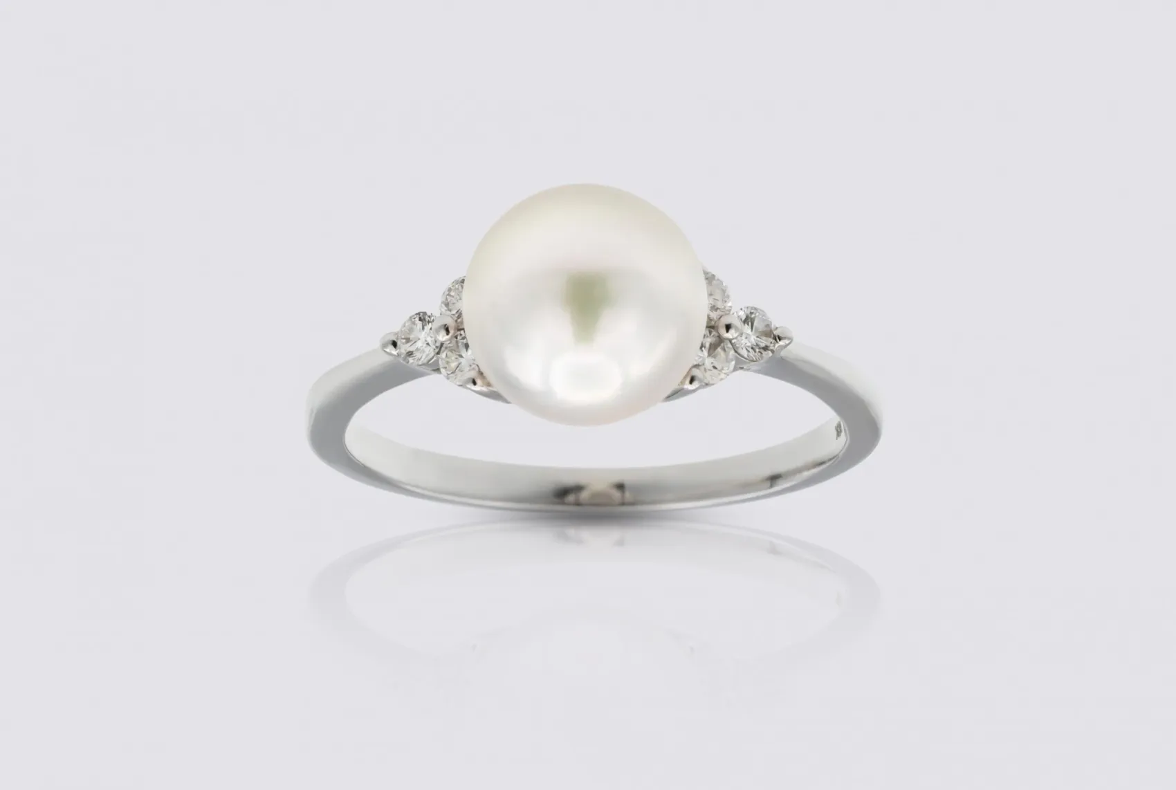 A refined and elegant design, this Akoya pearl and diamond ring features a luminous Akoya pearl paired with a sparkling 0.15ct natural brilliant round diamonds, beautifully prong set in polished 18ct white gold. The diamond’s crisp brilliance enhances the pearl’s soft, radiant lustre, creating a timeless and sophisticated contrast.