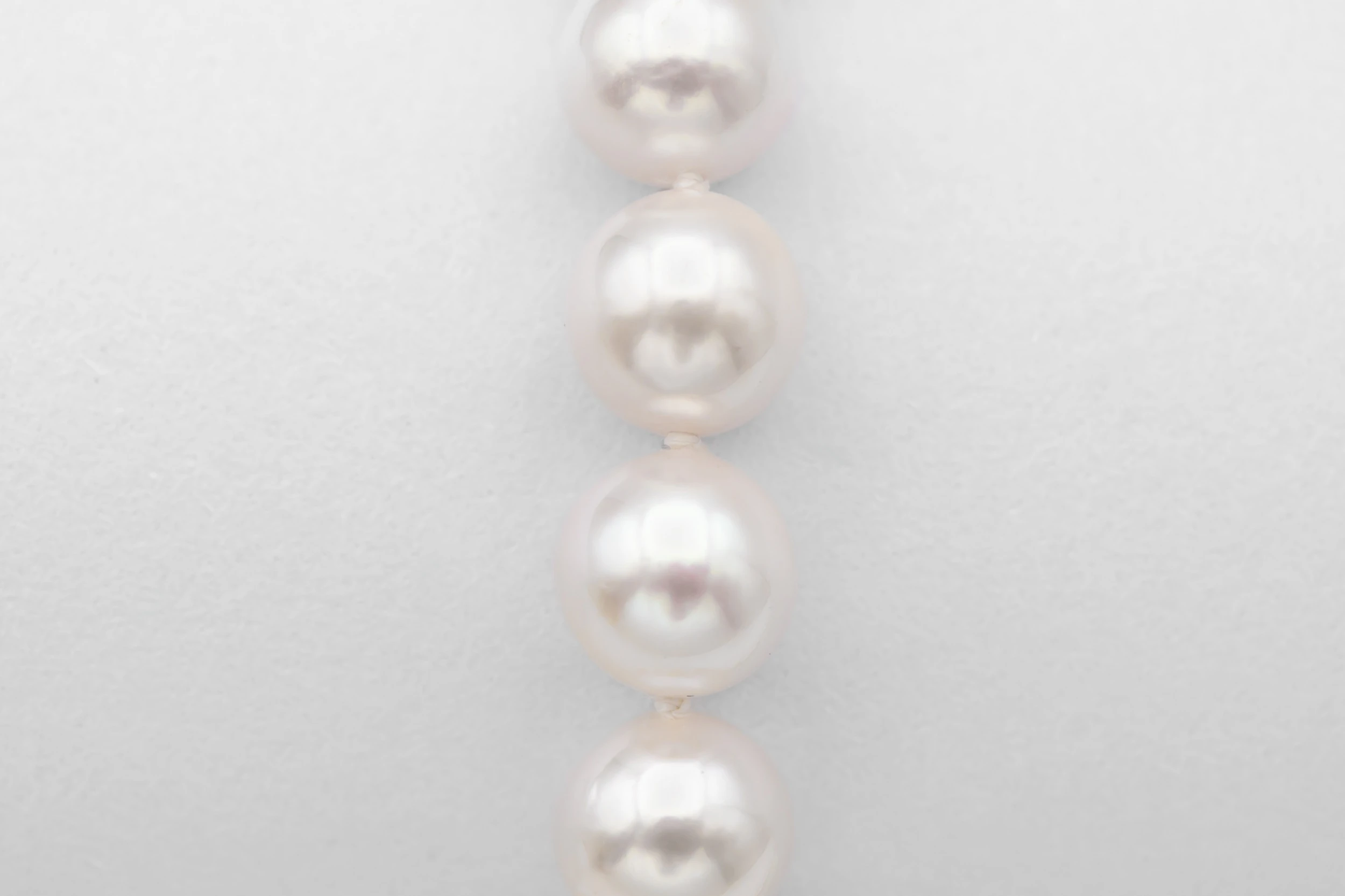 A timeless and luxurious design, this Akoya pearl and diamond necklace features a beautifully matched strand of 8.5mm natural Akoya pearls, elegantly finished with polished 18ct white gold and refined diamond detailing. Known for their exceptional lustre and perfectly round shape, these Akoya pearls create a soft, radiant glow that defines classic sophistication.