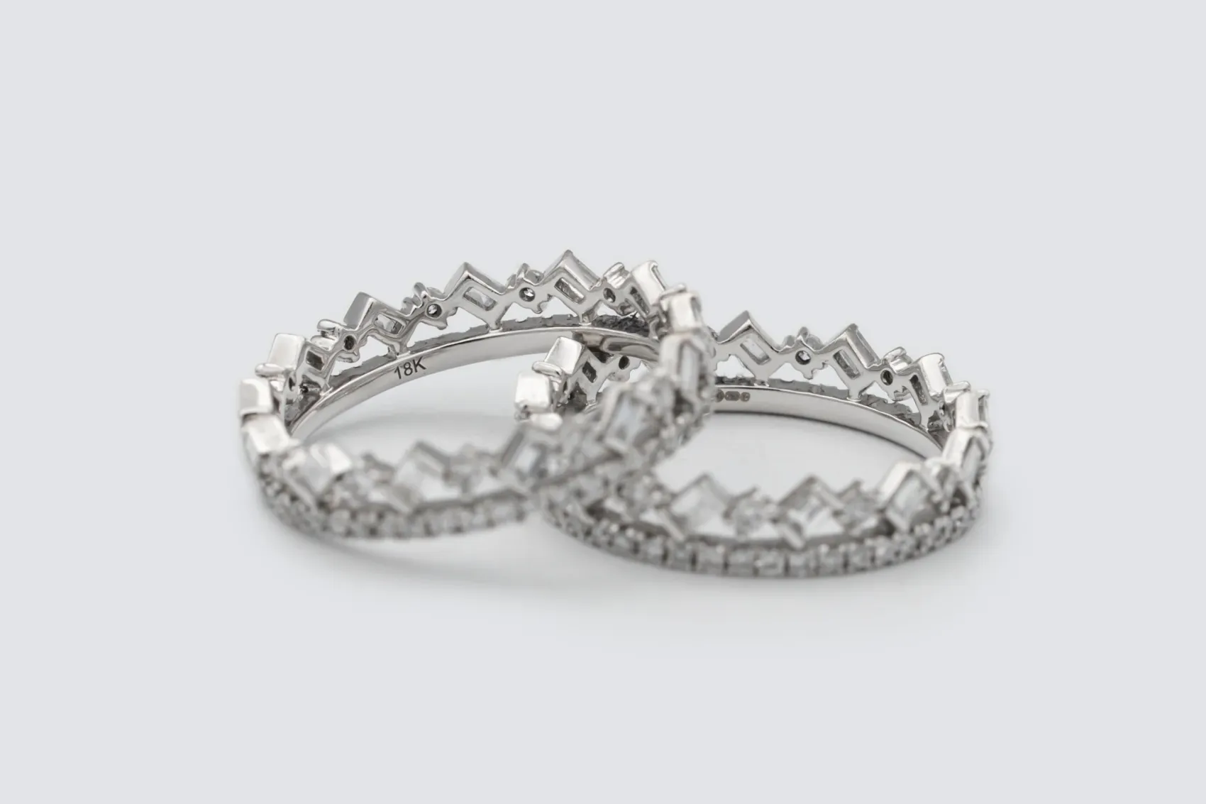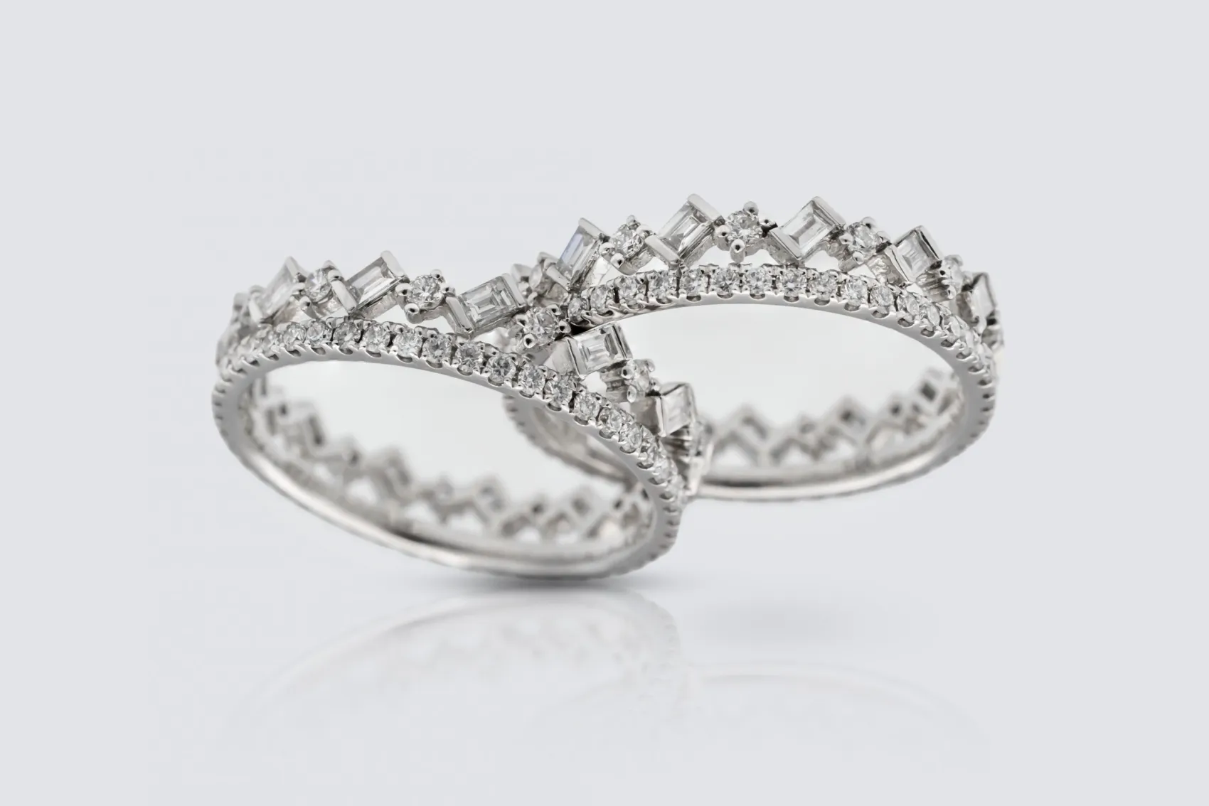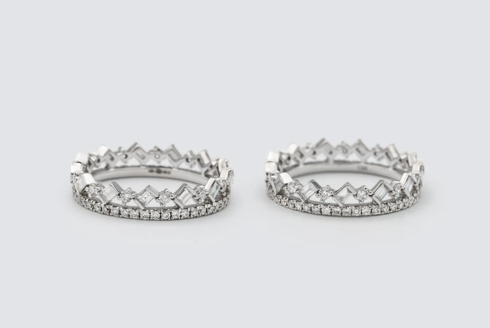 The contrast between the structured baguette cuts and the radiant round stones creates a sophisticated balance of geometry and brilliance. Modern, elegant, and endlessly wearable, these bands reflect the precision and refined craftsmanship at the heart of AMPM Luxury Goods.