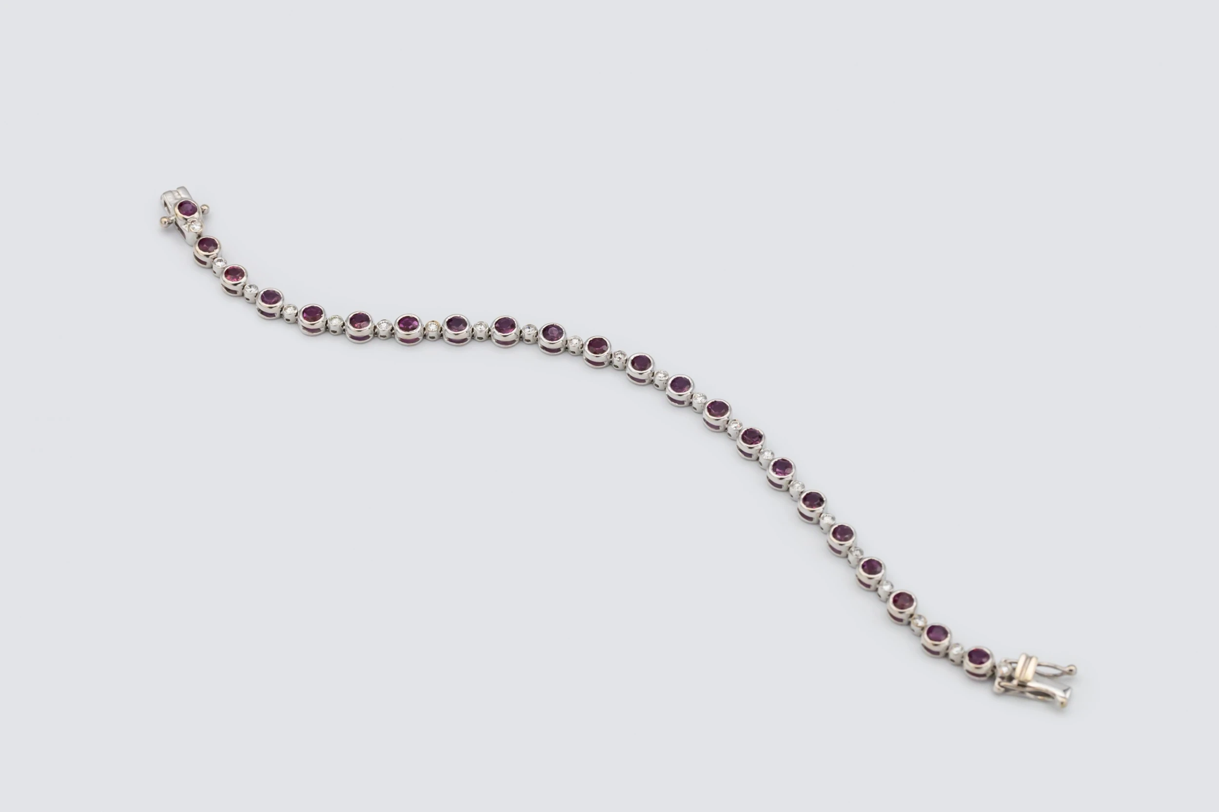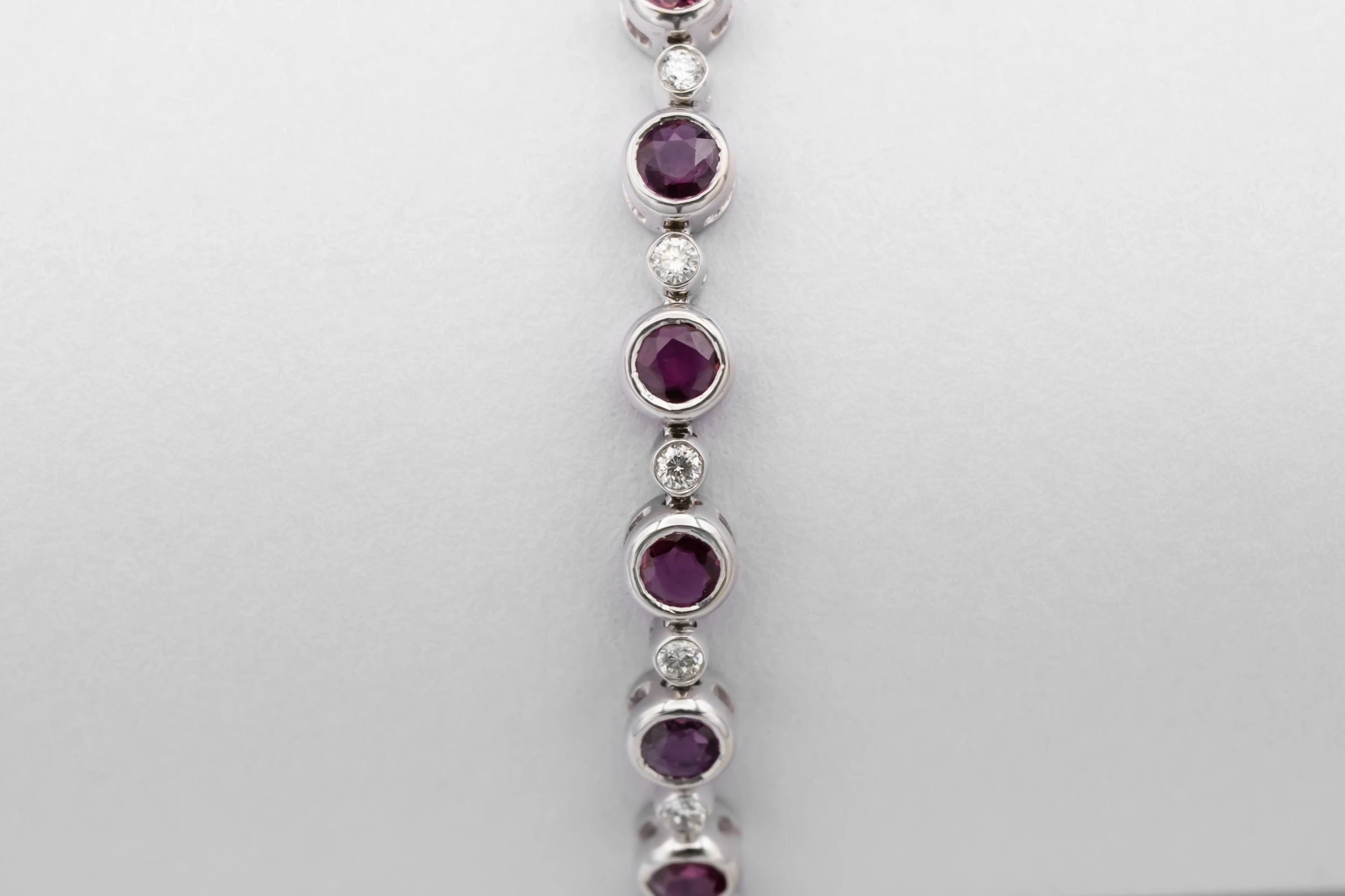 A sleek and elegant design, this ruby and diamond bracelet features natural brilliant round rubies and diamonds, each beautifully secured in smooth rubover settings crafted from polished 18ct white gold. The alternating pattern of vivid red rubies and bright diamonds creates a refined contrast, offering a luxurious blend of colour and sparkle across the wrist.