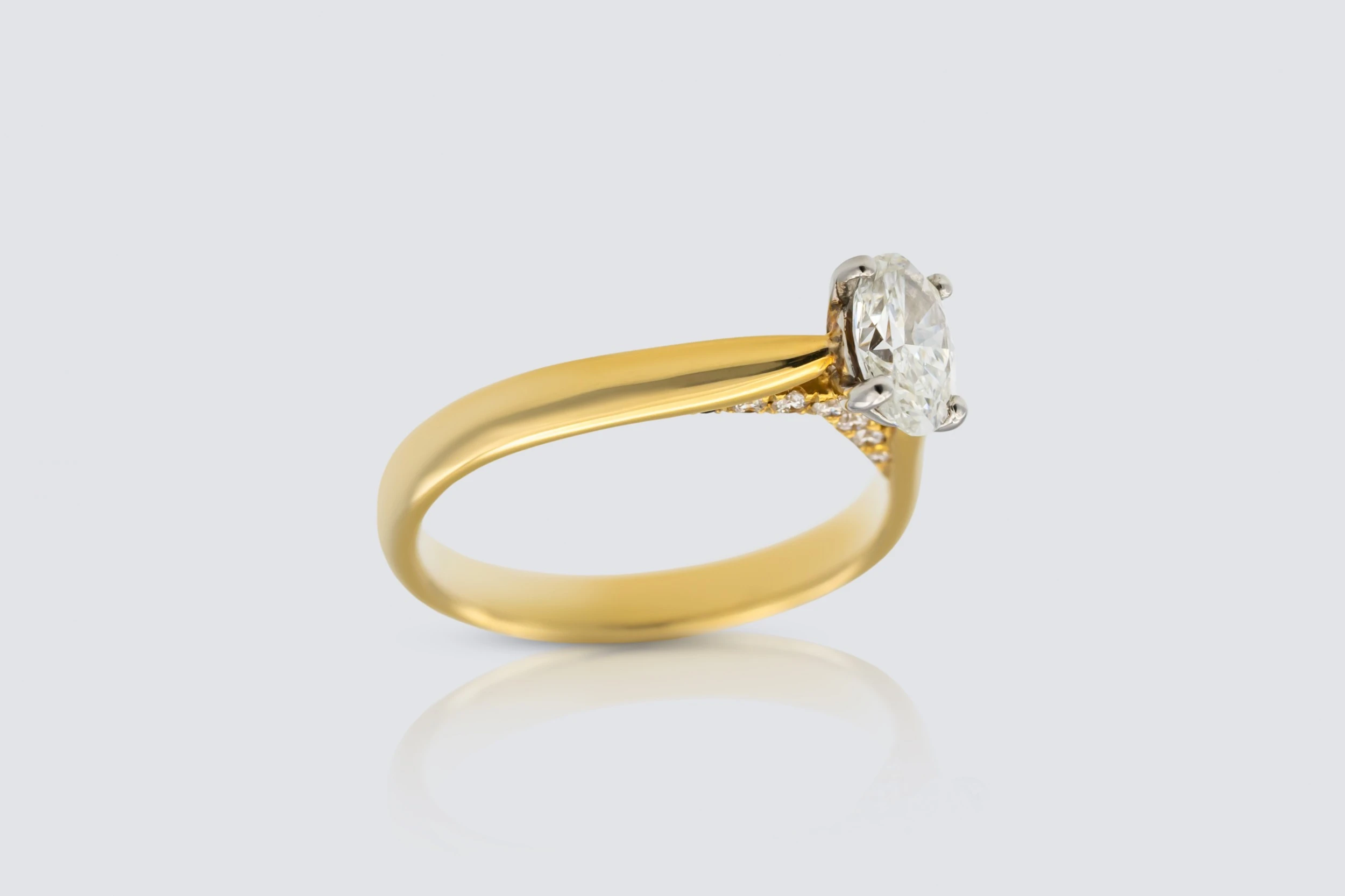 Certified and crafted with precision, this ring combines classic romance with modern refinement. The elongated oval cut offers flattering sparkle and sophistication, while the polished yellow gold band adds a luxurious, contemporary finish. A perfect expression of commitment, artistry, and the fine craftsmanship behind AMPM Luxury Goods.