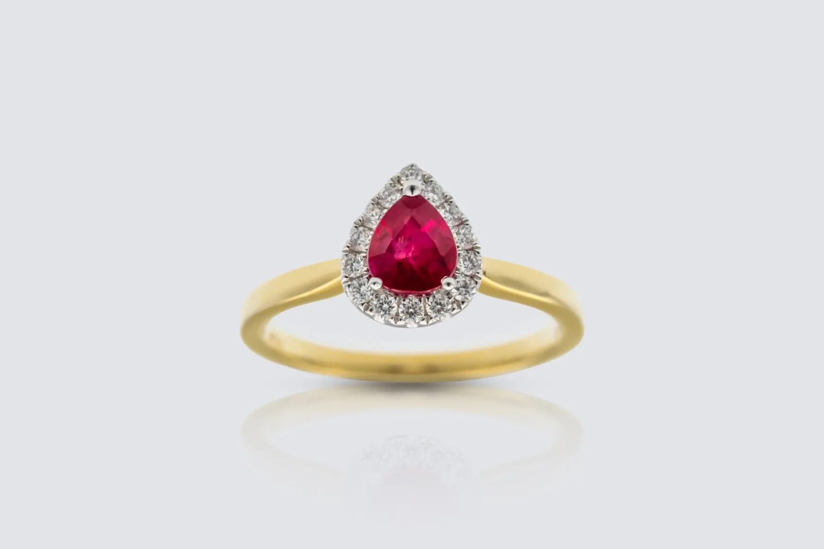 A refined expression of colour and elegance, this pear shaped ring features a captivating natural ruby complemented by a delicate brilliant cut natural diamond, both prong set in radiant 18ct yellow gold. The 0.70ct ruby glows with deep red vibrancy, beautifully balanced by the 0.17ct diamond, which adds a touch of sparkle and light.