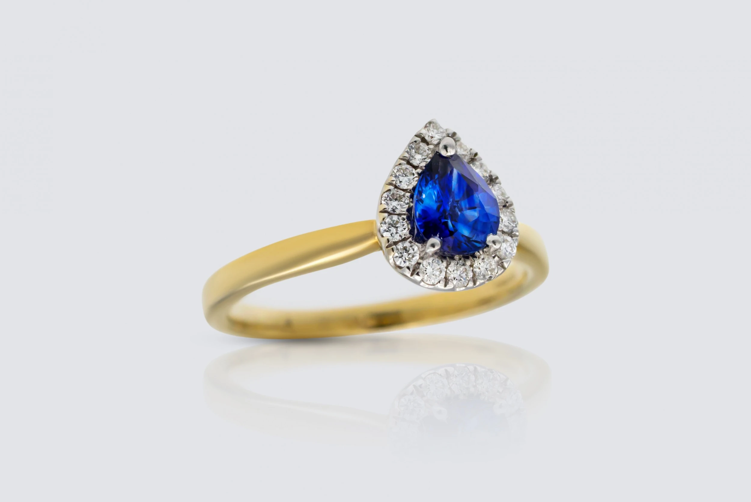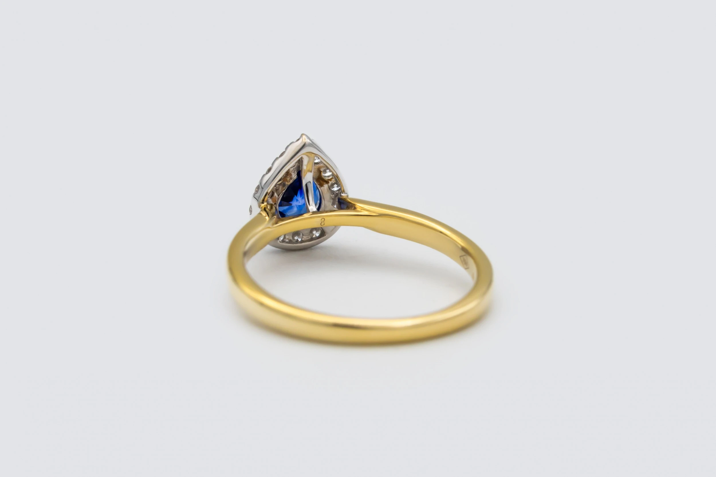 A refined and elegant design, this sapphire and diamond ring features a vivid 0.70ct natural sapphire paired with a delicate 0.17ct natural pear cut diamond, both beautifully prong set in polished 18ct yellow gold. The combination of the sapphire’s rich blue hue with the diamond’s graceful pear shape creates a soft, sophisticated contrast full of sparkle and colour.