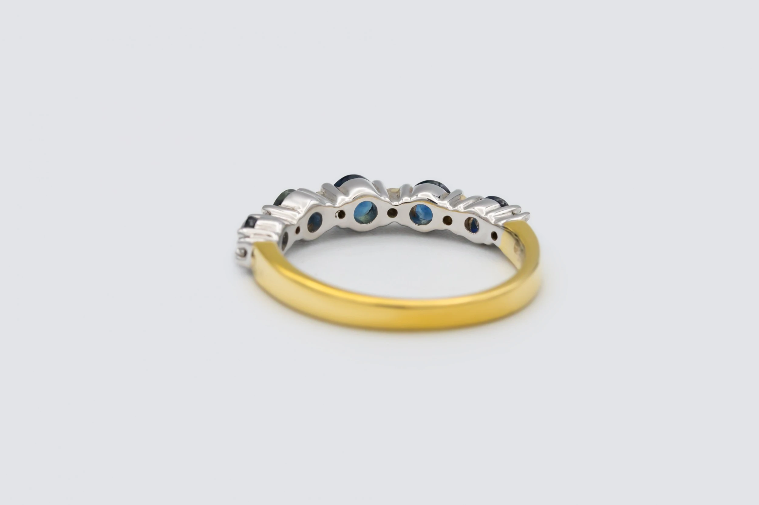 A refined blend of colour and brilliance, this sapphire and diamond band ring features a vivid 0.93ct natural sapphire complemented by 0.10ct of natural brilliant round diamonds, each expertly prong set in warm 18ct yellow gold. The rich blue of the sapphire contrasts beautifully with the bright sparkle of the diamonds, creating a timeless and luxurious aesthetic.