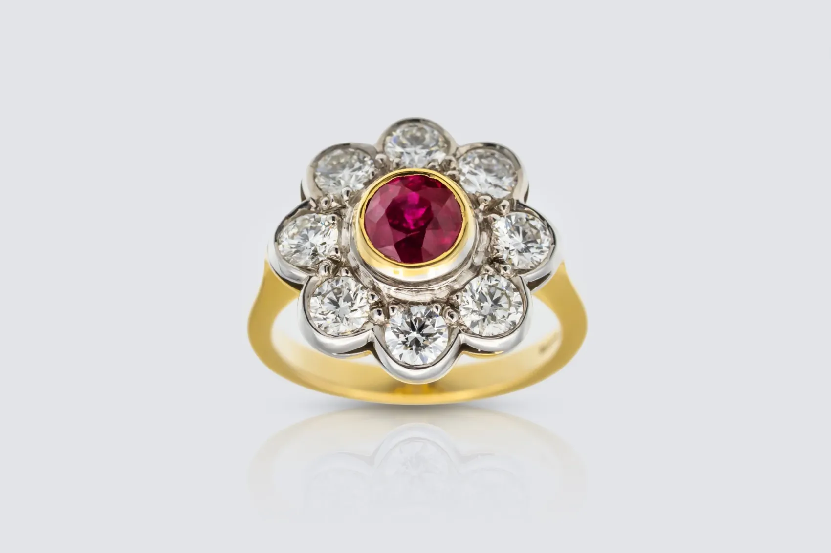 A radiant celebration of colour and craftsmanship, this daisy cluster ring features a mesmerising round natural ruby surrounded by a halo of brilliant cut natural diamonds. Each gemstone is expertly set in rich 18ct yellow gold, creating a stunning contrast between the ruby’s deep red tones and the diamond’s crisp brilliance.