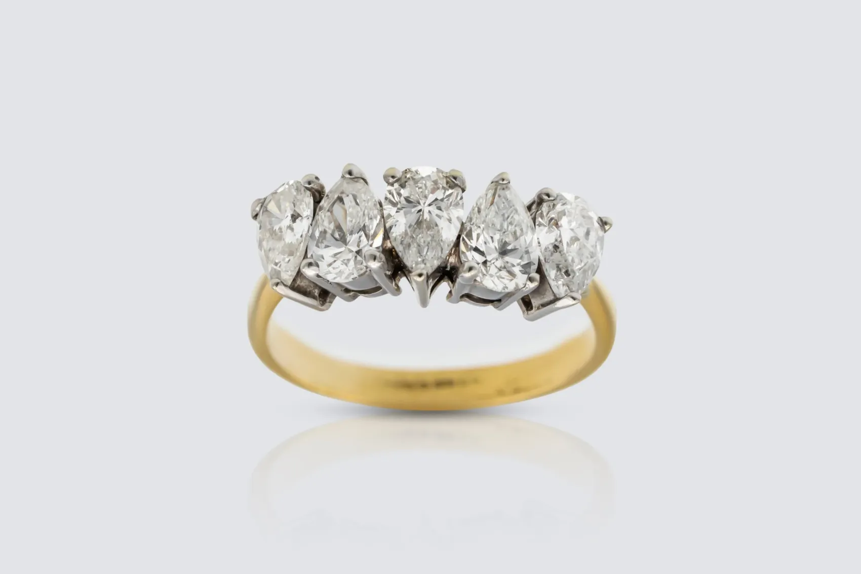 A beautifully refined and elegant design, this five stone half eternity ring features 2.00ct of natural pear cut diamonds, graded G to H colour with SI2 clarity, all gracefully prong set in polished 18ct yellow gold. The tapered pear shapes create a flowing line of brilliance across the finger, offering a striking yet feminine profile with exceptional sparkle.