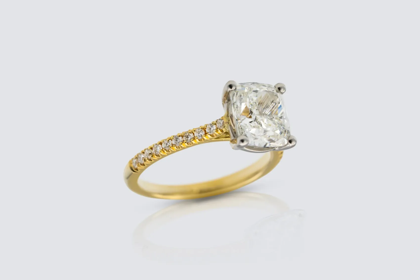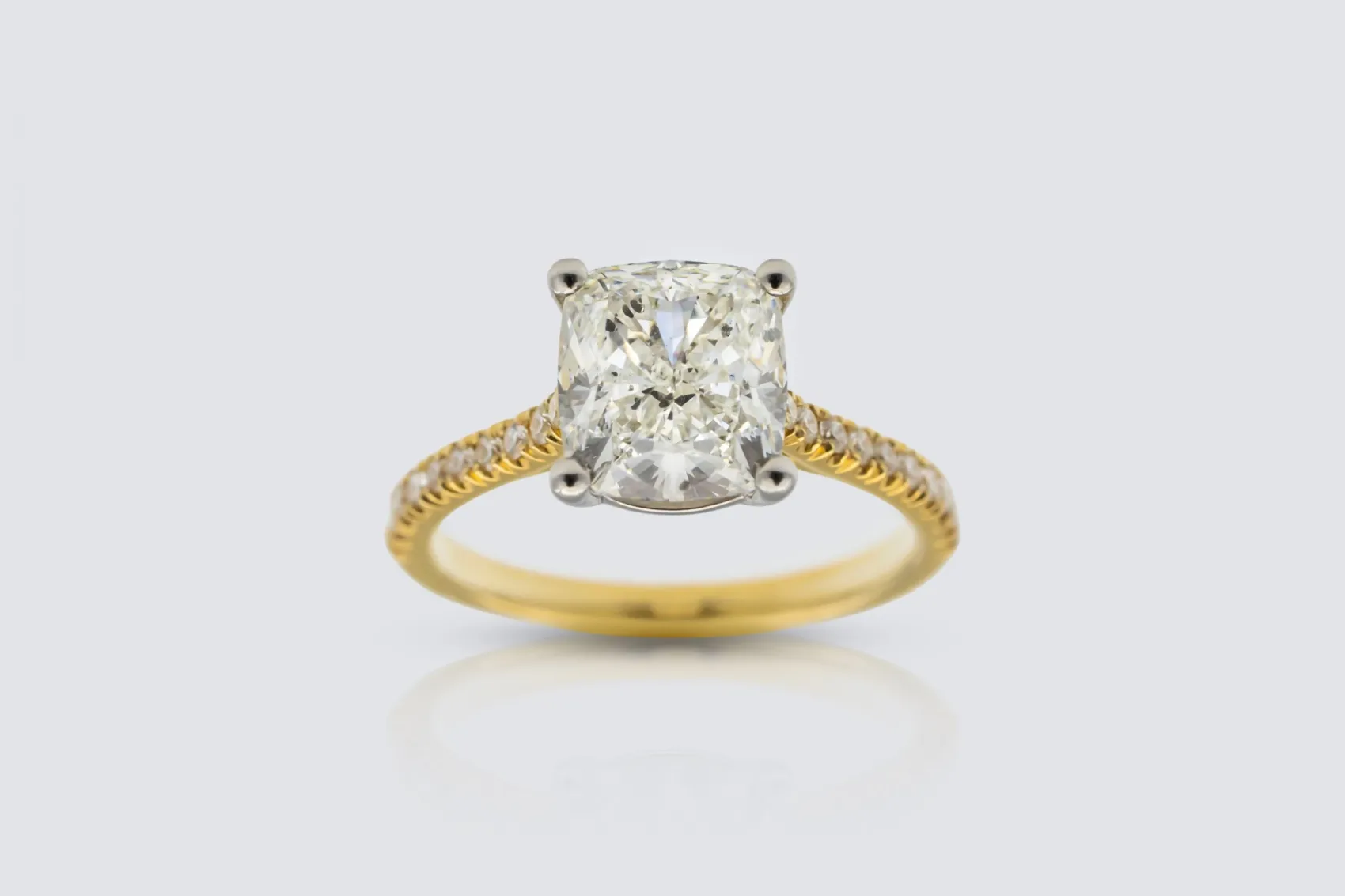 A masterpiece of timeless sophistication, this cushion cut natural diamond engagement ring radiates brilliance and warmth. The 2.50ct centre diamond, graded H colour and SI2 clarity, is complemented by 0.22ct of shoulder diamonds, adding refined sparkle along the polished 18ct yellow gold band.