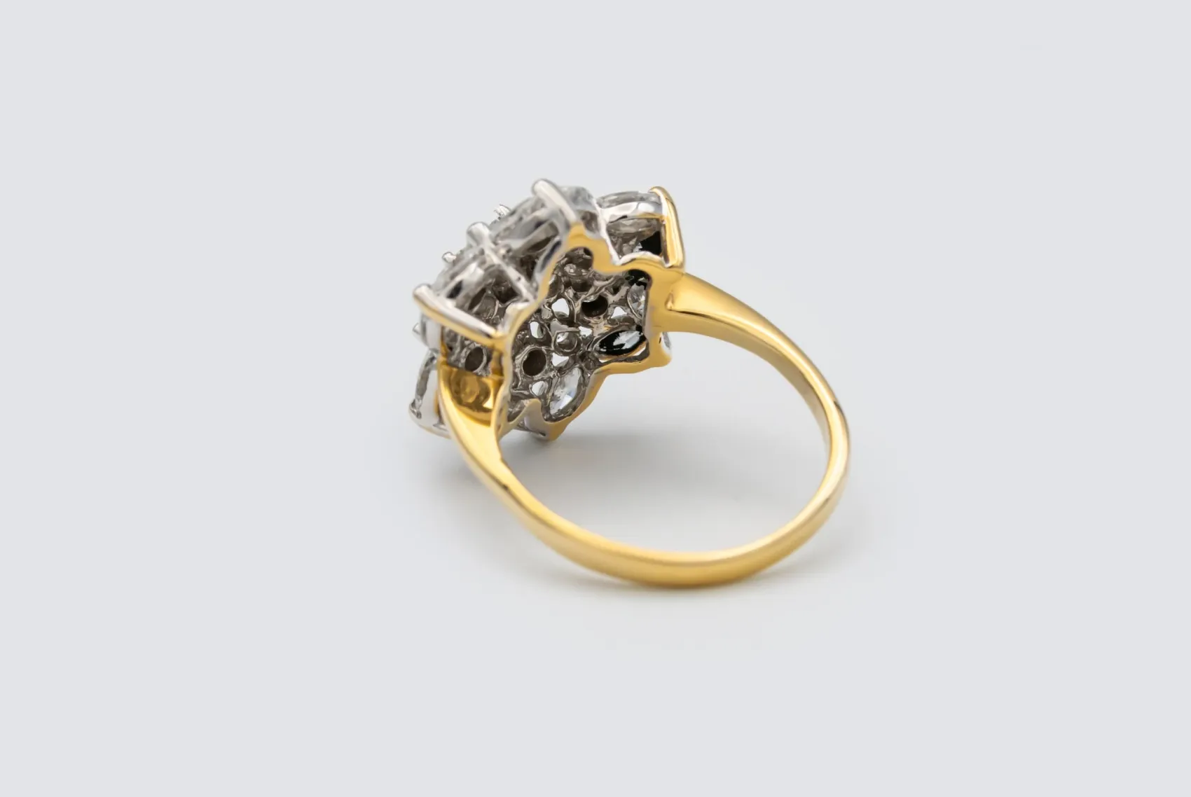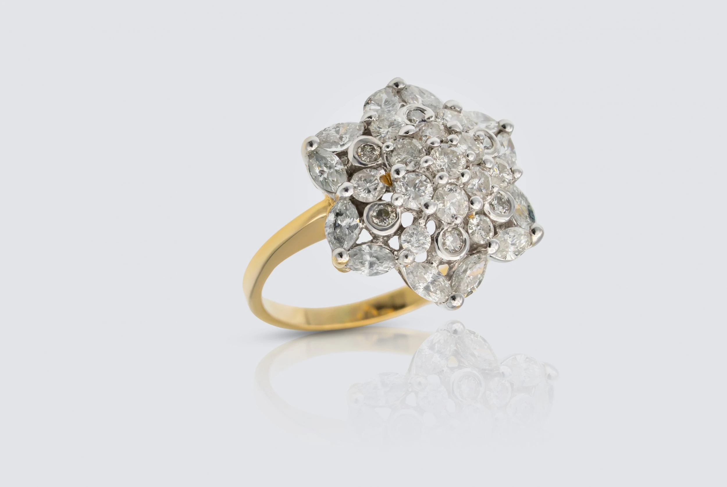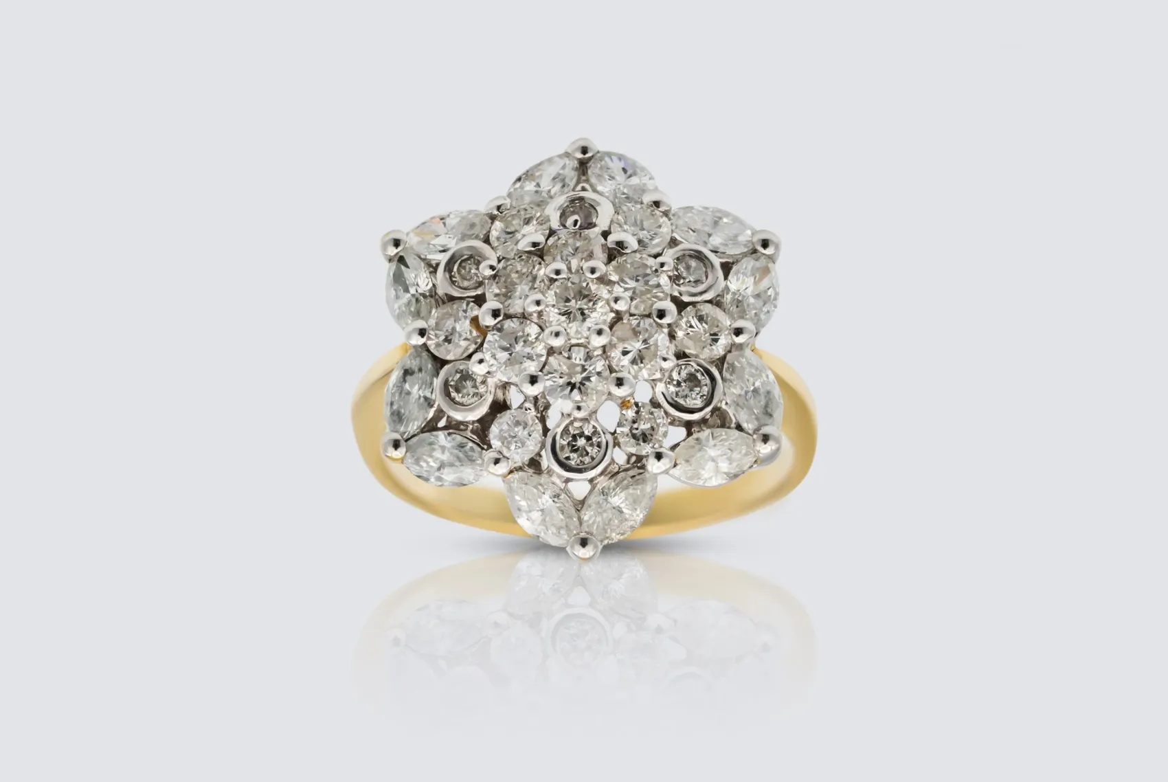 The contrast of warm yellow gold with platinum detailing enhances the brightness of the diamonds, creating a striking, dimensional cluster full of movement and fire. Perfect for statement wear, special occasions, or those who appreciate intricate craftsmanship, this ring embodies the luxury, artistry, and timeless sophistication of AMPM Luxury Goods.