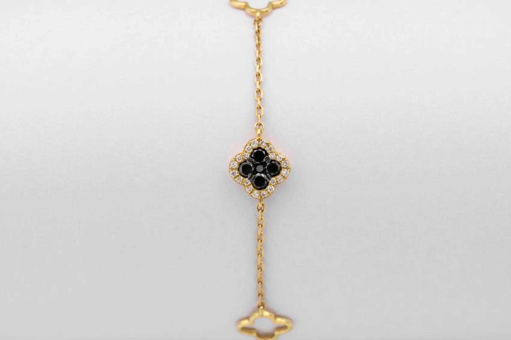 A distinctive and stylish design, this diamond and black diamond clover bracelet features natural brilliant round white diamonds paired with striking natural black diamonds, all beautifully prong set in polished 18ct yellow gold. The signature clover motif brings a touch of timeless charm and symbolic elegance, while the contrasting gemstones create a bold, modern aesthetic.