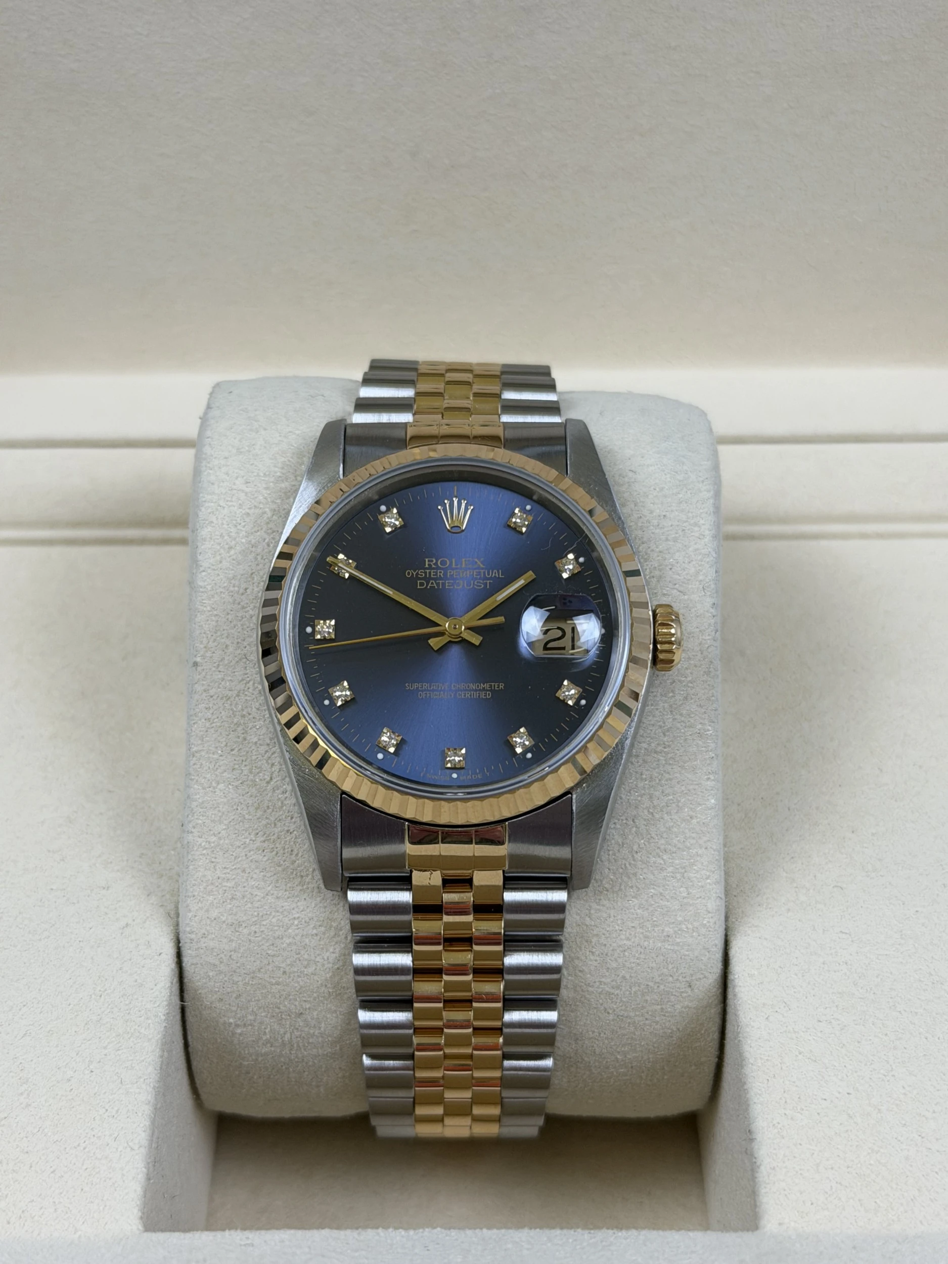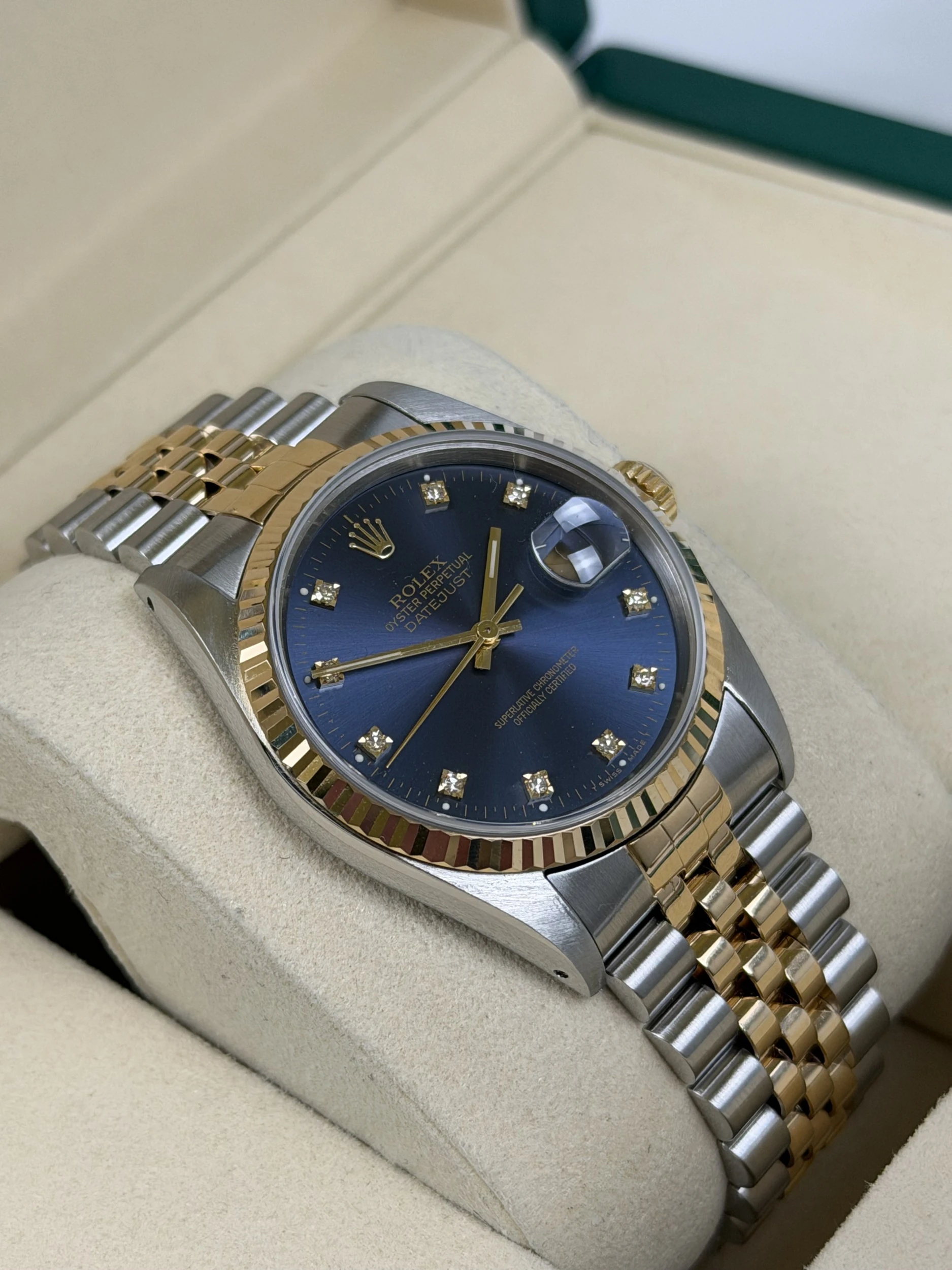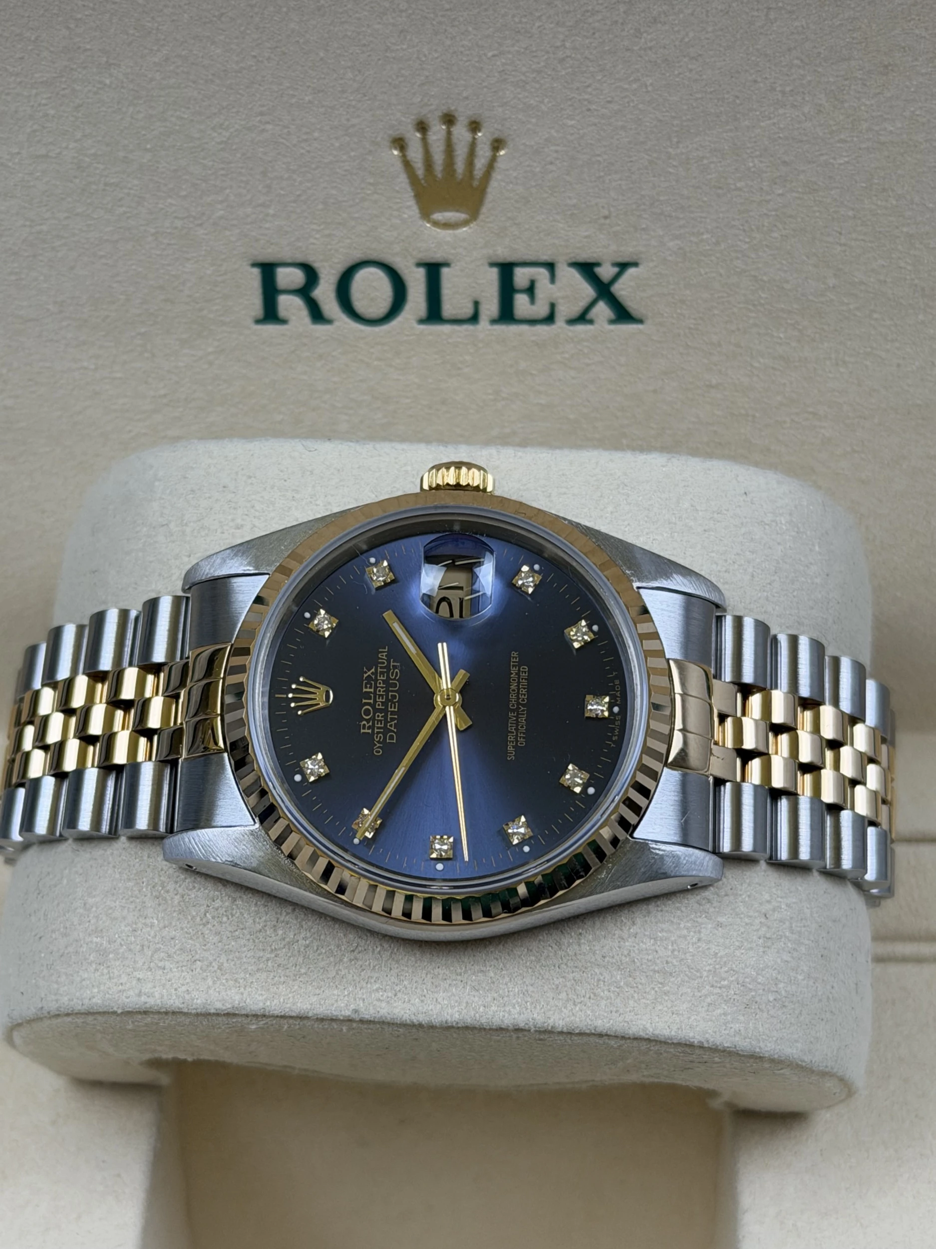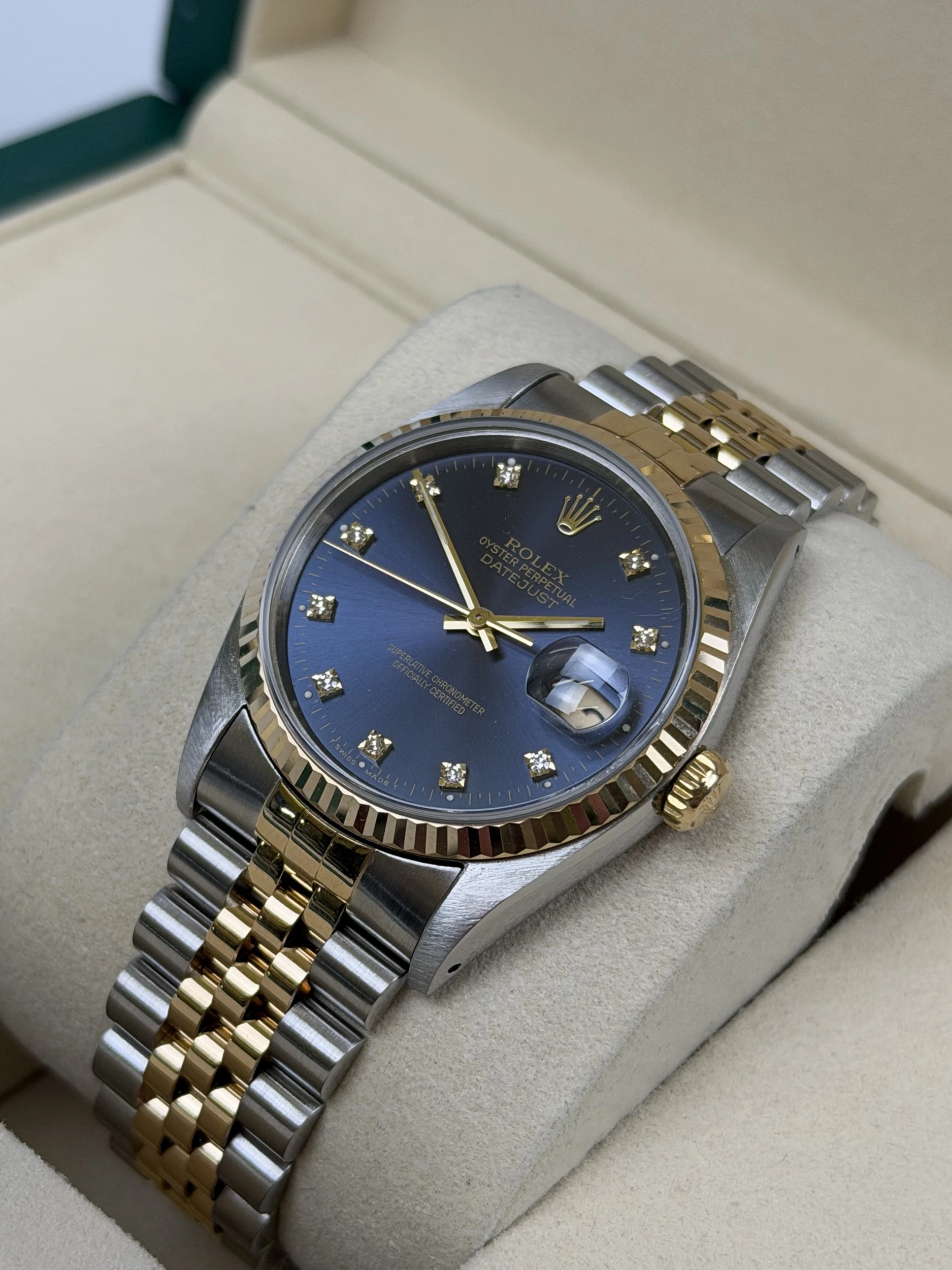 This 1993 Rolex Datejust reference 16233 is a classic pre owned two tone example, presented with its original Rolex box and papers. Featuring a striking blue diamond dial, this configuration is highly sought after for its rich colour, elegant presence and strong appeal among Datejust collectors.