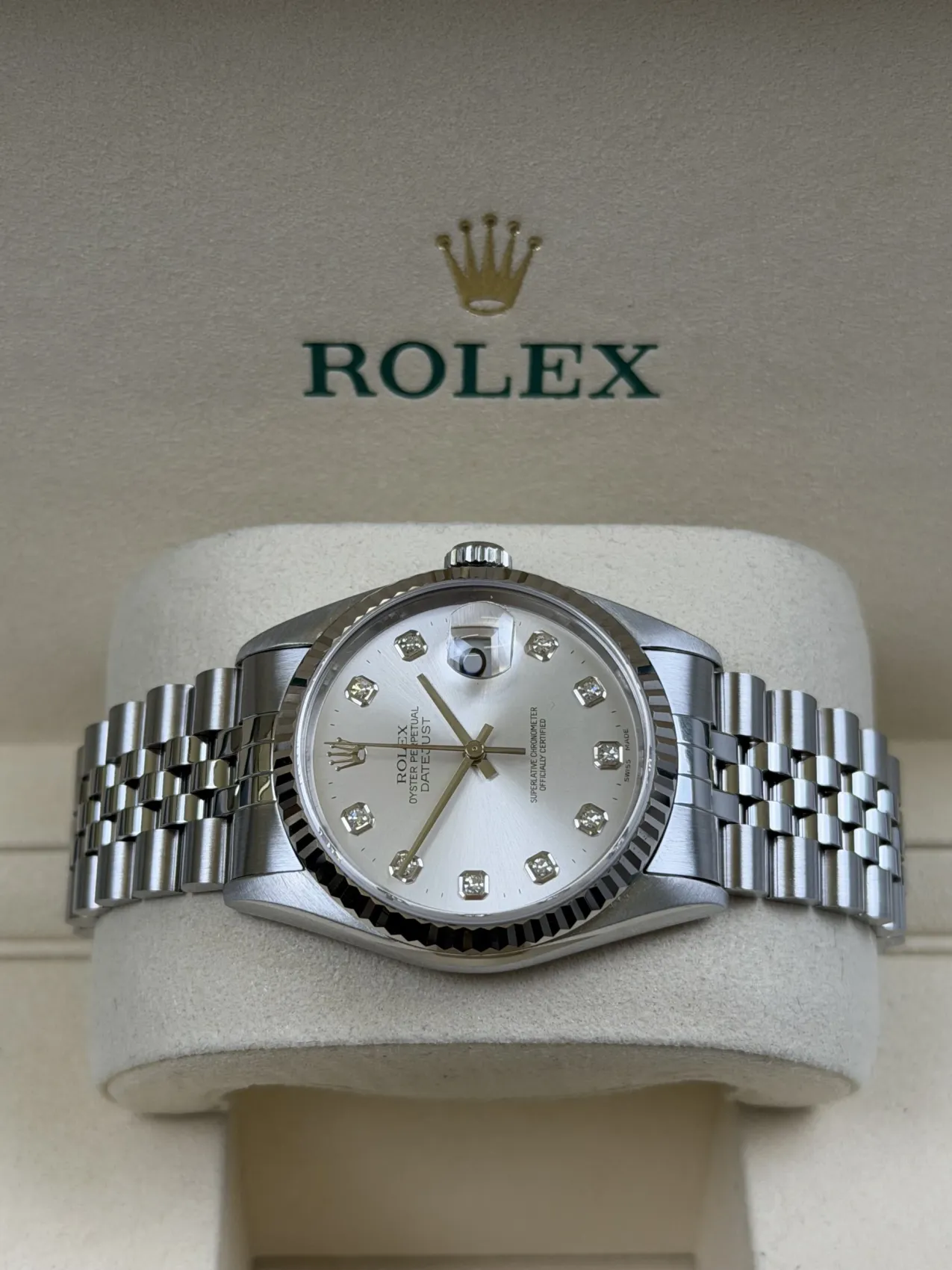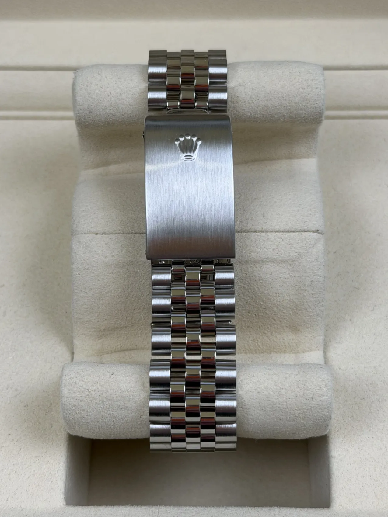 The watch is fitted with a 36mm stainless steel case, white gold fluted bezel and the iconic Jubilee bracelet, offering a perfect balance of comfort and sophistication. Powered by the dependable Rolex Calibre 3135 automatic movement, it delivers excellent accuracy, smooth performance and the trusted reliability expected from this era of Rolex production.