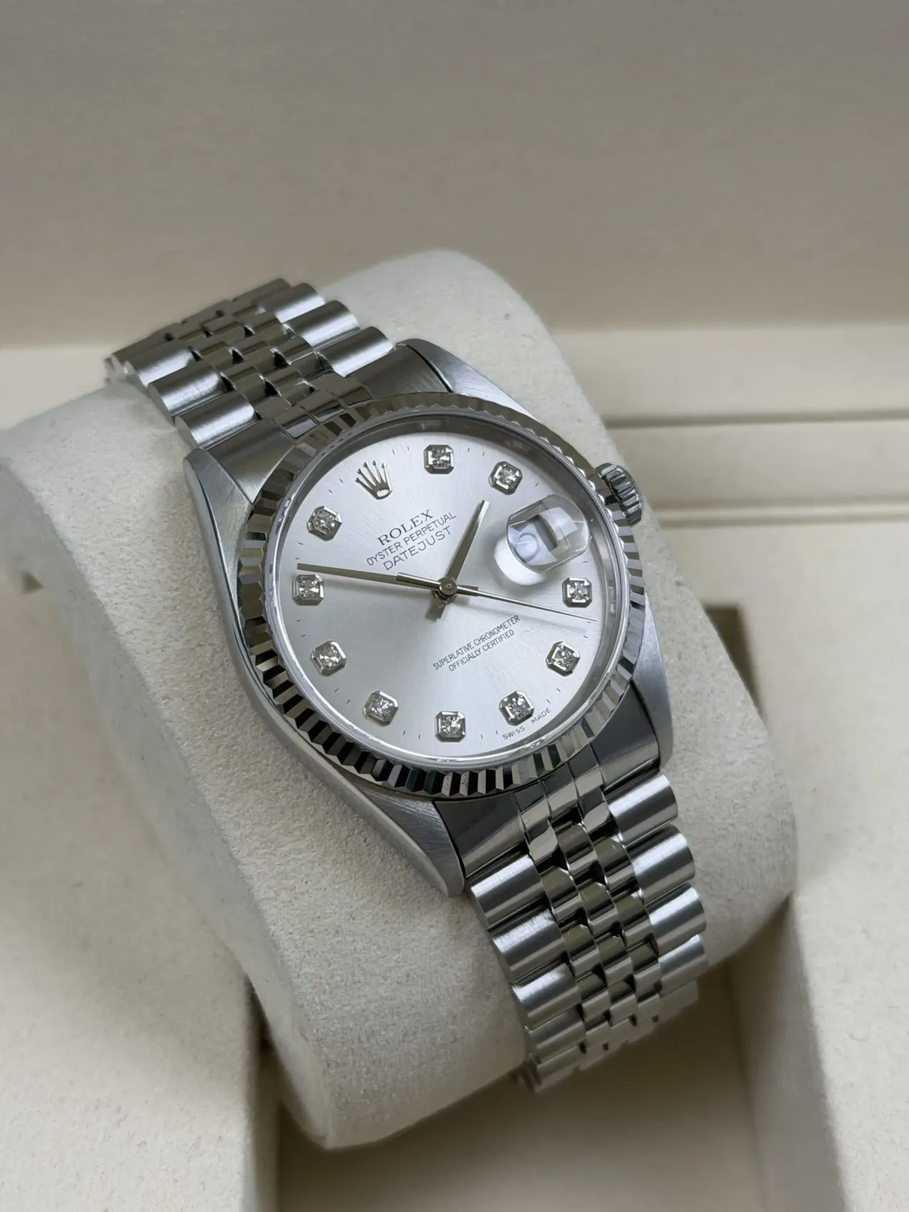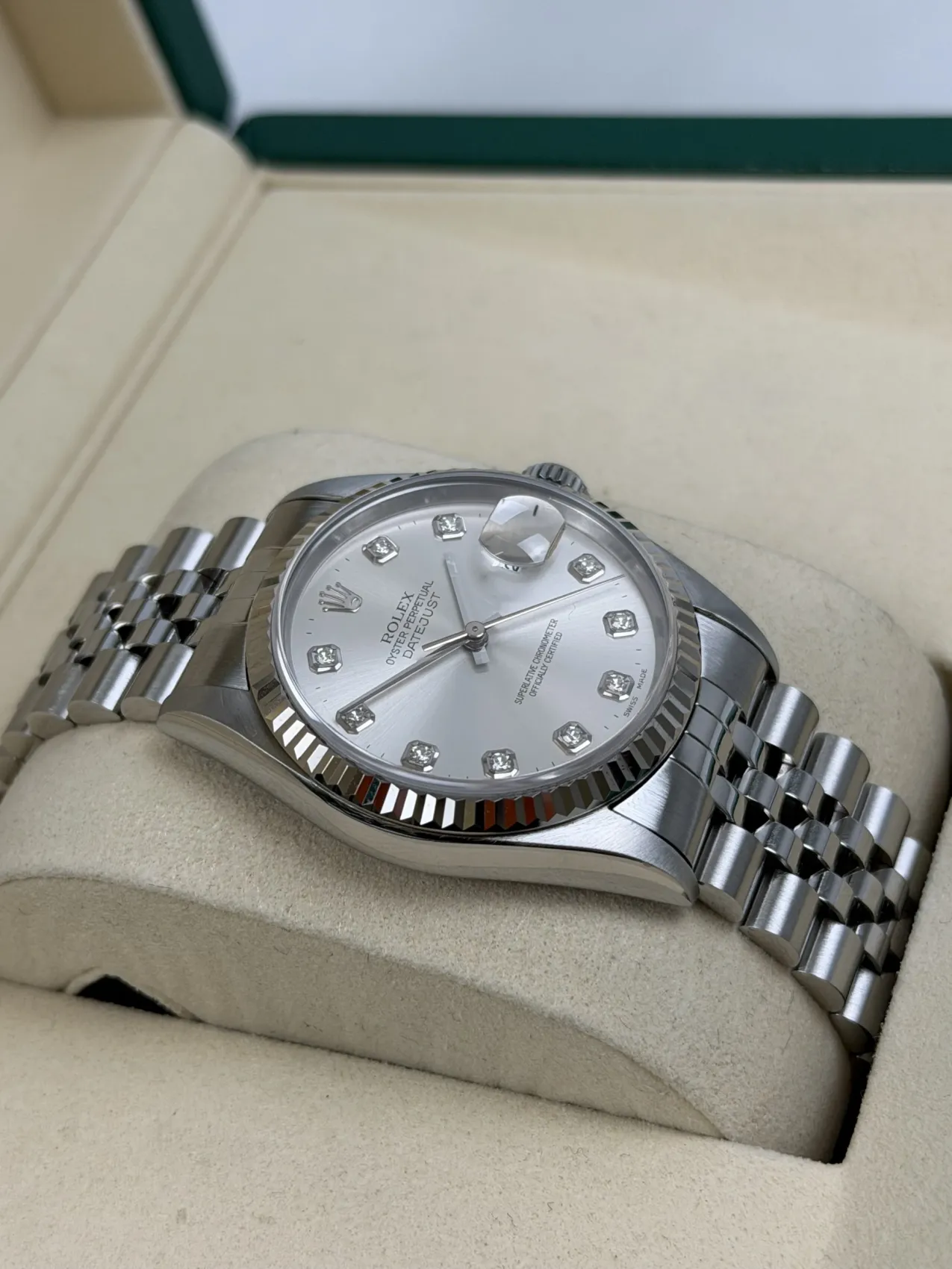 This 1996 Rolex Datejust reference 16234 is a classic pre owned stainless steel model presented with its original Rolex box and papers. Featuring a refined silver diamond dial, the 16234 is highly regarded for its elegant styling and timeless versatility within the Datejust line.