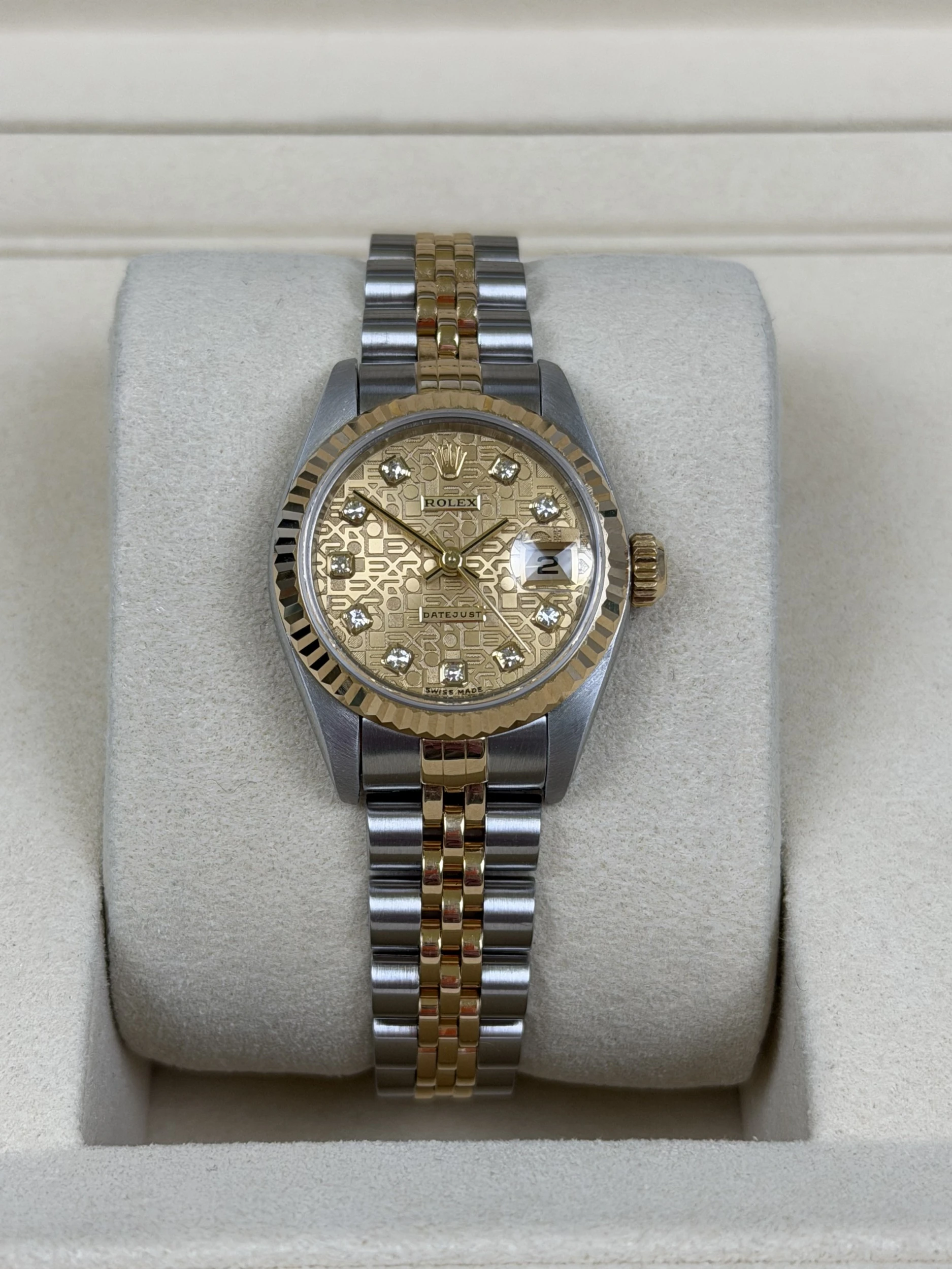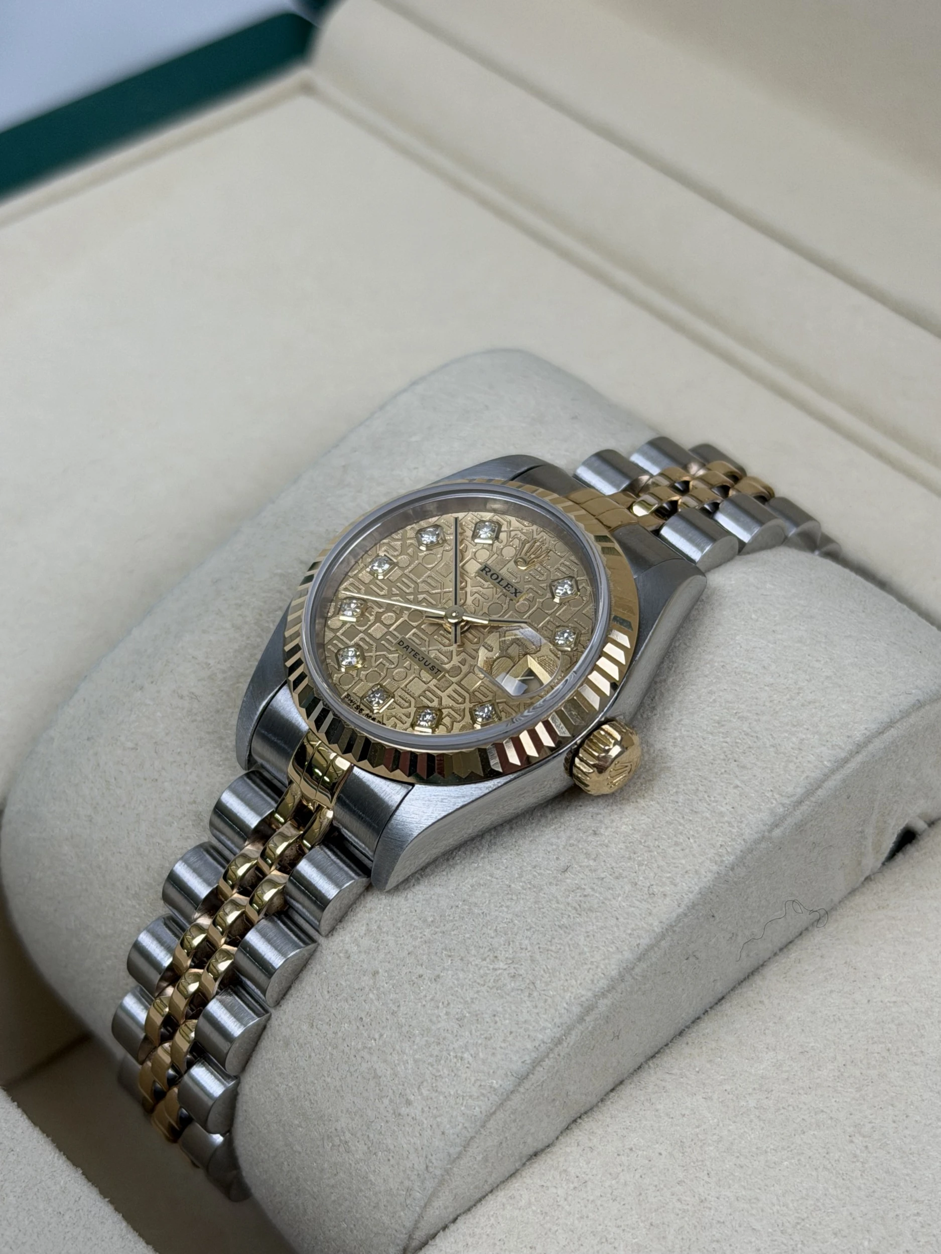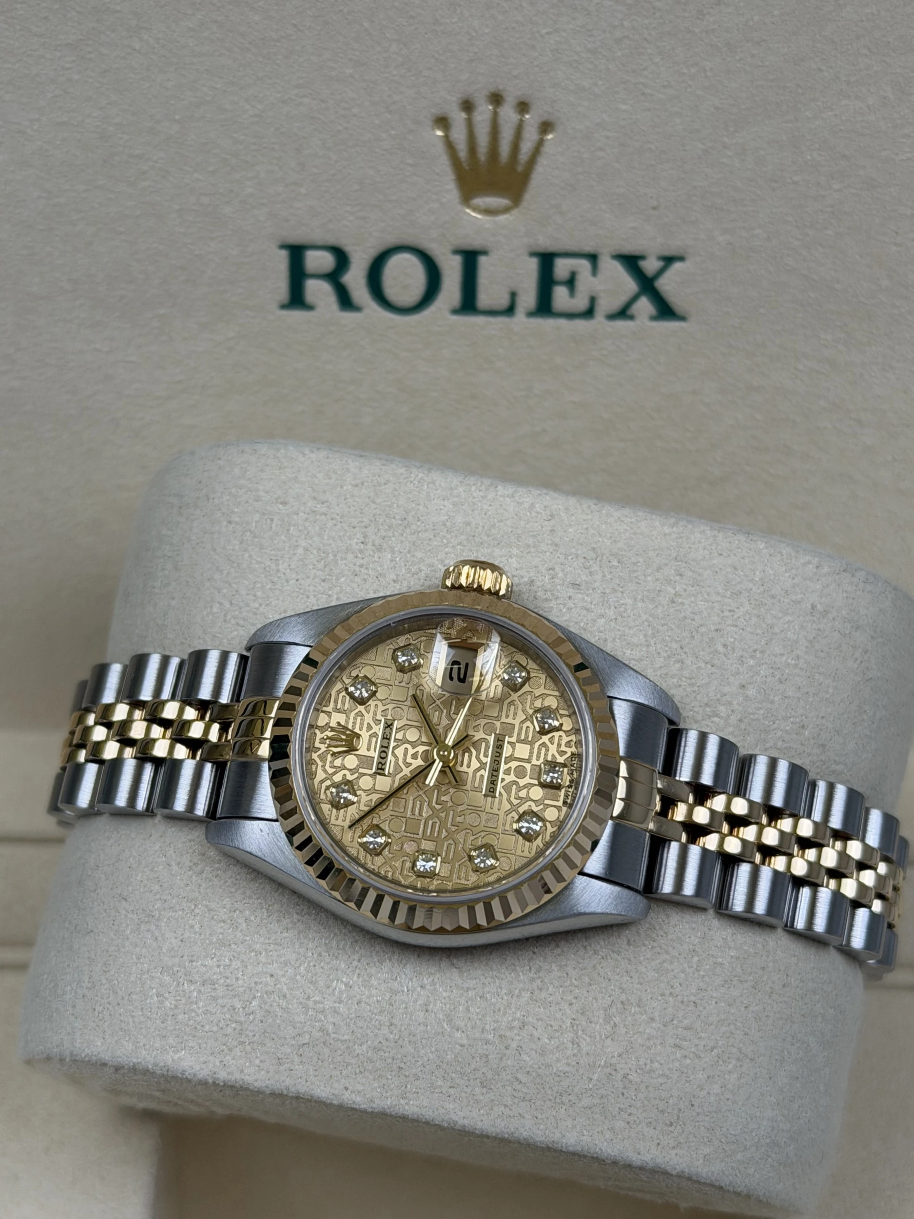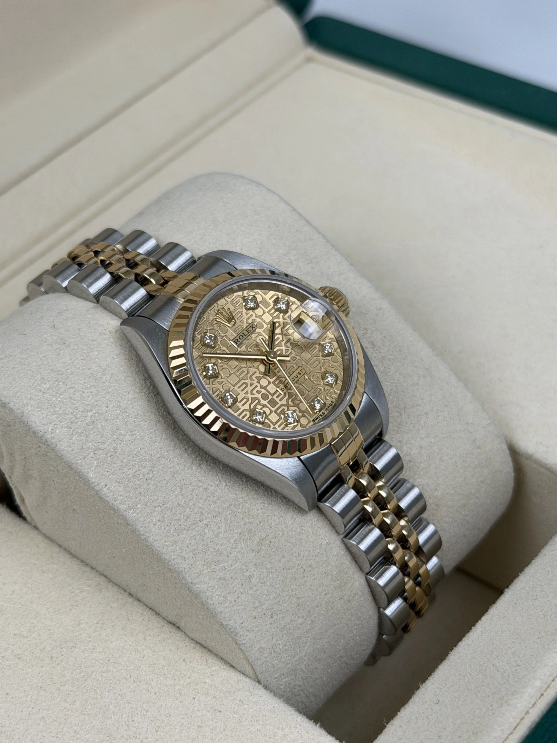 This 2001 Rolex Datejust reference 79173 is a beautifully preserved pre owned ladies two tone model, complete with its original Rolex box and papers. The champagne Jubilee diamond dial is one of the most sought after configurations, admired for its warm tones, elegant detailing and timeless presence on the wrist.