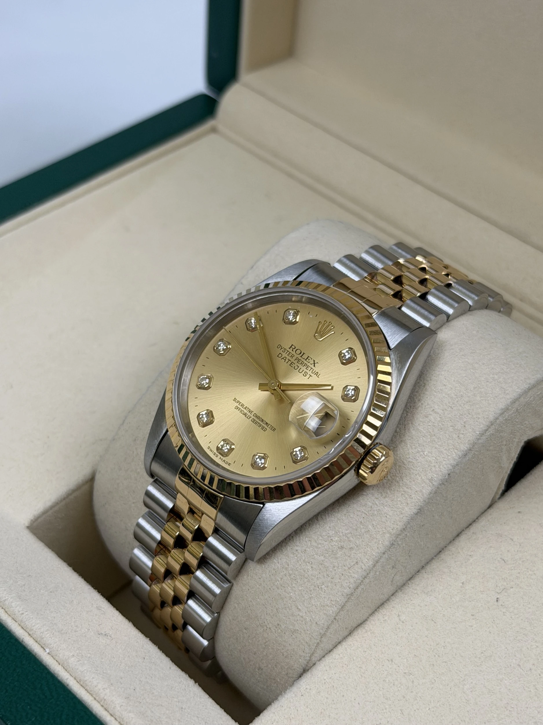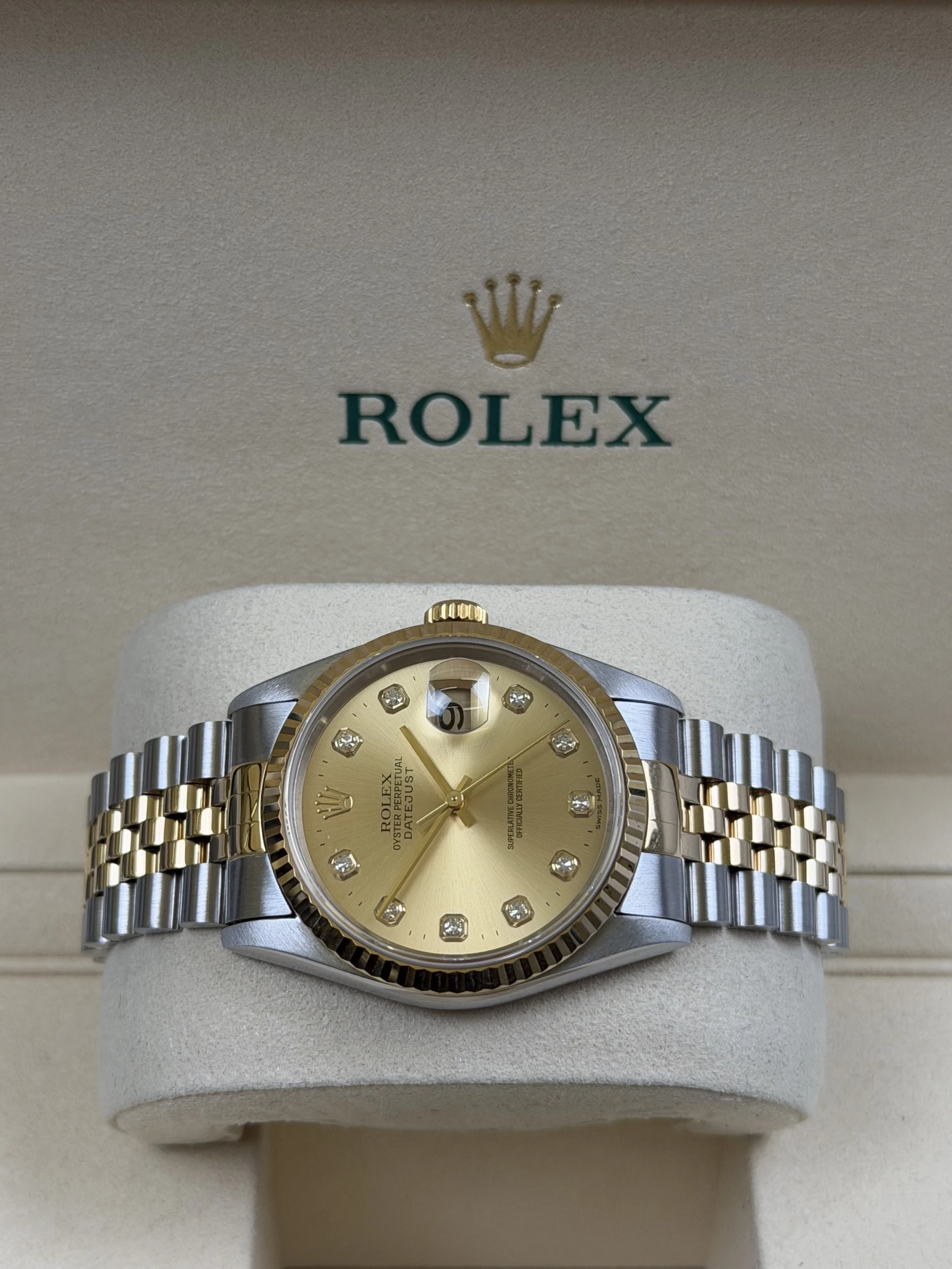 The watch is built around a 36mm stainless steel and 18ct yellow gold case, complemented by a fluted bezel and the classic Jubilee bracelet for optimal comfort and elegance. Powered by the dependable Rolex Calibre 3135 automatic movement, it delivers excellent accuracy, smooth operation and the enduring reliability expected from early-2000s Rolex craftsmanship.