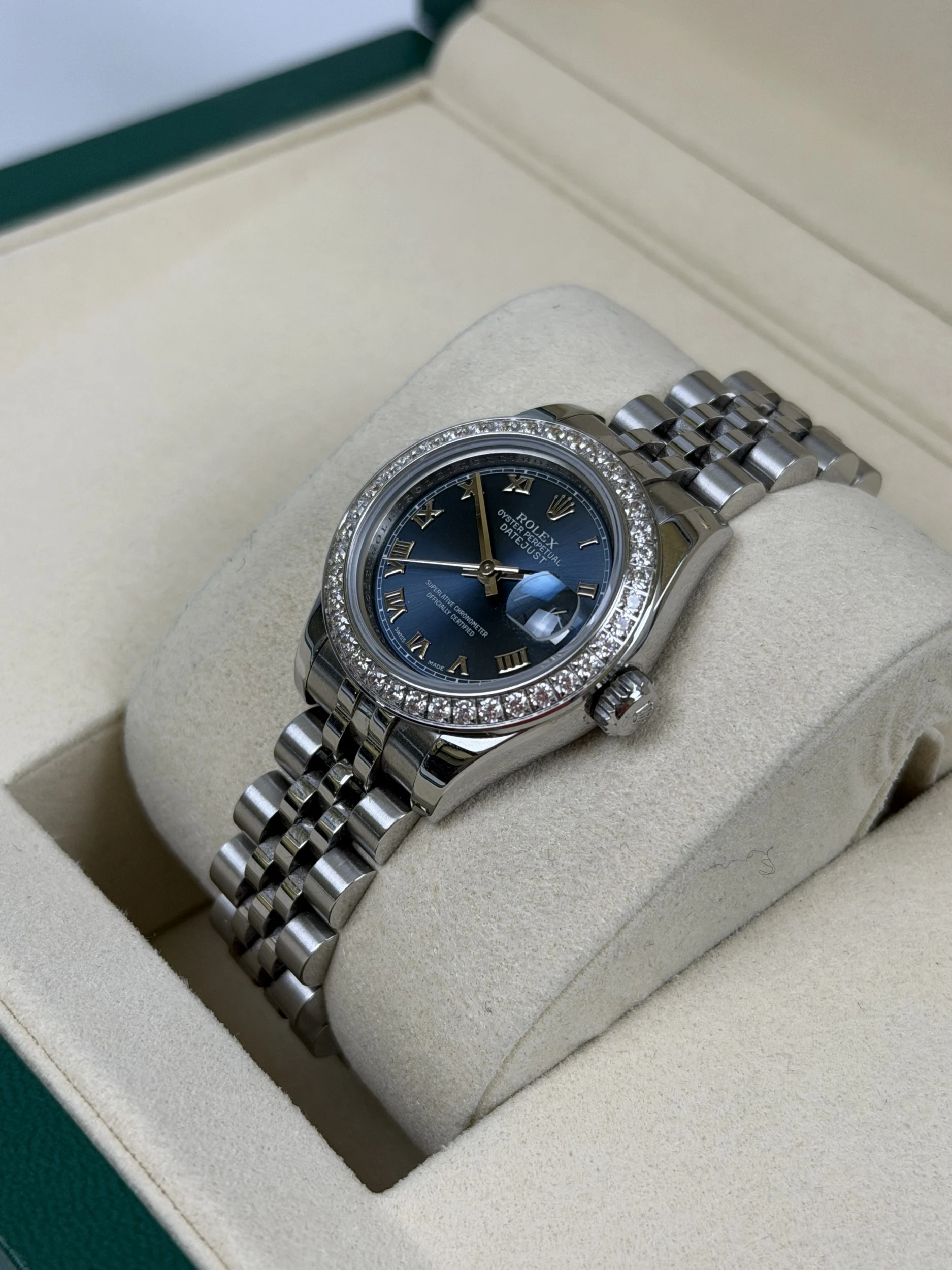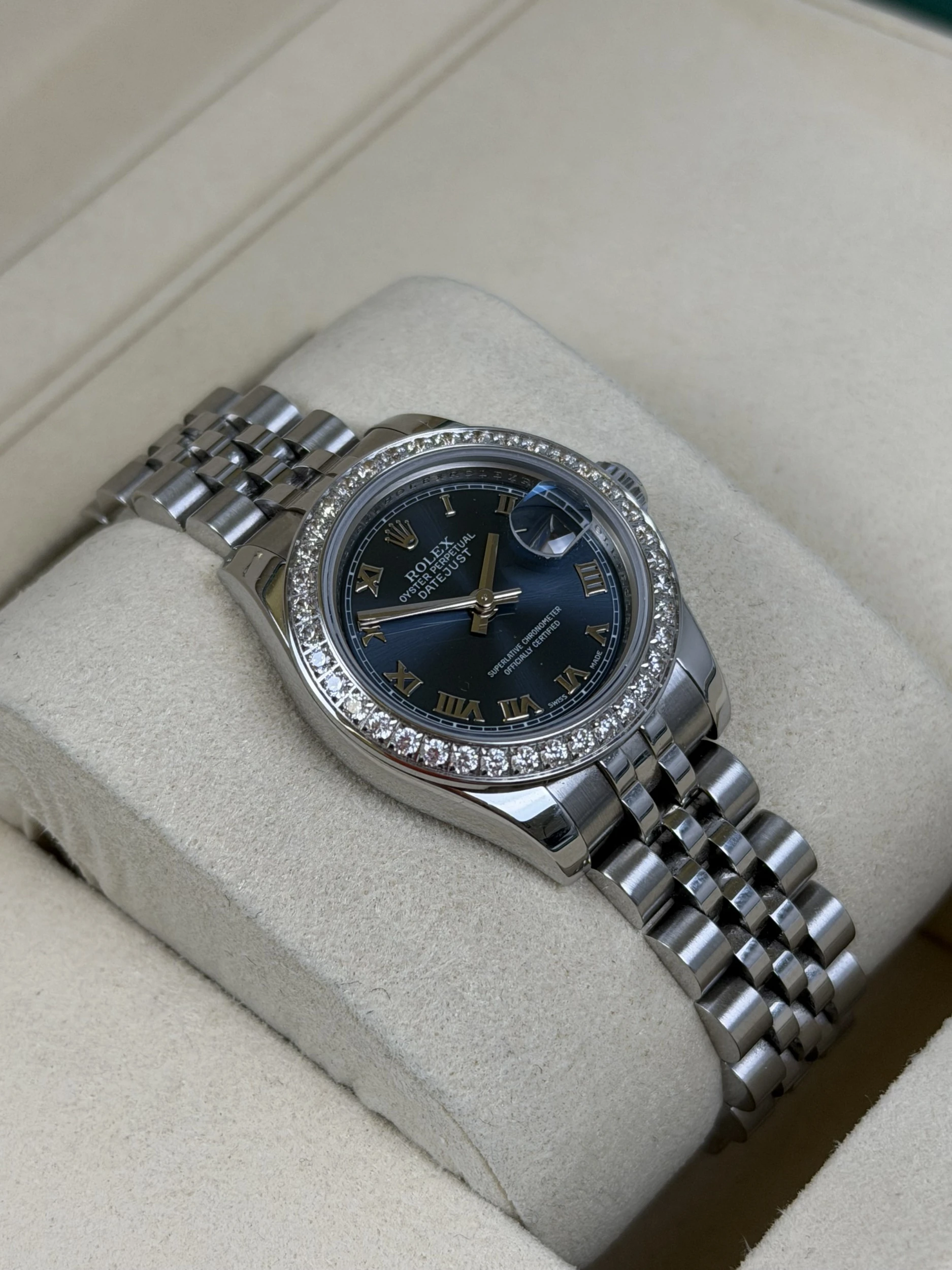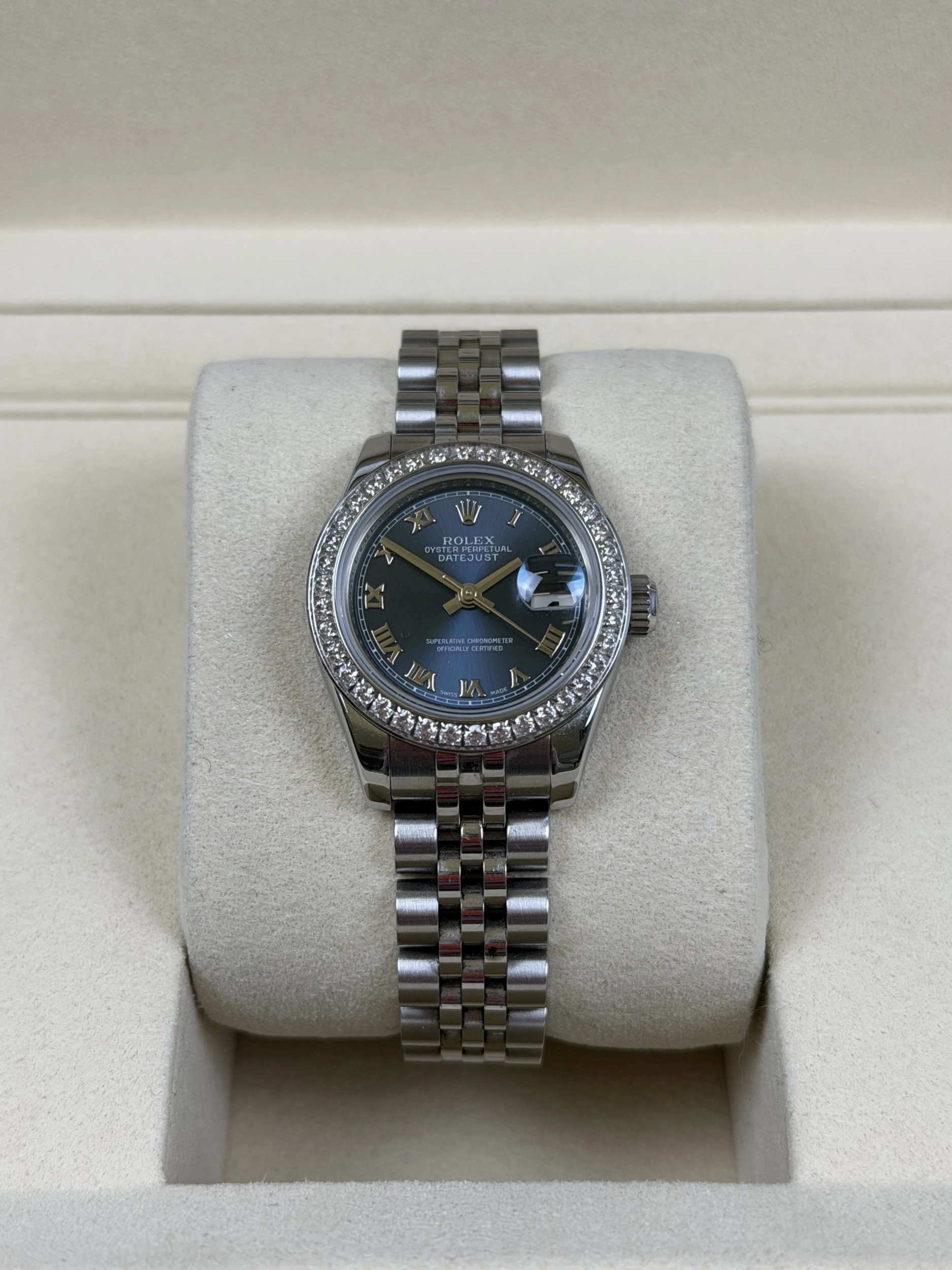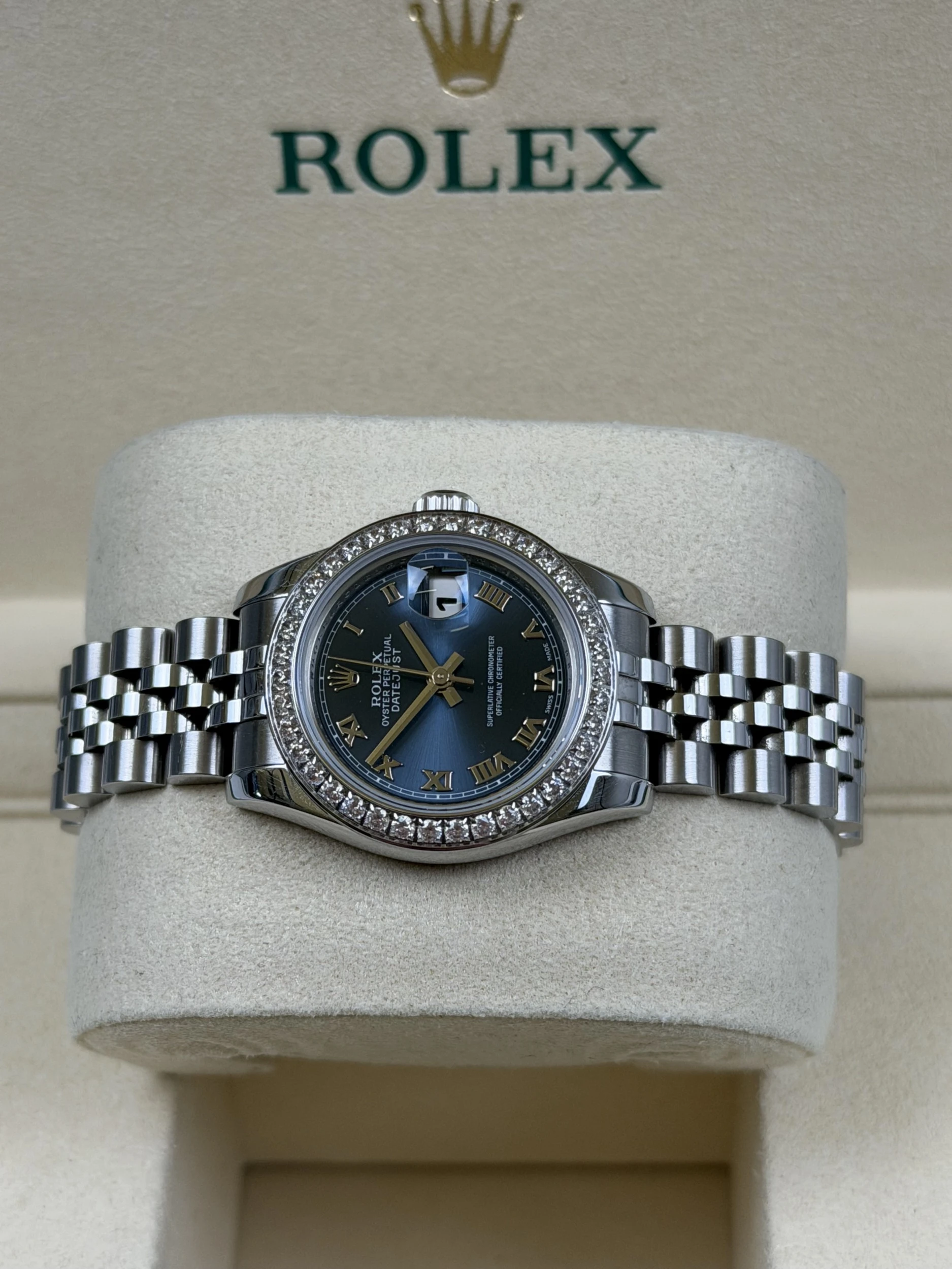 This 2008 Rolex Datejust reference 179160 is a refined pre owned ladies stainless steel model, complete with its original Rolex box and papers. It features a blue Roman numeral dial and is currently fitted with an aftermarket CZ bezel, with the original factory steel bezel included—making it an excellent option for those who appreciate versatility in styling.