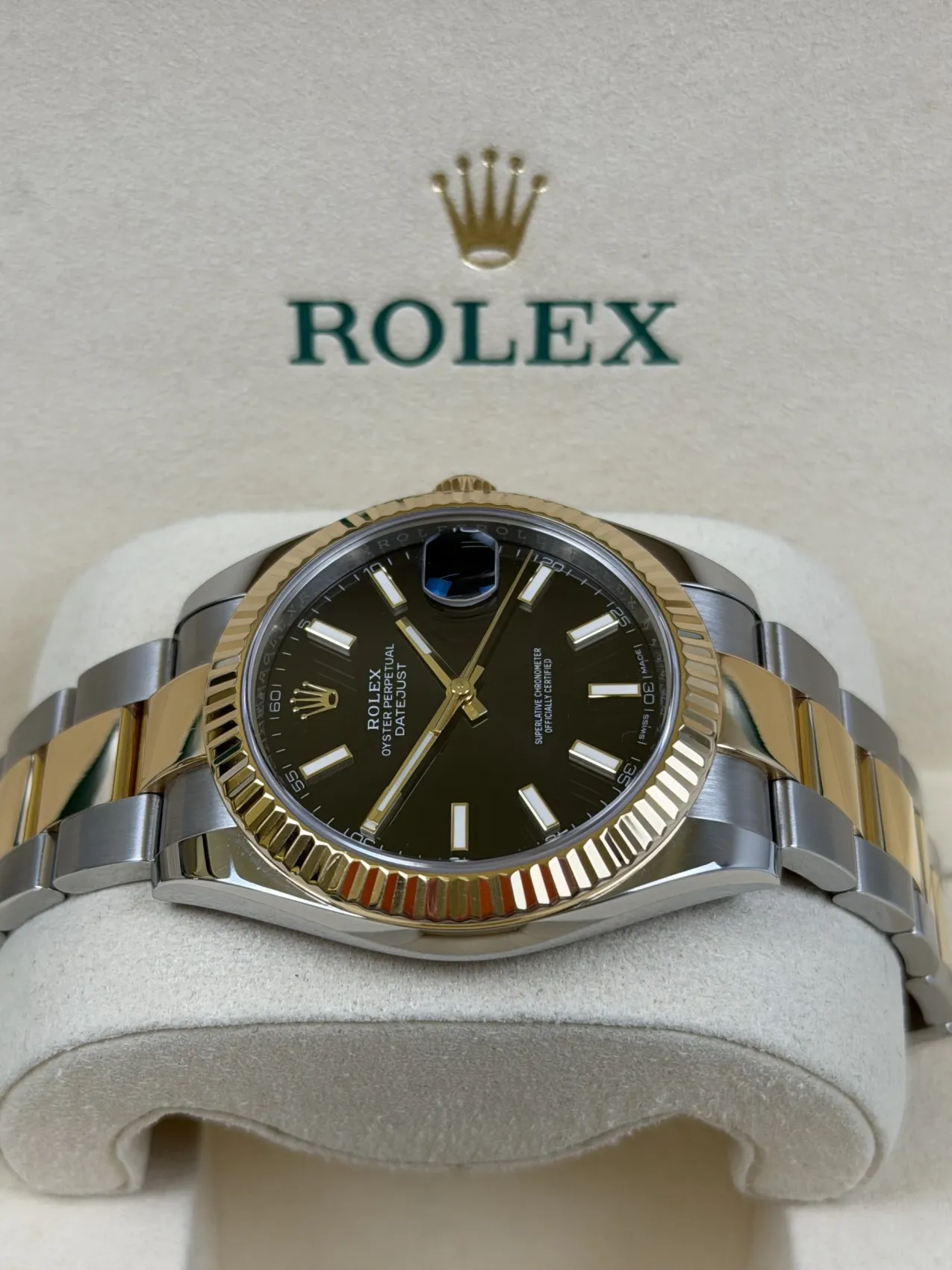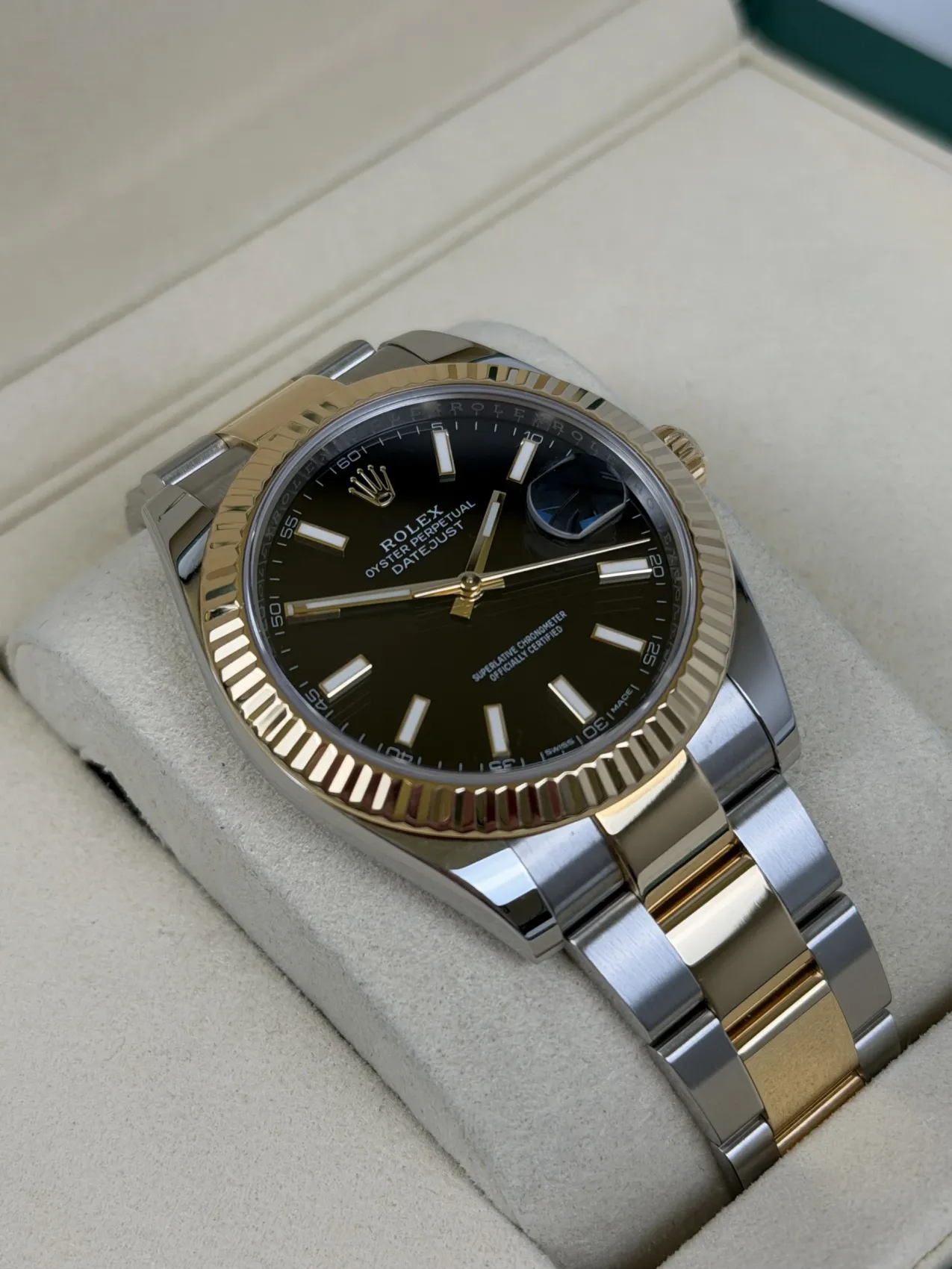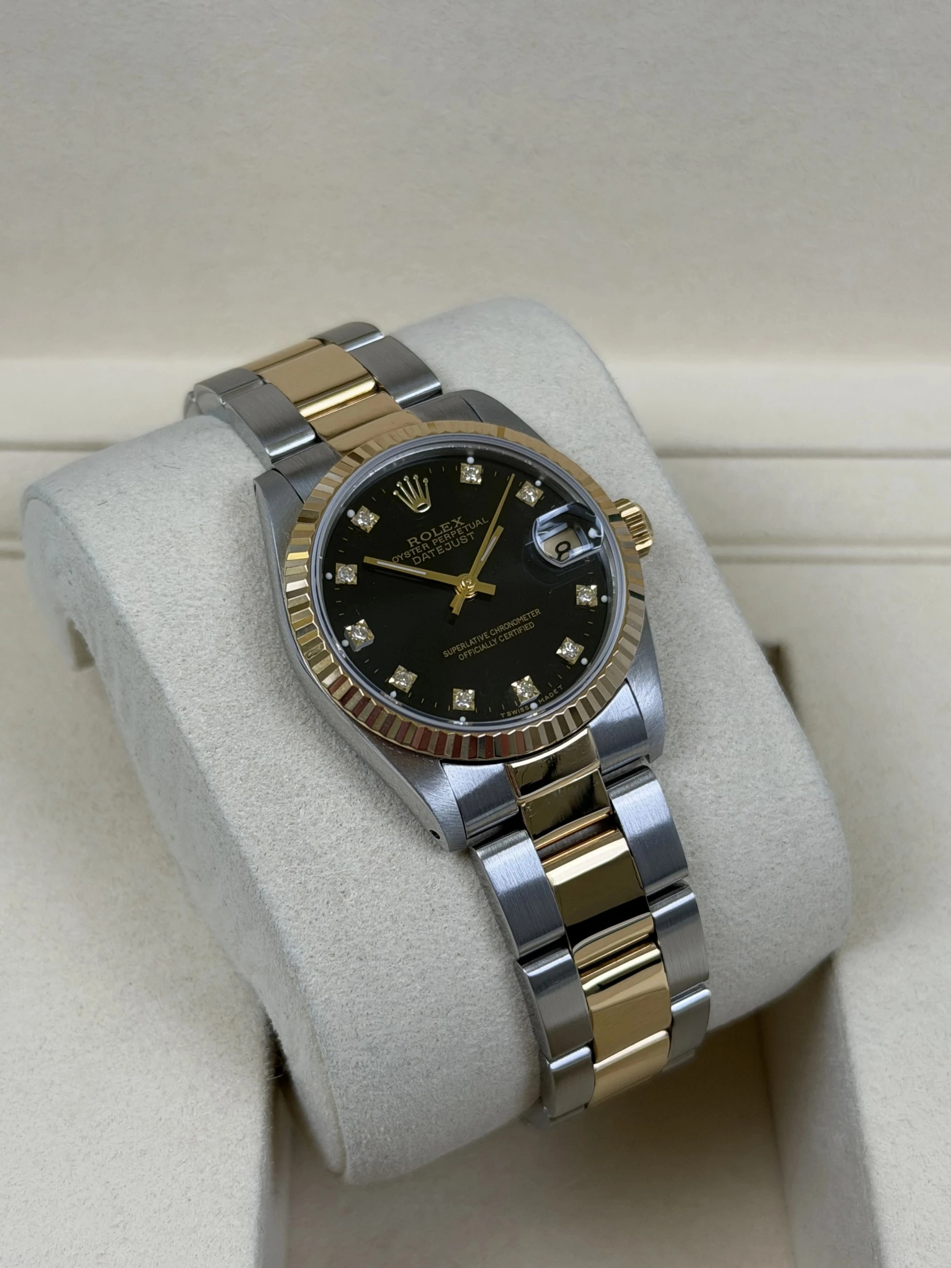 The watch features a striking black dial with luminous hour markers, paired with the steel and yellow gold Oyster case and matching Oyster bracelet. Powered by the Rolex Calibre 3235 automatic movement, it delivers enhanced accuracy, a longer power reserve and the refined performance expected from the latest generation of Datejust models.