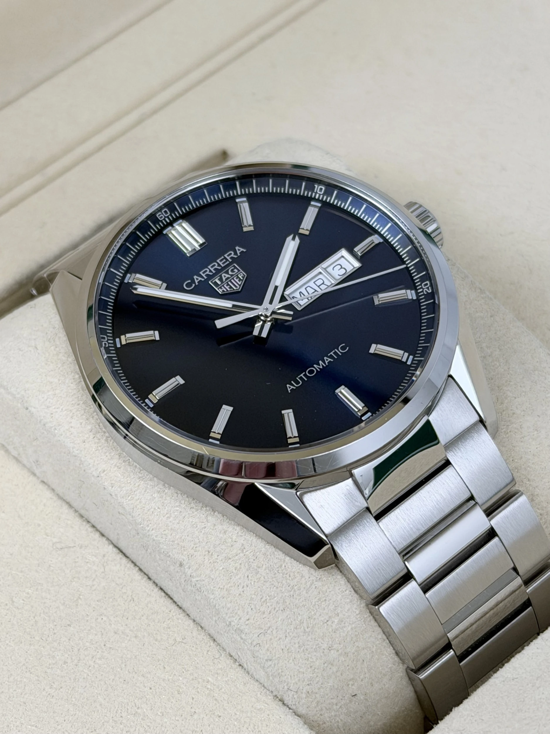 This 2024 TAG Heuer Carrera Day Date reference WBN2012 is a refined stainless steel sports watch, presented as a full set with its original box and papers. A modern evolution of the iconic Carrera line, it is valued for its clean design, everyday versatility and strong Swiss watchmaking heritage.