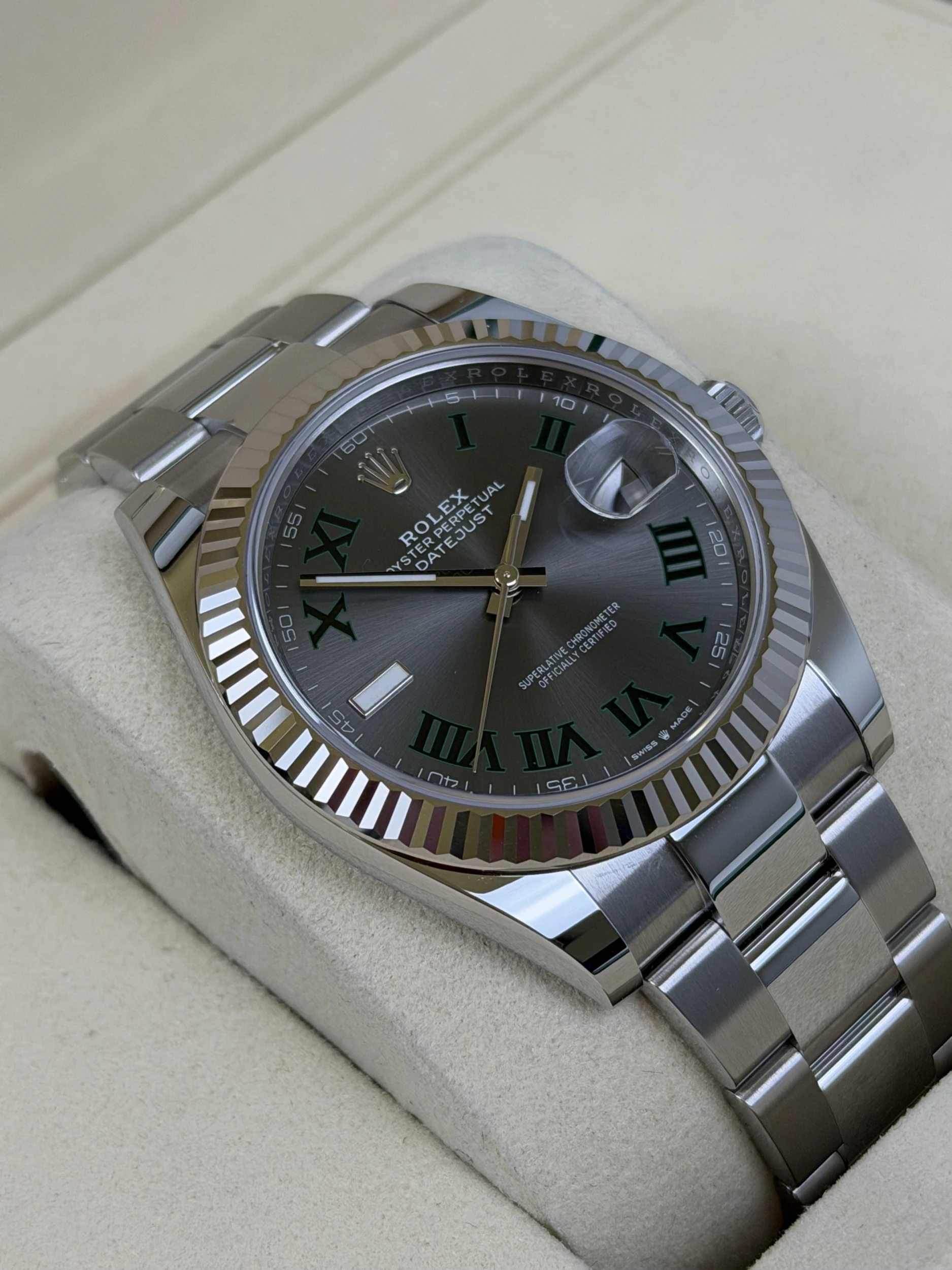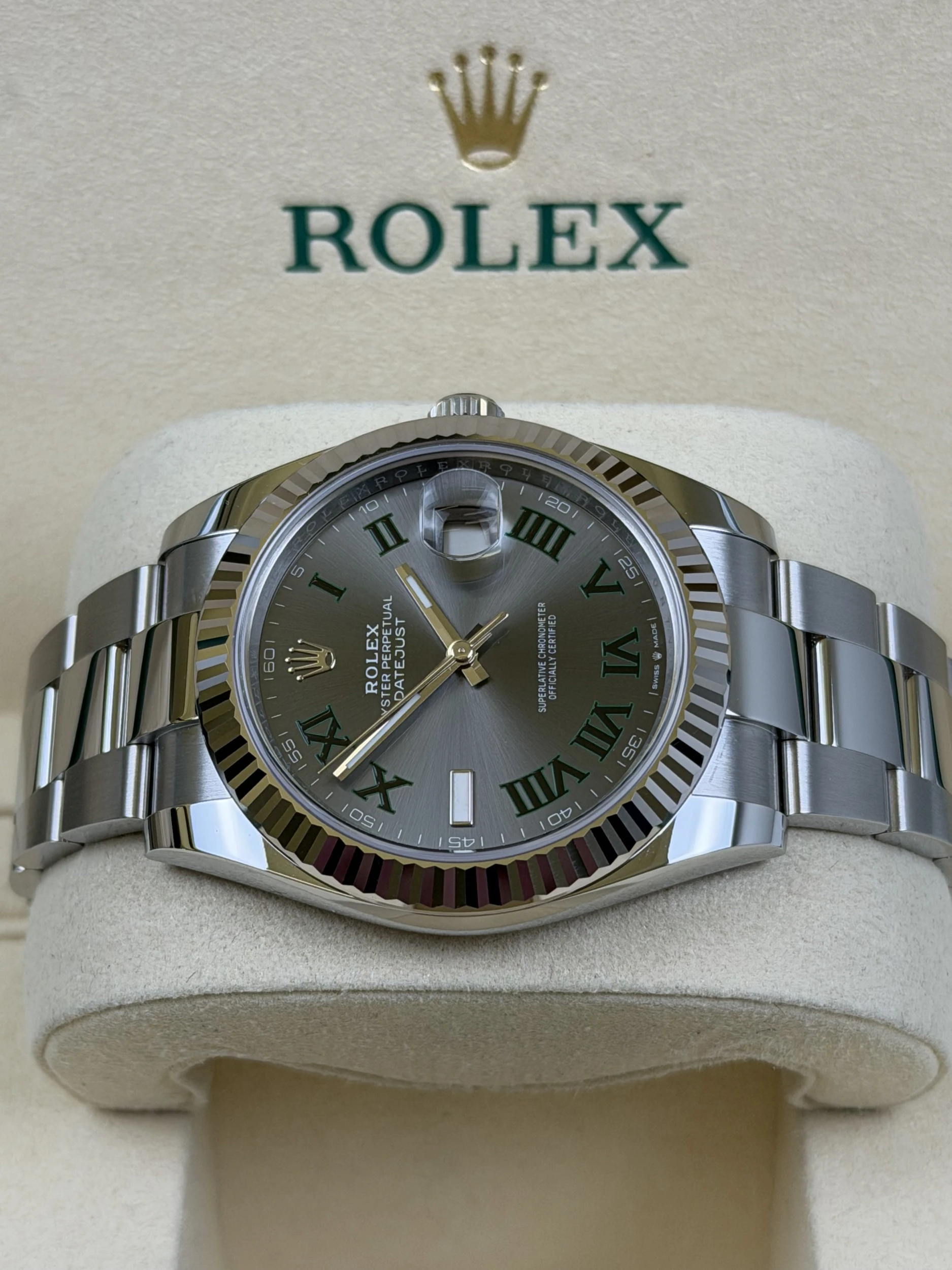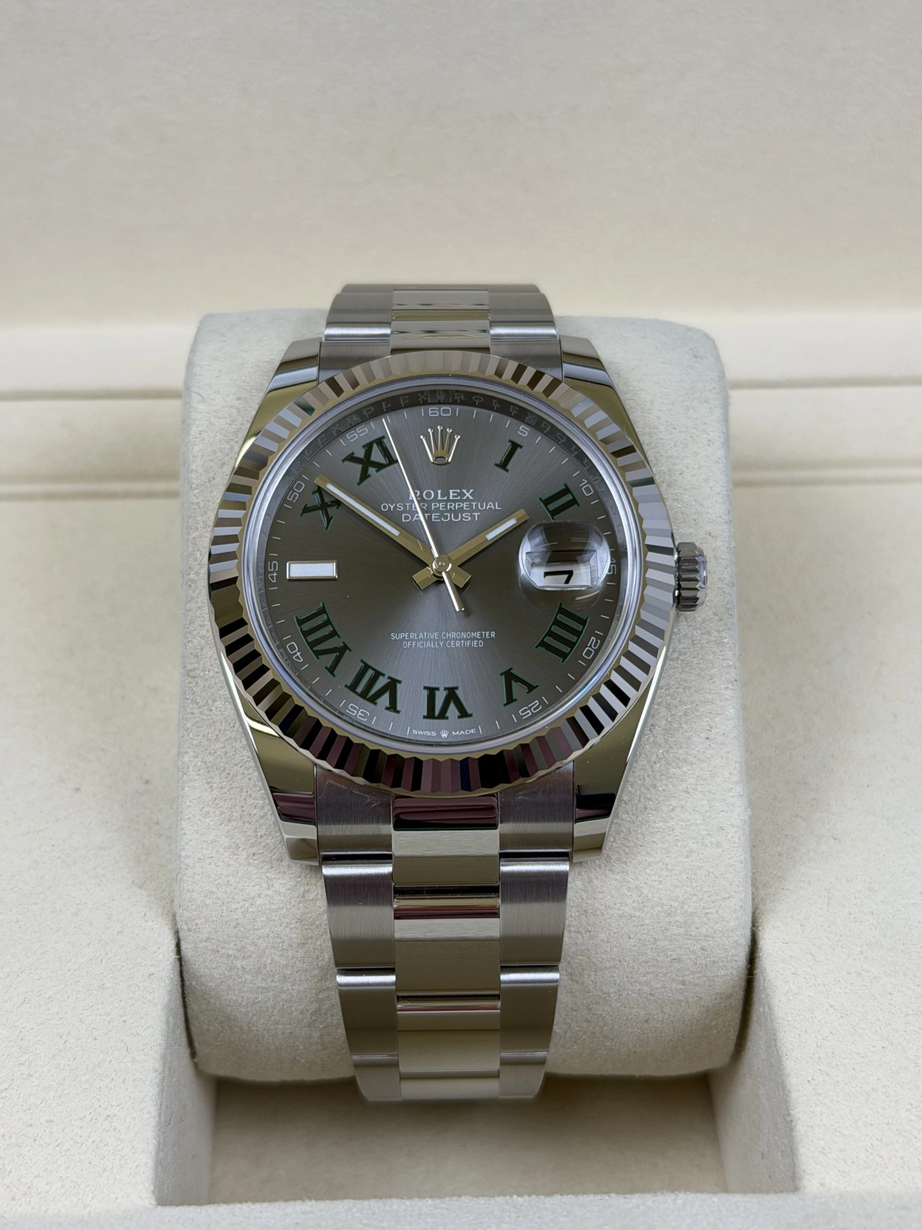 This 2025 Rolex Datejust 41mm reference 126334 is an unworn full set example, crafted in stainless steel and paired with the highly sought-after Wimbledon dial. Supplied with its original Rolex box and papers, it represents one of the most in-demand modern Datejust configurations.