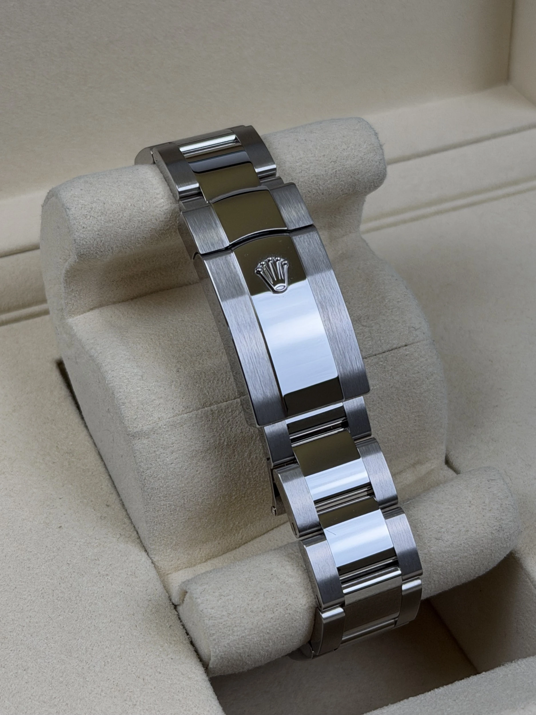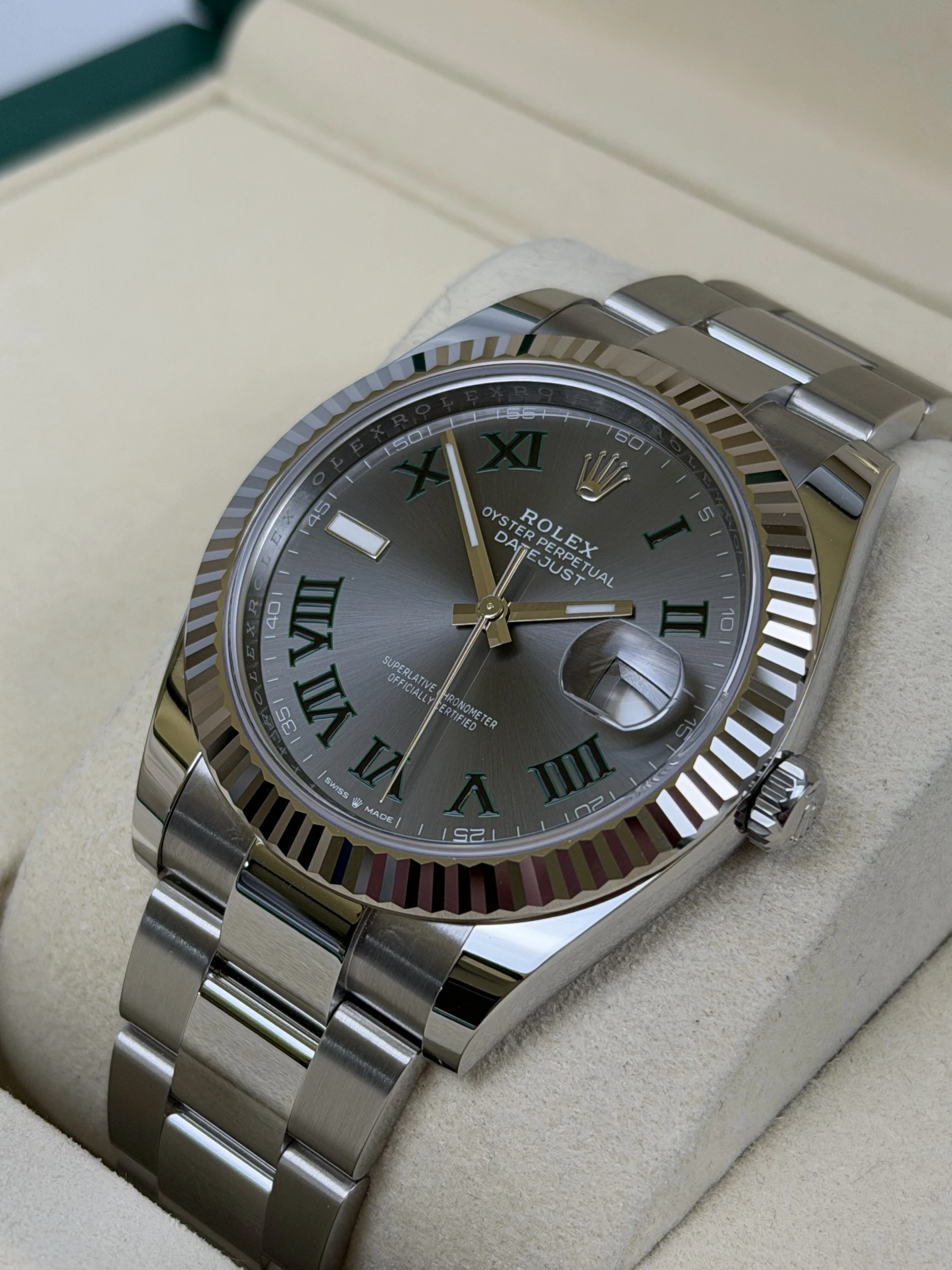 The watch features a 41mm stainless steel Oyster case, fluted bezel and matching Oyster bracelet, delivering a refined and contemporary aesthetic. Its Wimbledon dial provides a distinctive and instantly recognisable look, while the Rolex Calibre 3235 automatic movement ensures exceptional accuracy, reliability and long-term performance.