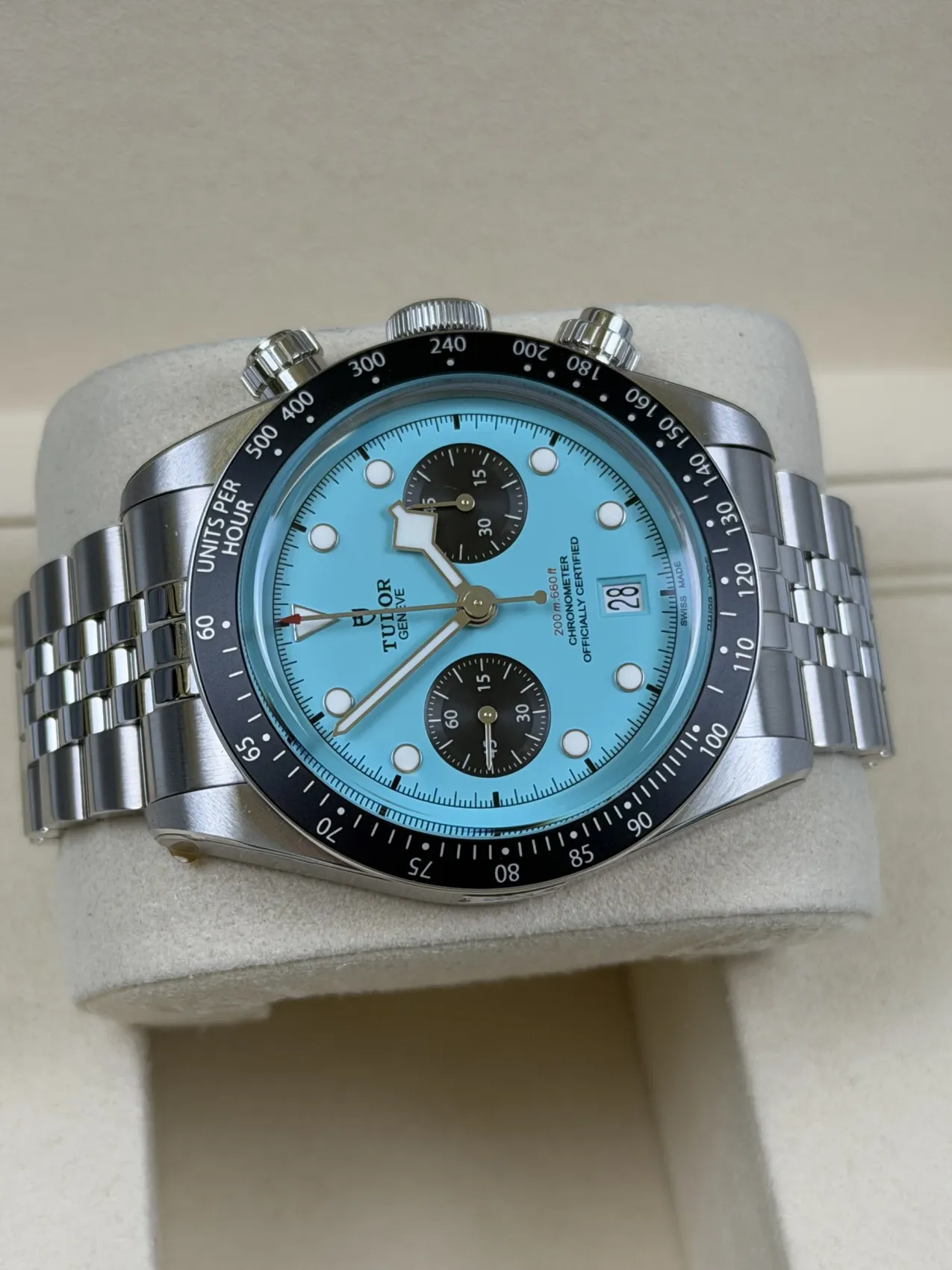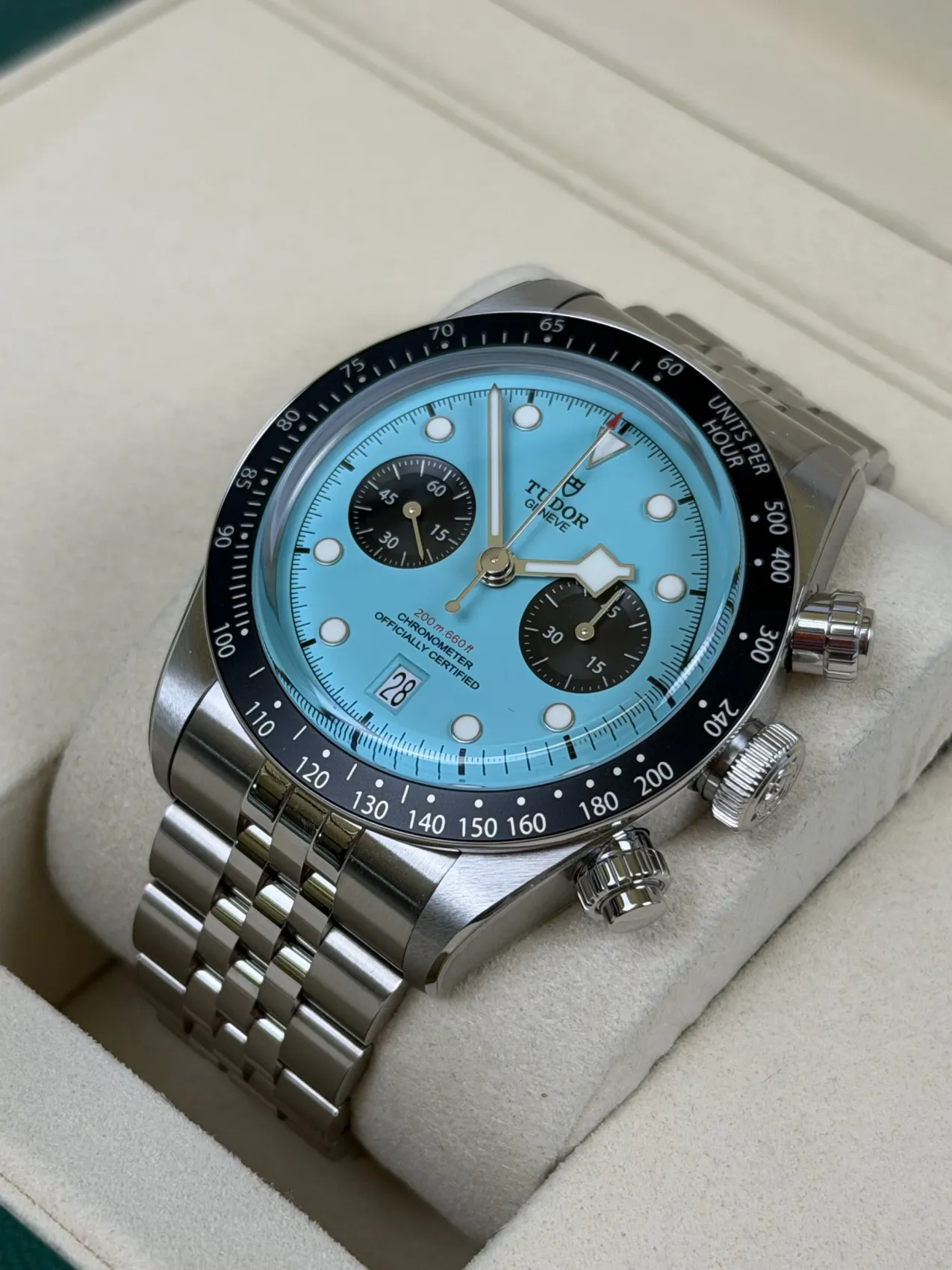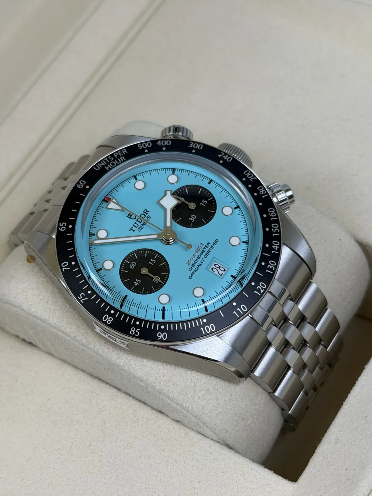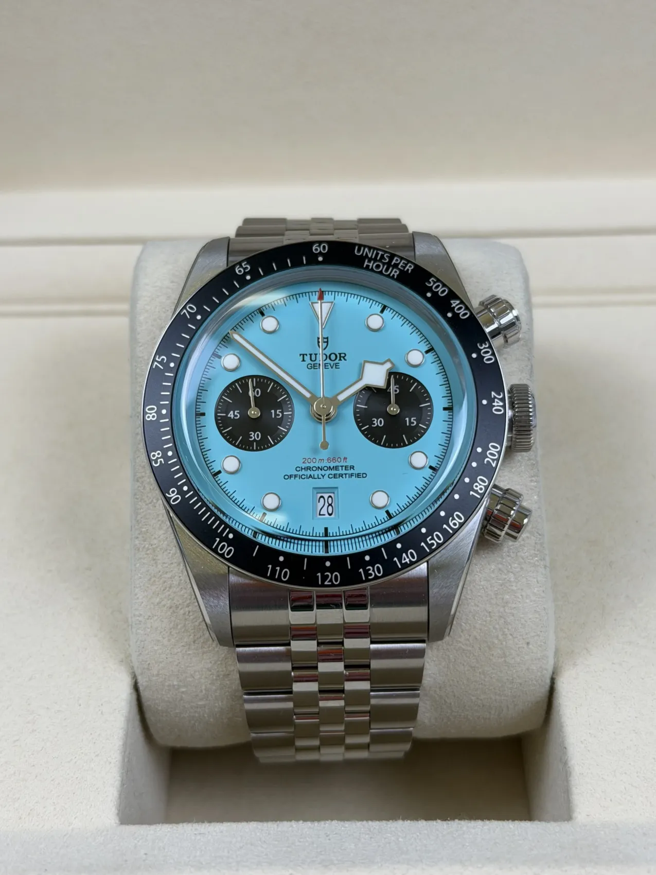 This 2025 Tudor Black Bay Chrono 41mm (79360N) is a striking modern sports chronograph featuring the rare and highly desirable “Flamingo Blue” dial. Crafted in stainless steel with a robust 41mm case, it houses Tudor’s COSC-certified automatic chronograph movement and offers a perfect blend of vintage-inspired design with contemporary performance. This example comes unworn and complete with box and papers, making it an exceptional collector’s opportunity.