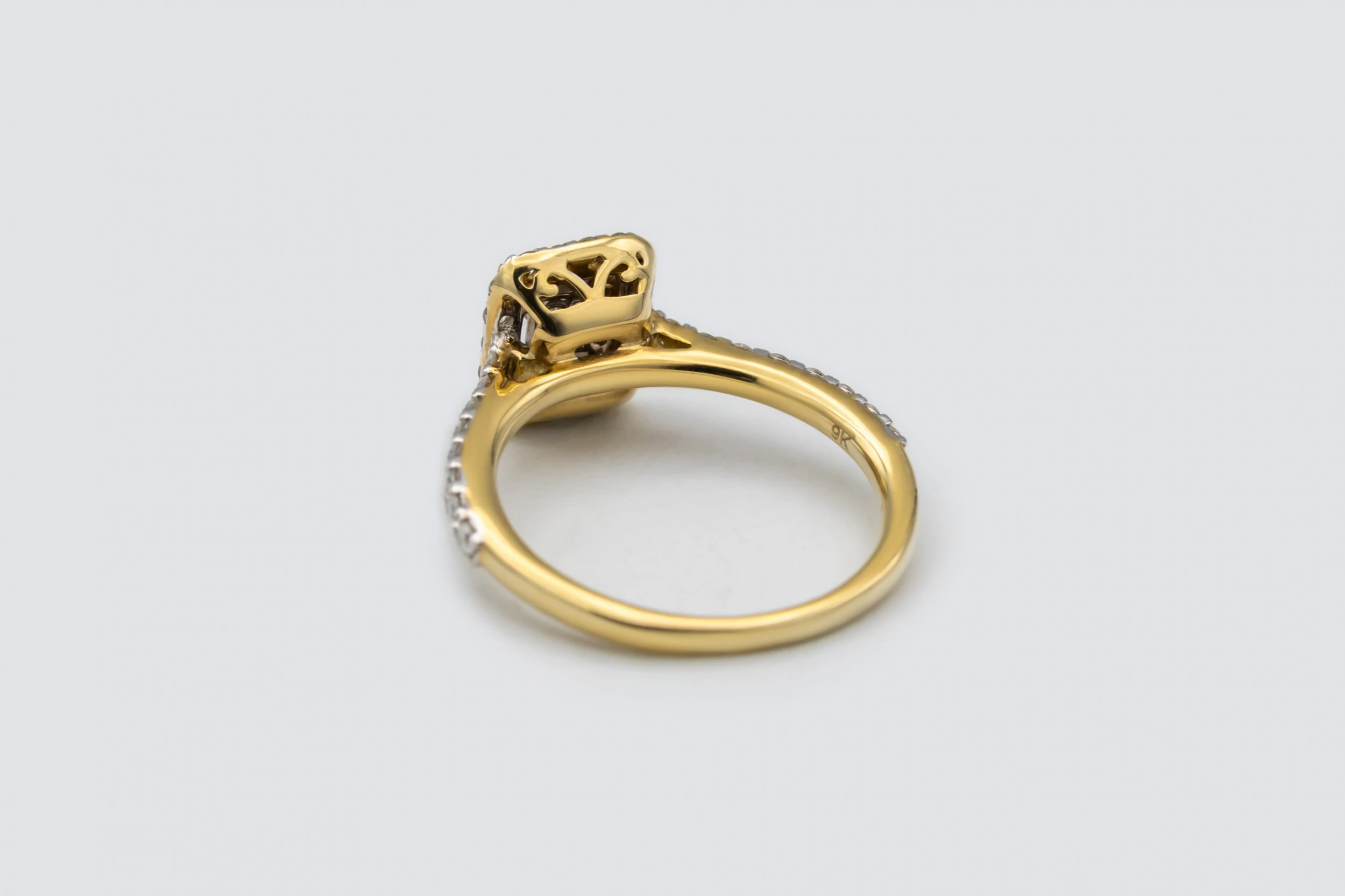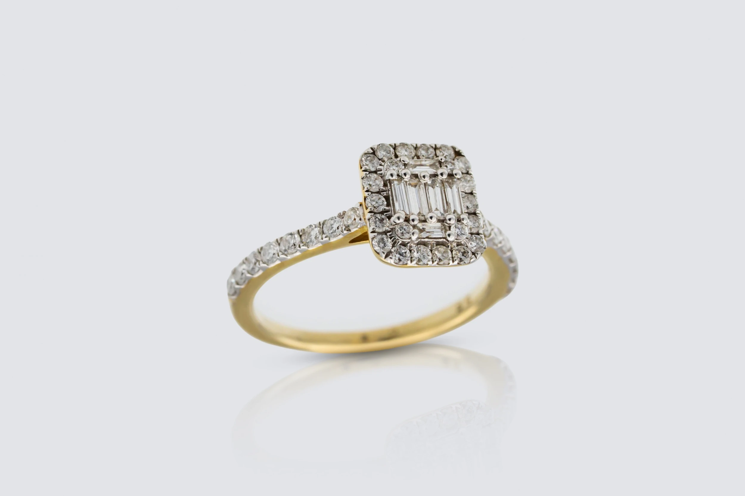 A sophisticated fusion of style and sparkle, this diamond ring combines the linear elegance of baguette cut natural diamonds with the radiant brilliance of round cut stones, totalling 0.61ct. Each diamond, graded G colour and SI2 clarity, is perfectly set in luminous 9ct yellow gold, creating a refined balance between structure and light.
