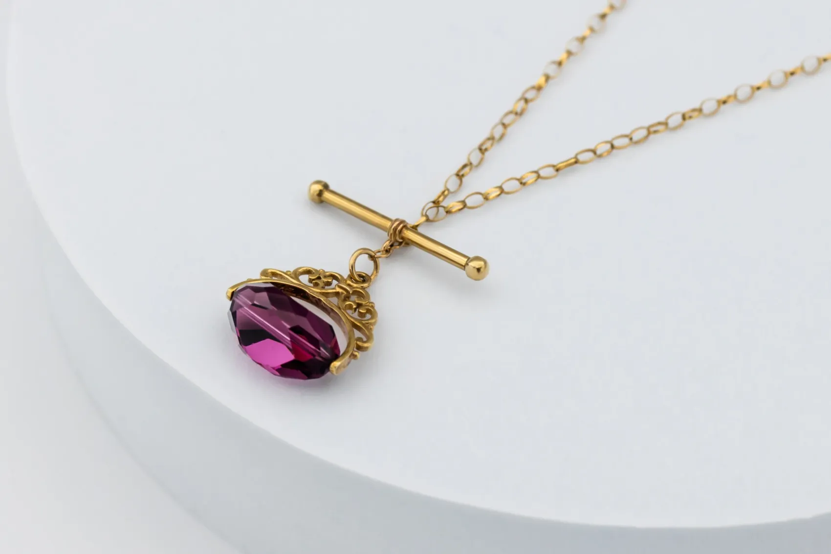 A refined and stylish design, this amethyst pendant necklace features a richly coloured natural amethyst suspended from a polished 9ct yellow gold chain, finished with a classic T-bar detail for a modern, elegant touch. The warm gold tones beautifully complement the deep purple of the gemstone, creating a sophisticated yet versatile piece perfect for everyday wear or layering.