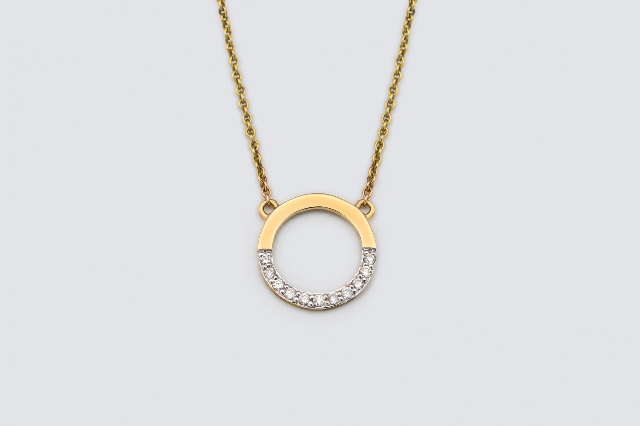 A refined and modern classic, this diamond circle pendant necklace features natural brilliant round diamonds beautifully set along a polished 9ct yellow gold circle, symbolising eternity, unity, and timeless elegance. Suspended from a sleek 9ct yellow gold cable link chain, the pendant offers a clean, minimalist silhouette with a sparkling finish that catches the light effortlessly.