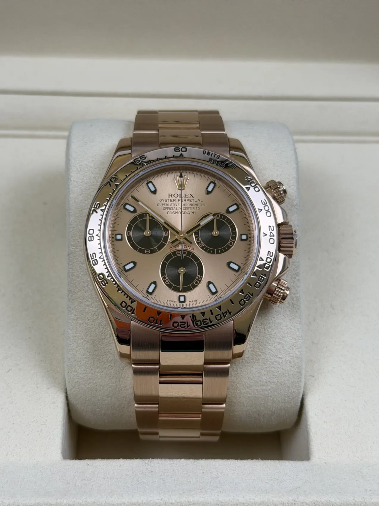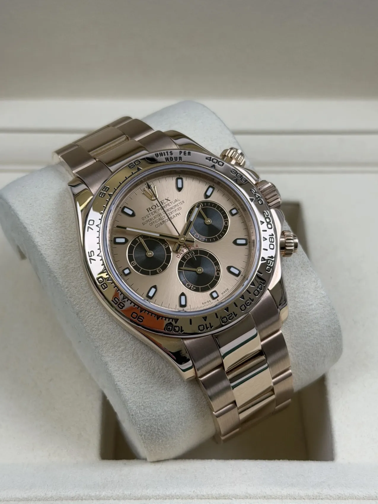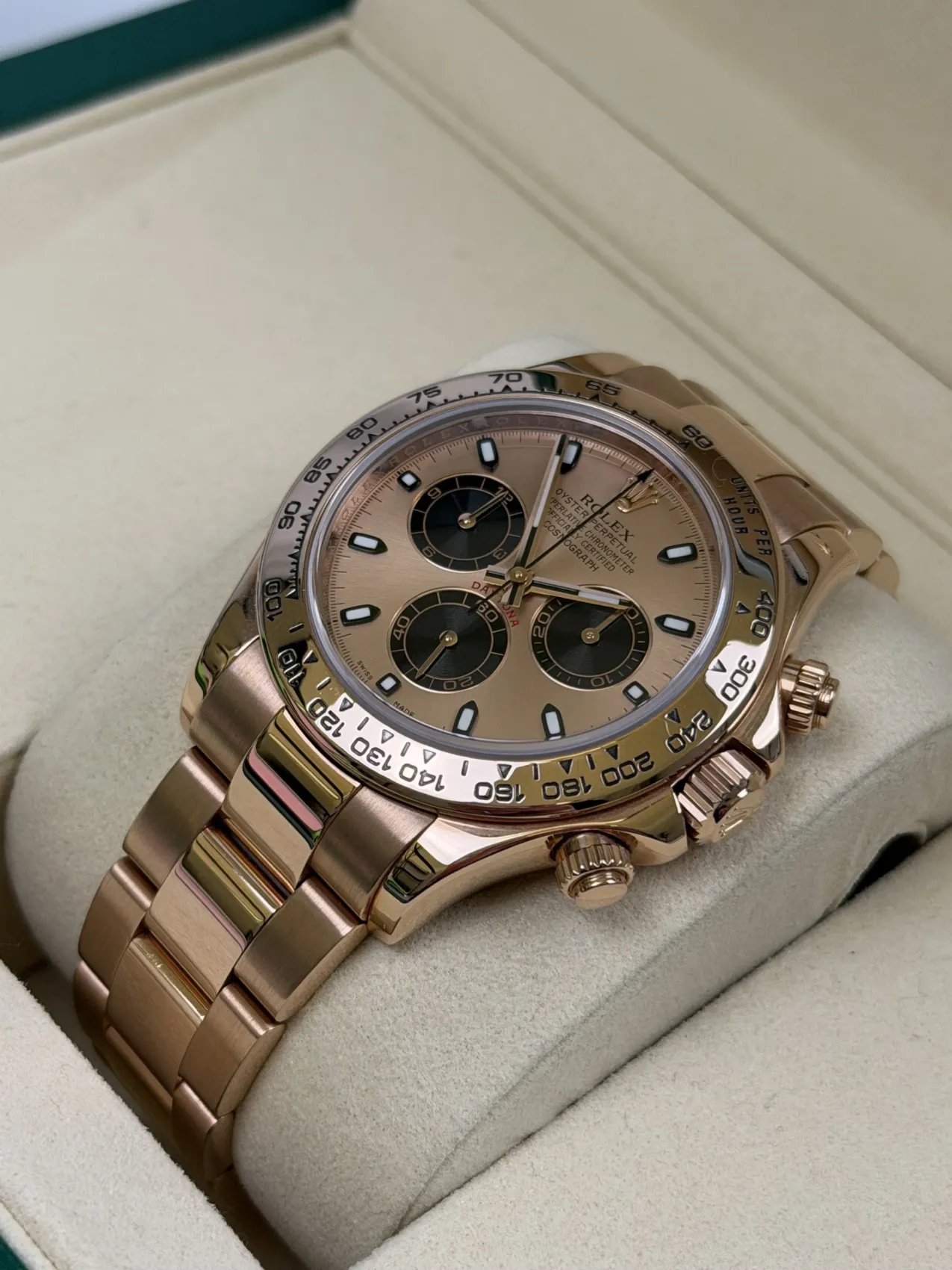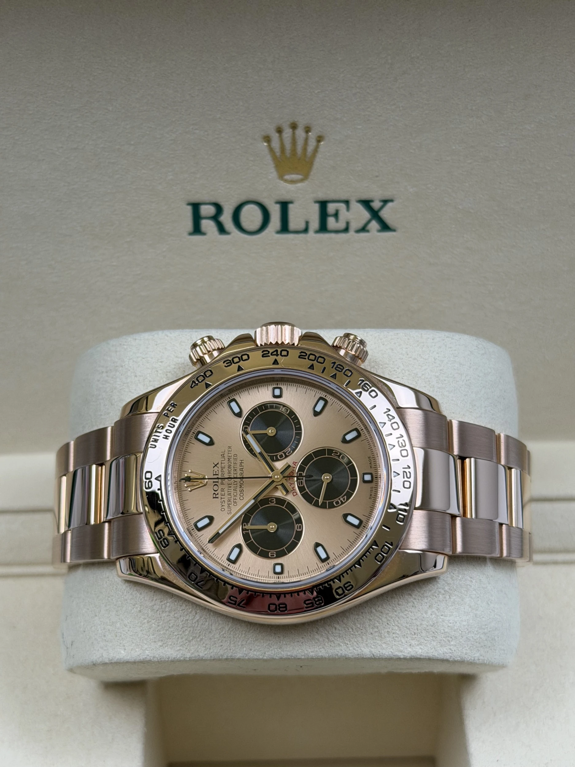 The 116505 stands out as one of the most elegant full-gold Daytona references, admired for its warm Everose tones, balanced proportions and strong presence within the modern Daytona lineup. Its sundust dial configuration is particularly sought after, offering a refined and contemporary aesthetic that appeals to collectors and enthusiasts alike.