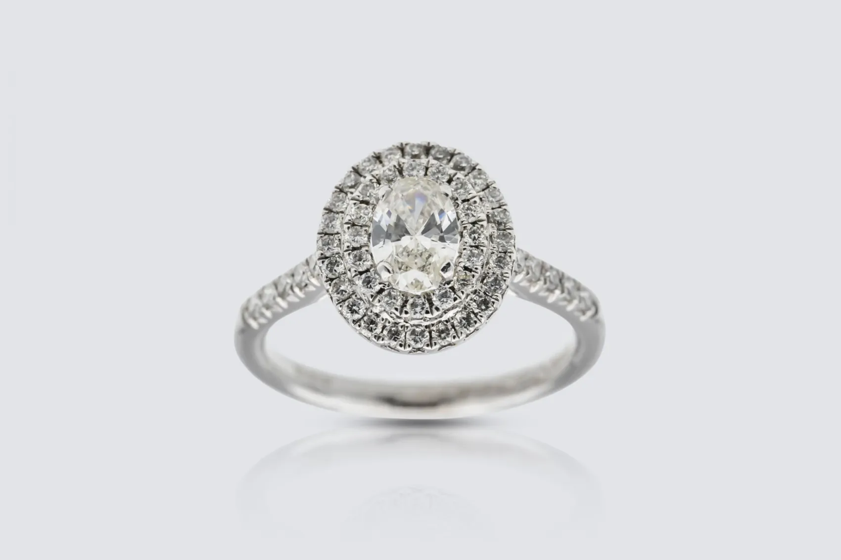 The double halo design adds depth and radiance, enhancing the central diamond’s soft oval shape with layers of refined sparkle. Sophisticated yet timeless, this ring embodies the meticulous craftsmanship and elegant aesthetic that define AMPM Luxury Goods.