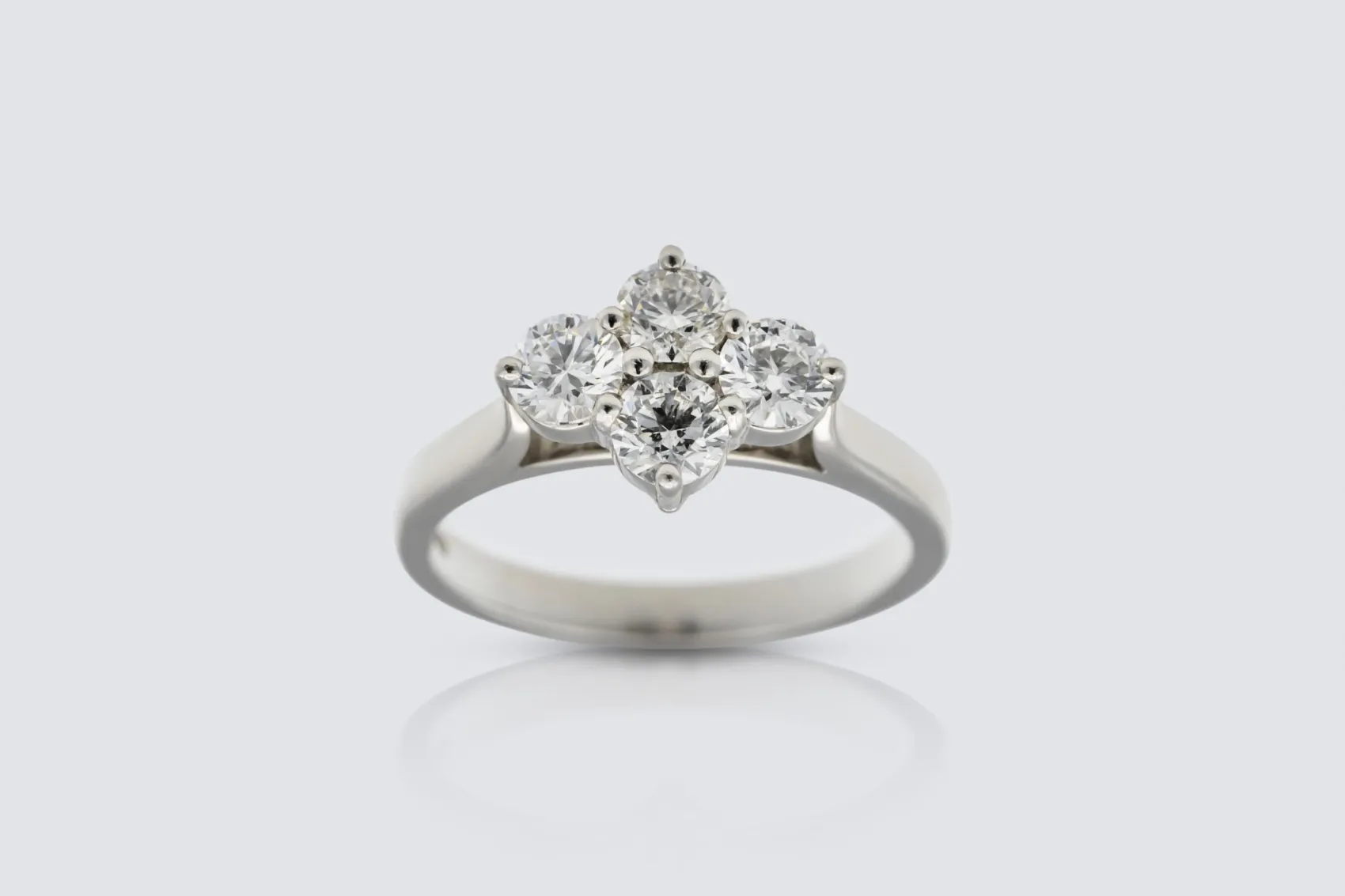 A refined celebration of brilliance and balance, this four stone diamond ring features four natural brilliant cut diamonds, each weighing 0.25ct, for a total of 1.00ct. The stones, graded F to G colour and SI clarity, are claw set in sleek platinum, creating a luminous display of light and symmetry.