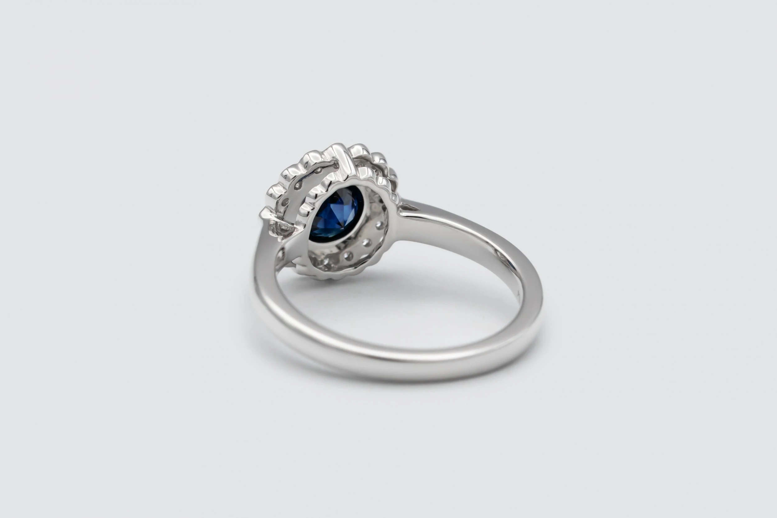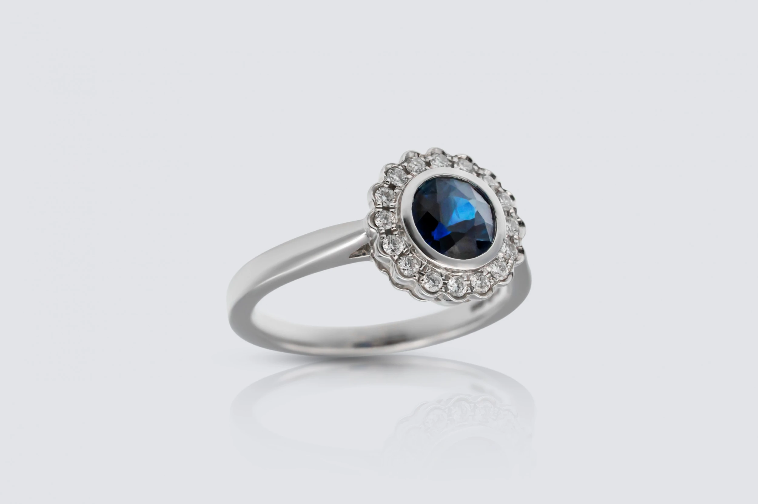 A timeless and elegant design, this sapphire and diamond cluster ring features a captivating 1.00ct natural sapphire surrounded by 0.16ct of natural brilliant round diamonds, all set in a smooth rubover setting crafted from polished platinum. The rich blue sapphire serves as the striking centrepiece, while the surrounding diamonds enhance its depth and brilliance with refined sparkle.